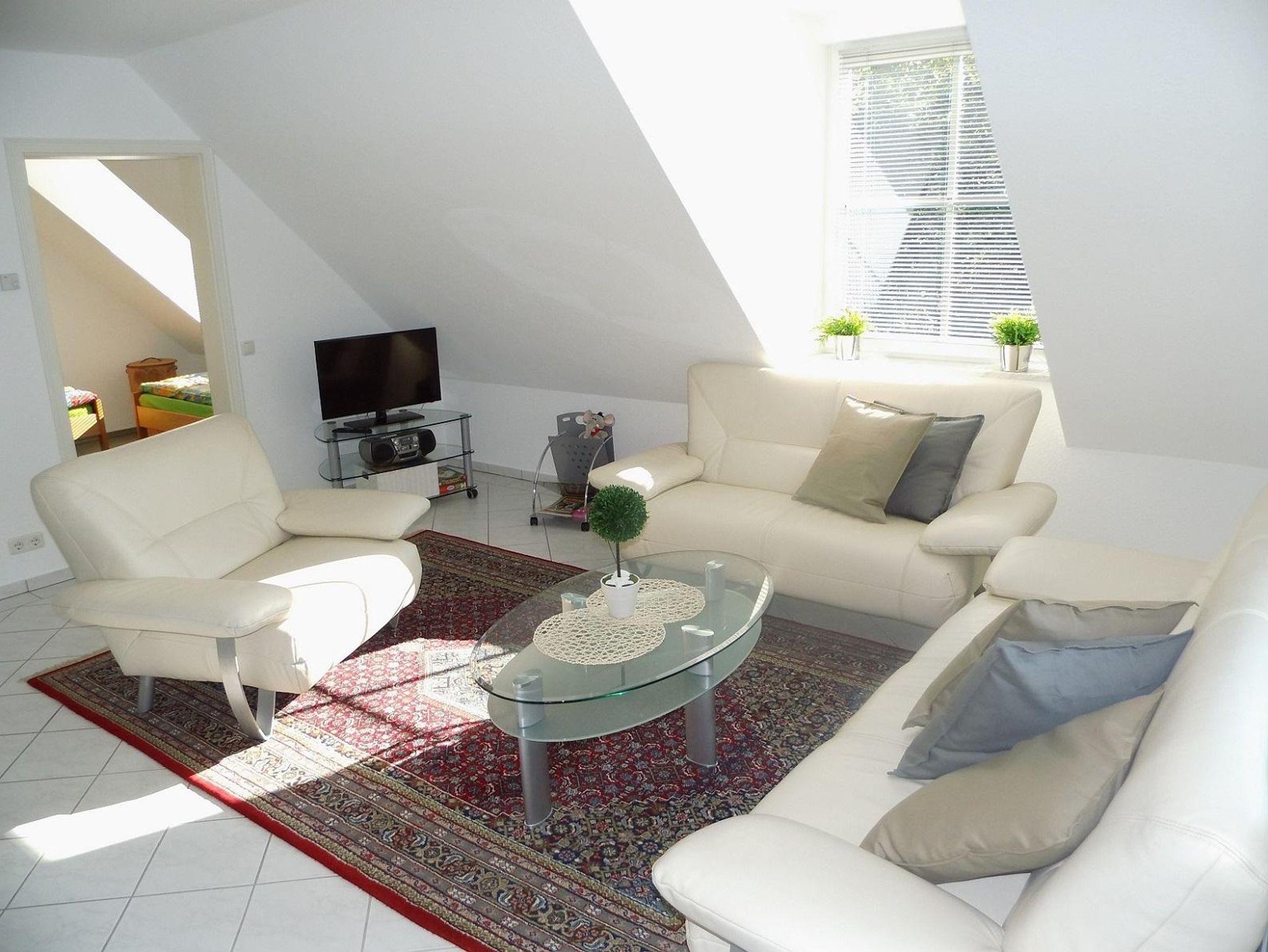 - Wohnzimmer (Fernseher mit Satellitenanschluß, Radio, Ledercouchgarnitur und Essecke)