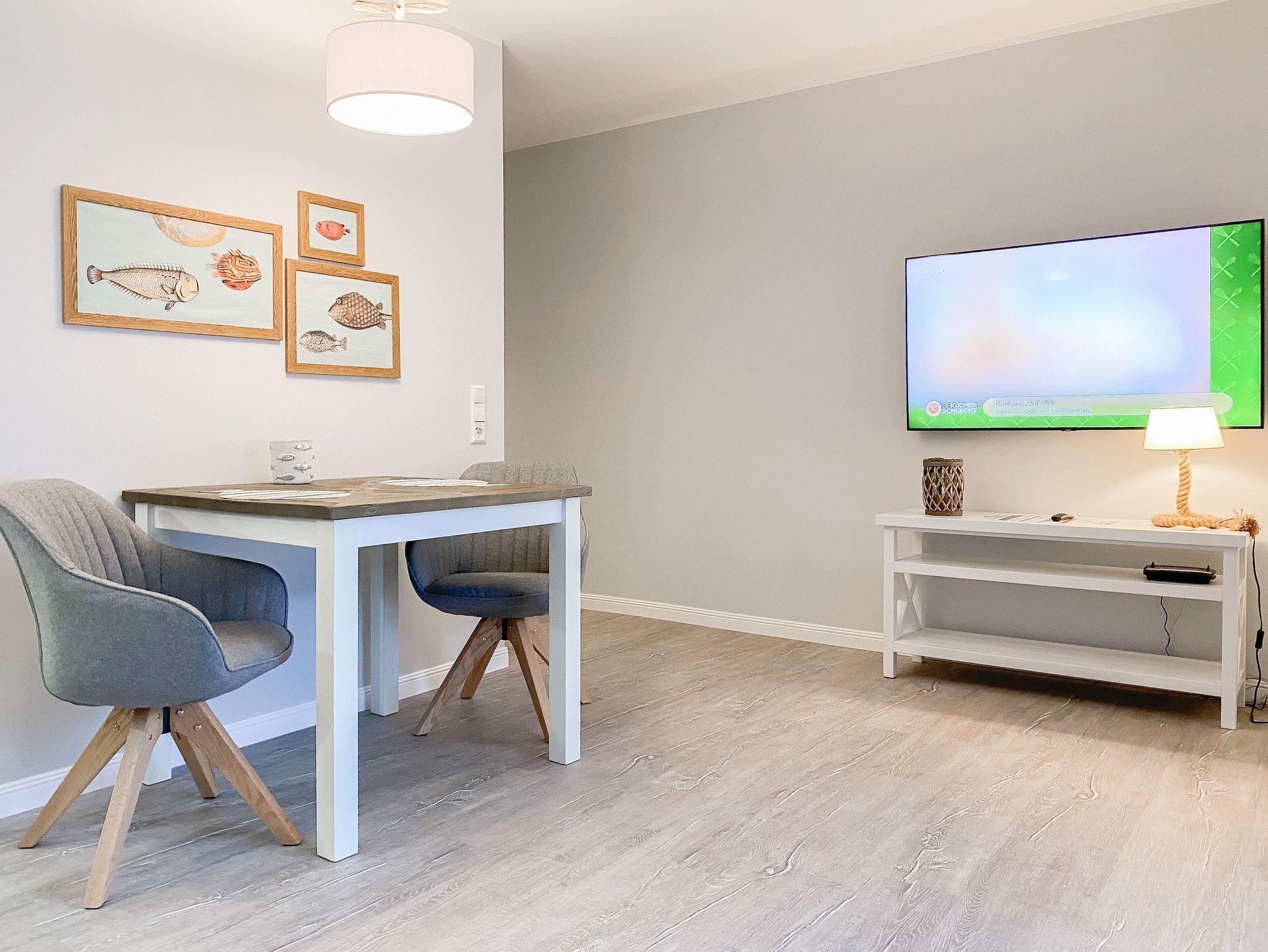 Die Ferienwohnung im 2. Obergeschoss ist hervorragend für[nbsp] 2 Personen geeignet und besticht durch ihr durchdachtes Raumkonzept. Es erwartet Sie ein gemütlicher Wohnbereich mit einem hochwertigen Sofa mit Schlaffunktion (140x190), ein anschließender Essbereich für 2 Personen und eine offene Designküche in bester Ausstattung. Eine liebevoll ausgesuchte Inneneinrichtung und die perfekt darauf abgestimmten Dekorationselemente im Beachstyle laden zum Wohlfühlen in Strandnähe ein. Der teilweise überdachte Sonnenbalkon, ausgestattet mit hochwertigen Gartensesseln mit verstellbarem Rückenteil und Fußhocker, bietet einen schönen Teilseeblick, Meeresrauschen inklusive. Im Schlafzimmer befindet sich ein hochwertiges Boxspringbett, das Ihnen mit einer Größe von 180 x 200 einen hohen Schlafkomfort verspricht und die Fenster sind mit elektrischen Außenjalousien versehen. Der offene Einbauschrank ist großzügig bemessen und bietet ausreichend Stauraum für Ihre Urlaubsgarderobe. Das moderne Duschbad empfängt Sie in einem fröhlichbunten Innendesign und der Handtuchwärmer sorgt für zusätzlichen Komfort. Sowohl ein großer Flatscreen-TV im Wohnzimmer als auch die kostenlose Nutzung des WLAN gehören zum Entertainment-Paket. Ein Aufzug ist selbstverständlich vorhanden.