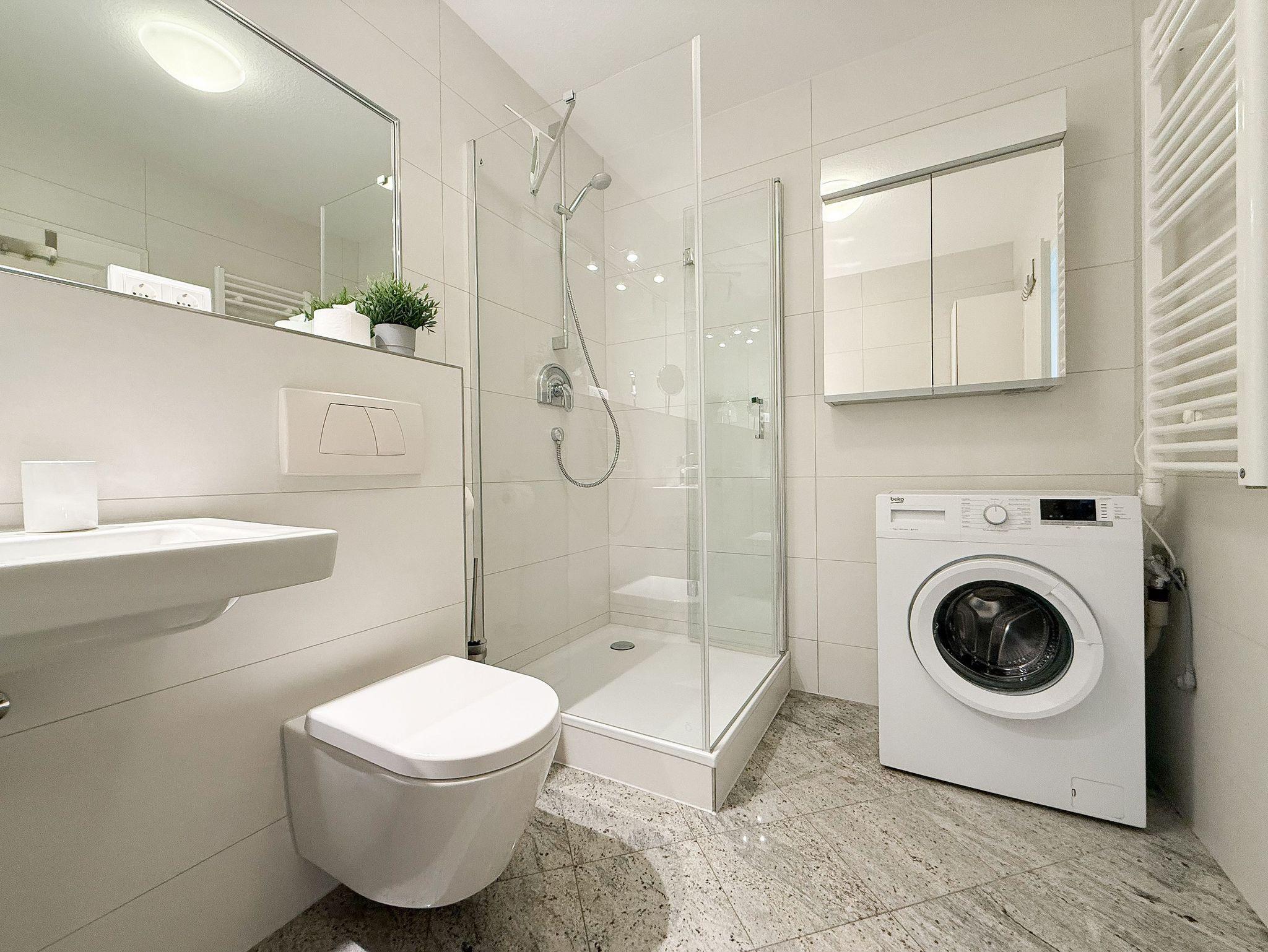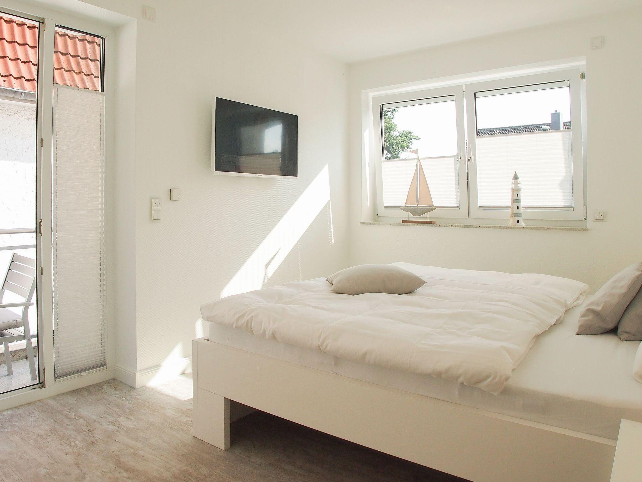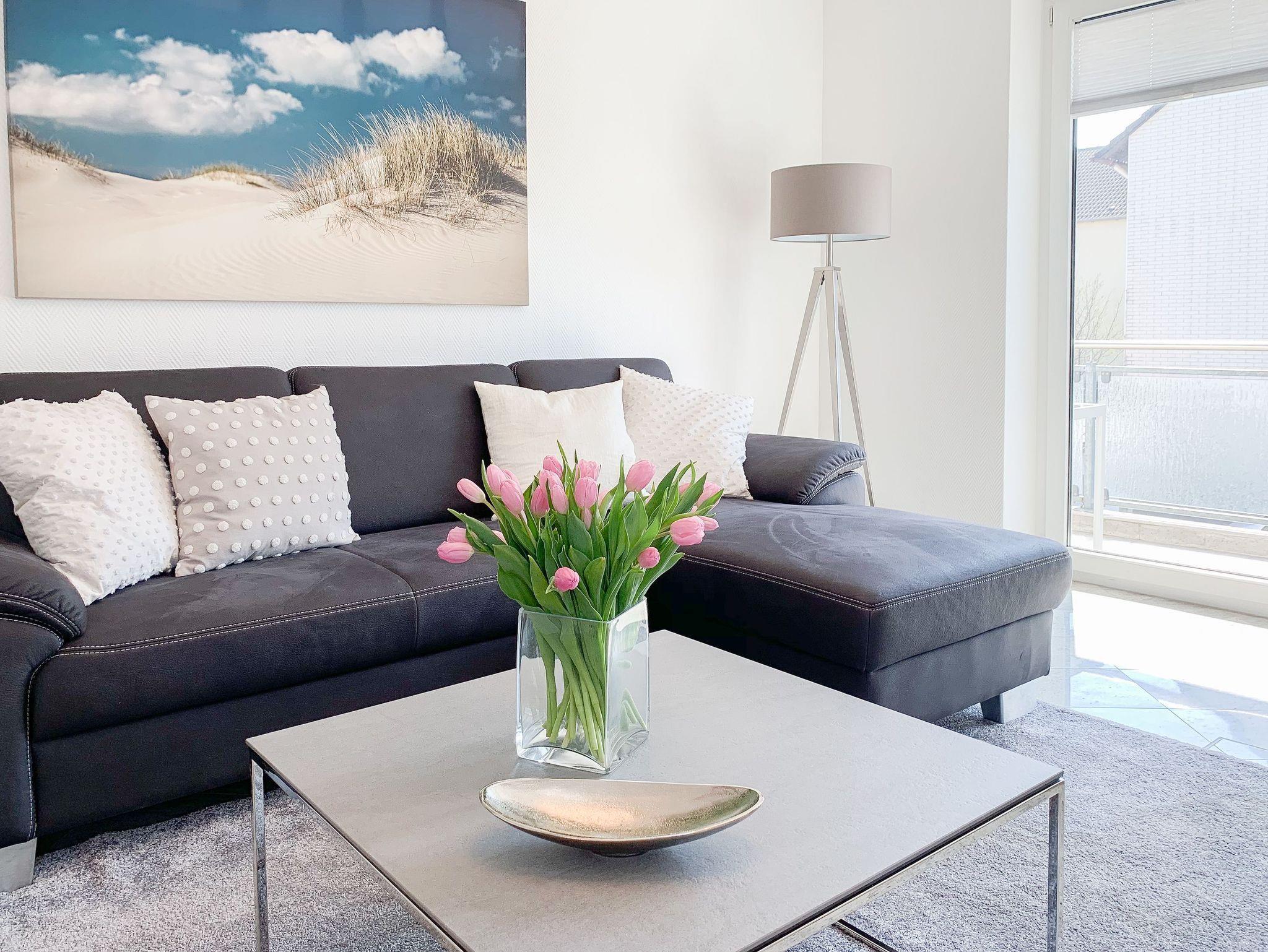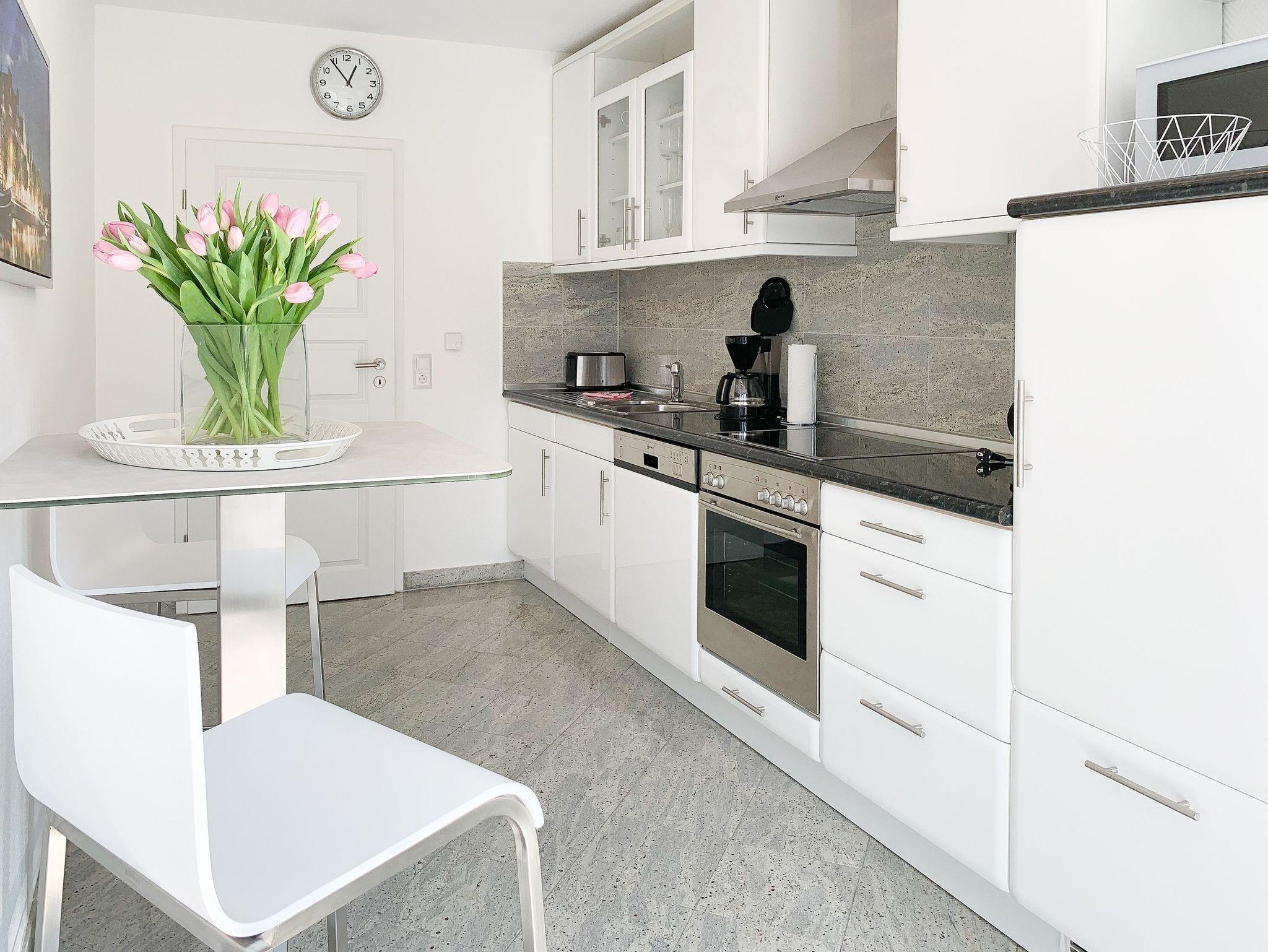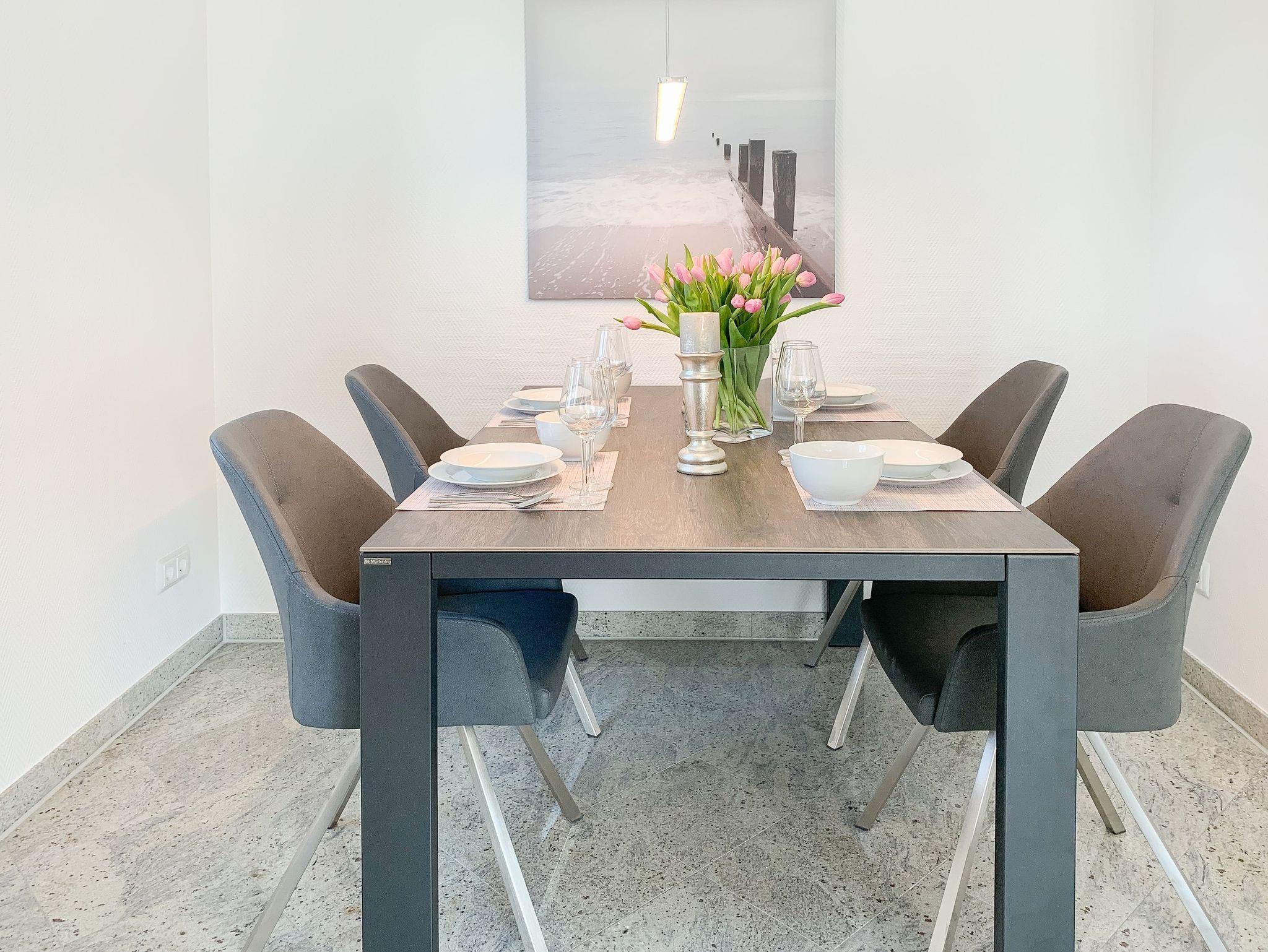 Mittelpunkt der Ferienwohnung ist der großzügige, geschmackvoll gestaltete Wohnbereich mit angrenzendem Essbereich, der 4 Personen ausreichend Platz bietet. TV, Radio, Bose Bluetooth Lautsprecher und kostenloser Internetzugang über WLAN sind selbstverständlich vorhanden. Die moderne, abgeschlossene Küche ist bestens ausgestattet und verfügt über alle technischen Geräte. Ein Bartisch mit zwei Stühlen dient als zusätzlicher Frühstücksbereich oder als Treffpunkt für gemeinsames Kochen. Zwei separate Schlafzimmer liegen[nbsp] ruhig zur straßenabgewandten Seite. Sie sind mit[nbsp] maßgefertigten Einbauschränken und elektrischen Außenjalousien ausgestattet. Das eine Schlafzimmer verfügt über zwei Einzelbetten (90x200), das andere über ein Doppelbett (180x200) und einen zusätzlichen TV. Das Bad ist mit einem weiteren Bluetooth Lautsprecher, Dusche, Waschtisch, WC, Handtuchwärmer und einer Waschmaschine ausgestattet.