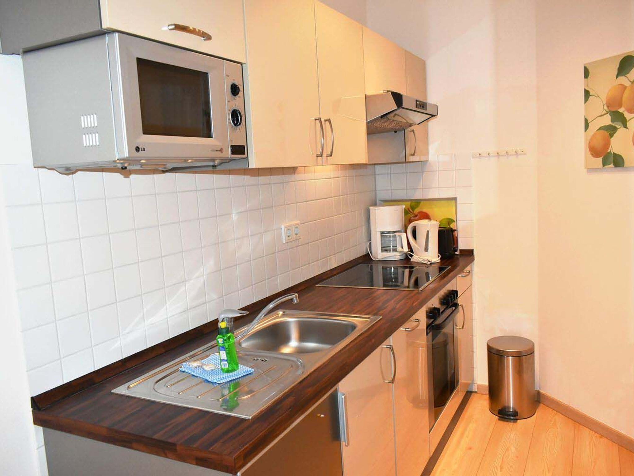 Küche: 4 Plattenherd mit Ceranfeld und Backofen, Besen, Besenschrank, Bügeleisen, Dunstabzugshaube, Geschirr, Kaffeemaschine, Kochtöpfe, Küchenzeile, Kühlschrank mit Gefrierfach, Mikrowelle, Saftpresse, Spülmaschine, Staubsauger, Toaster, Wasserkocher