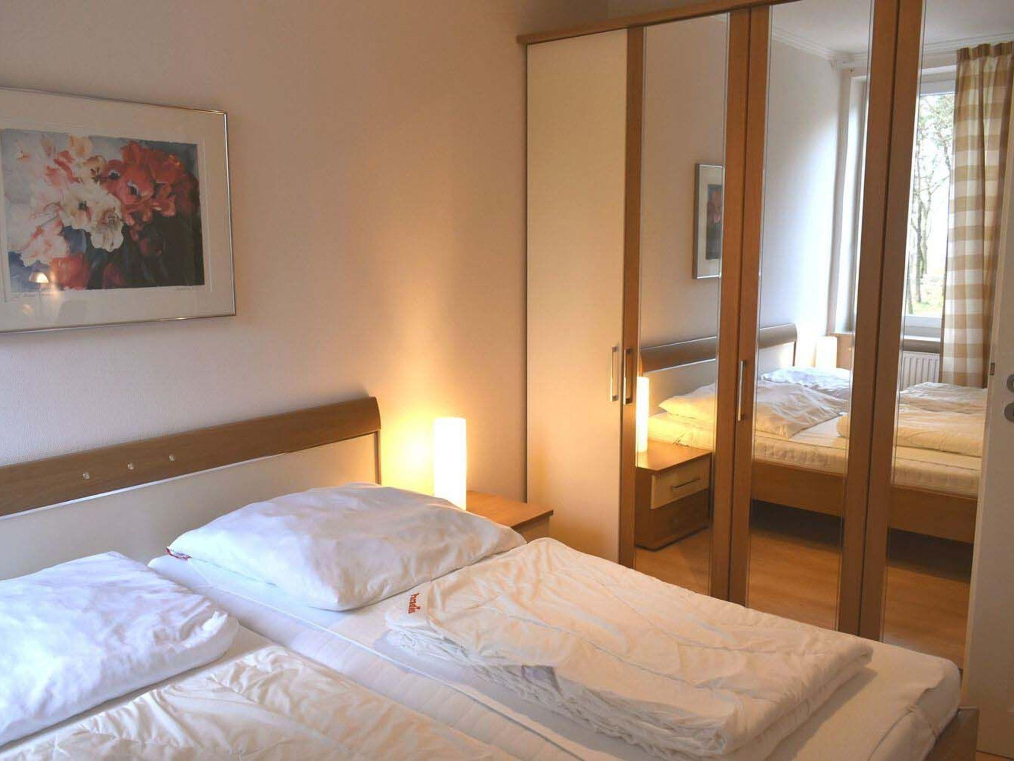 Schlafzimmer 1: 2 Matratzen, 2 Nachttische, 2 Nachttischlampen, Doppelbett 2,00 x 1,80 m, Kleiderschrank, Meerblick, Radiowecker, Spiegel, Verdunklungsstores, Wäscheständer