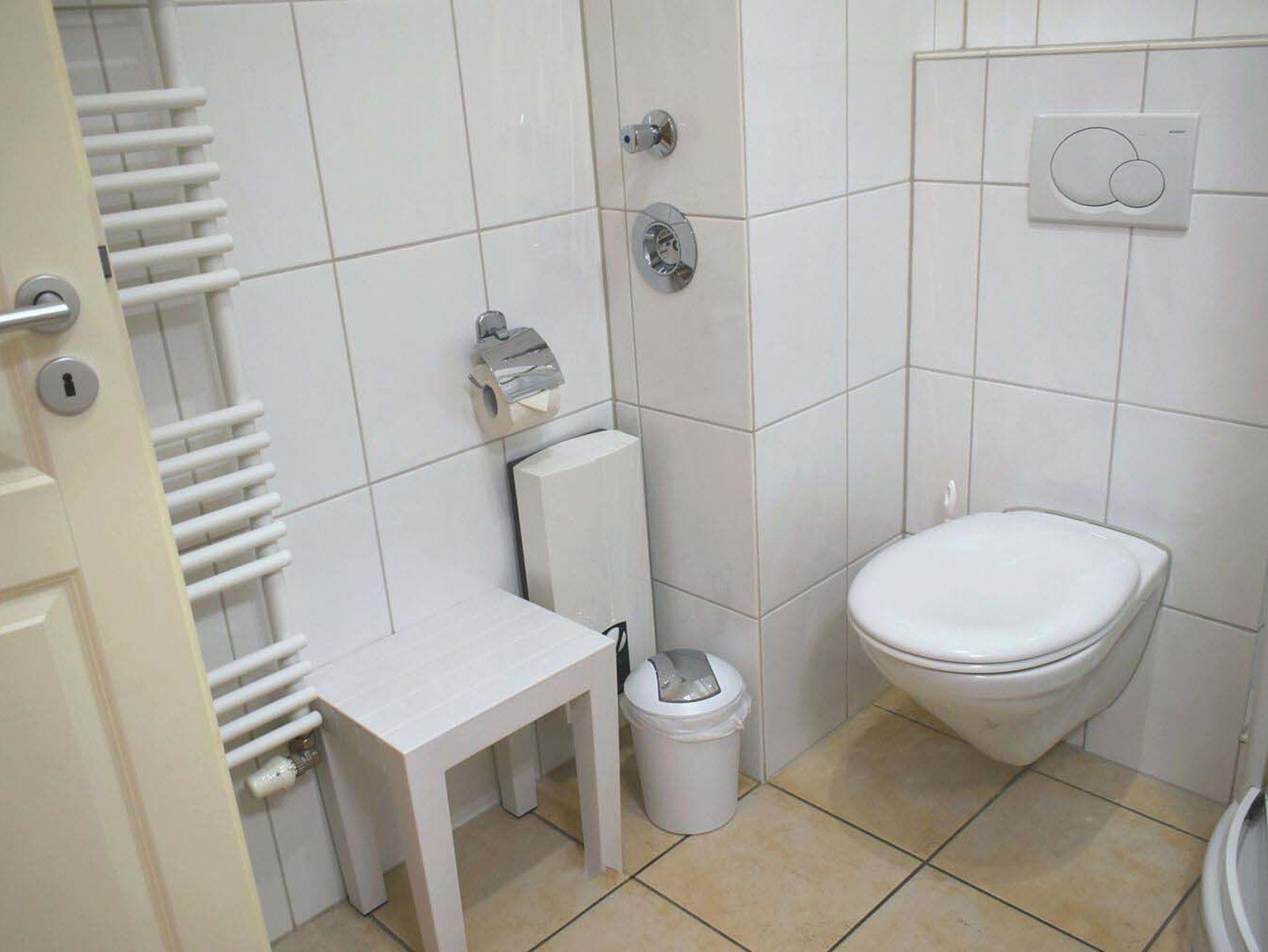 Bad 1: Dusche, Duschkabine, Fön, Hocker, Spiegelschrank, Waschtisch, WC