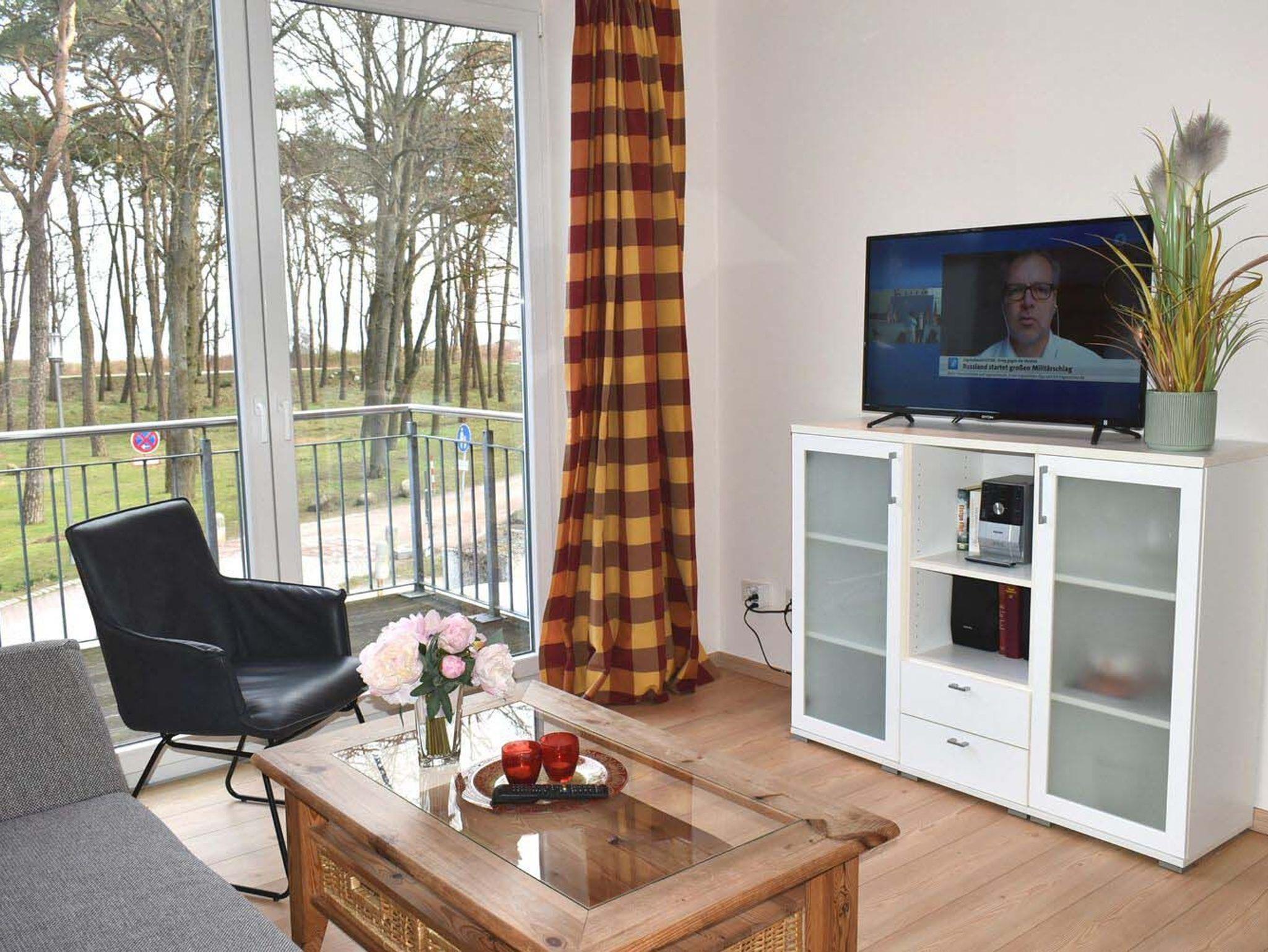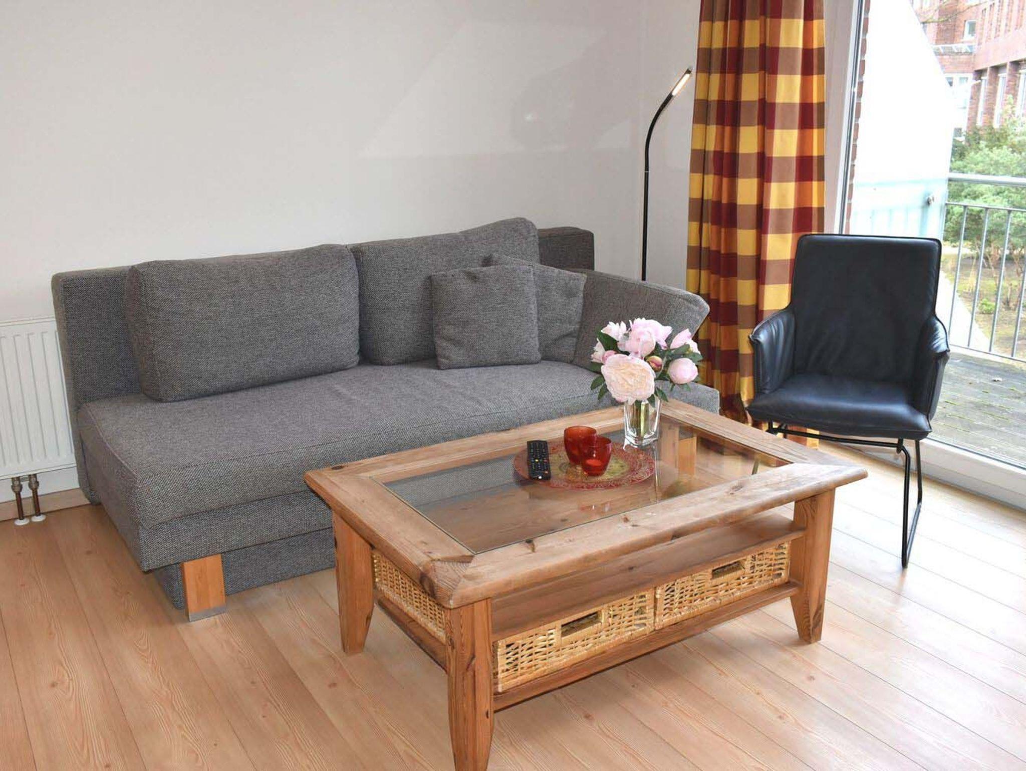 Wohnzimmer: 2 Stühle, Anrichte, Couchtisch, Esstisch, Flachbildschirm, Kabel-TV, Meerblick, Schlafcouch 2,00 x 1,50 m, Sessel, Spiegel, Stehlampe, Stereoanlage mit CD-Player, Tischlampe