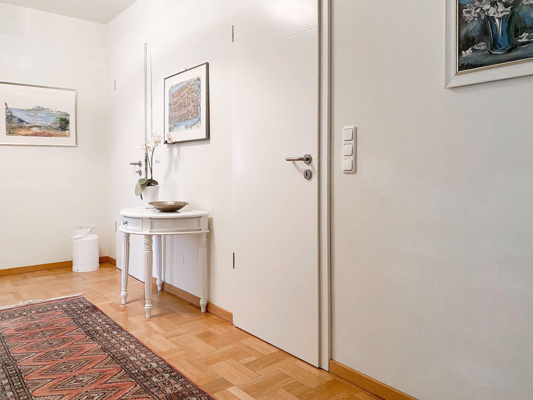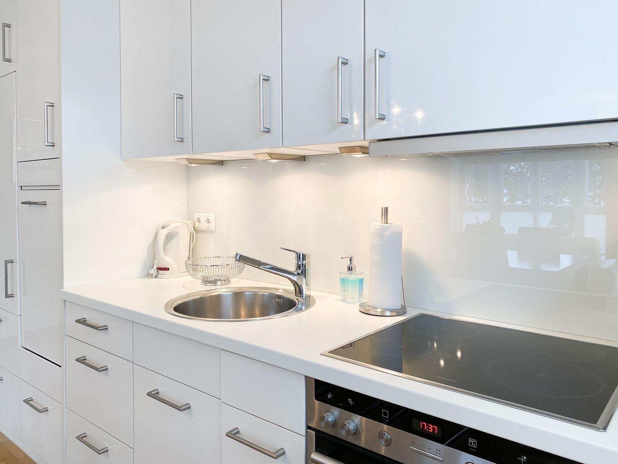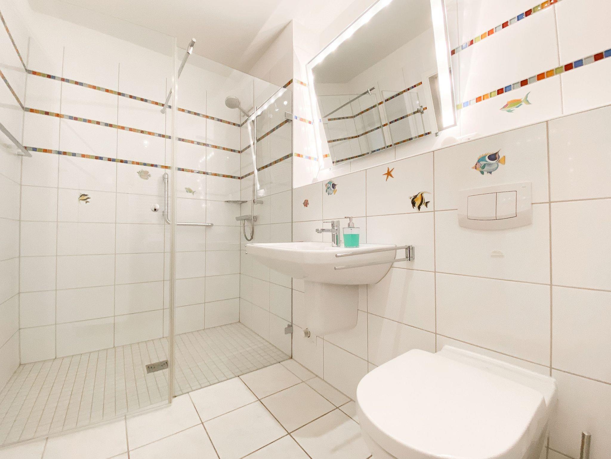Die komfortable Wohnung im 2. Obergeschoss bietet mit 2 separaten Schlafzimmern, ausgestattet mit Doppelbett (180x200) mit elektrisch verstellbaren Rahmen und zwei Einzelbetten (90x200)[nbsp][nbsp]sowie 2 separaten Duschbädern ausreichend Platz für 4 Personen. In einem der Bäder ist zusätzlich eine Waschmaschine untergebracht. Es gibt eine offene, moderne Einbauküche mit Induktionsherd, Backofen, Mikrowelle, Geschirrspüler und einen großzügigen Essbereich für 6 Personen. Der anschließende Wohnbereich ist mit einer Ledergarnitur und einem Elektrokamin ausgestattet und eröffnet einen wunderschönen Ausblick über den gegenüberliegenden Park, teilweise durch das Grün bis zur Ostsee. Im Erker befindet sich ein gemütlicher Lesesessel. Auf dem vorgelagerten Balkon läßt sich wunderbar die Abendsonne bei einem Sundowner genießen. Ein kostenloser Internetzugang über WLAN steht zur Verfügung.