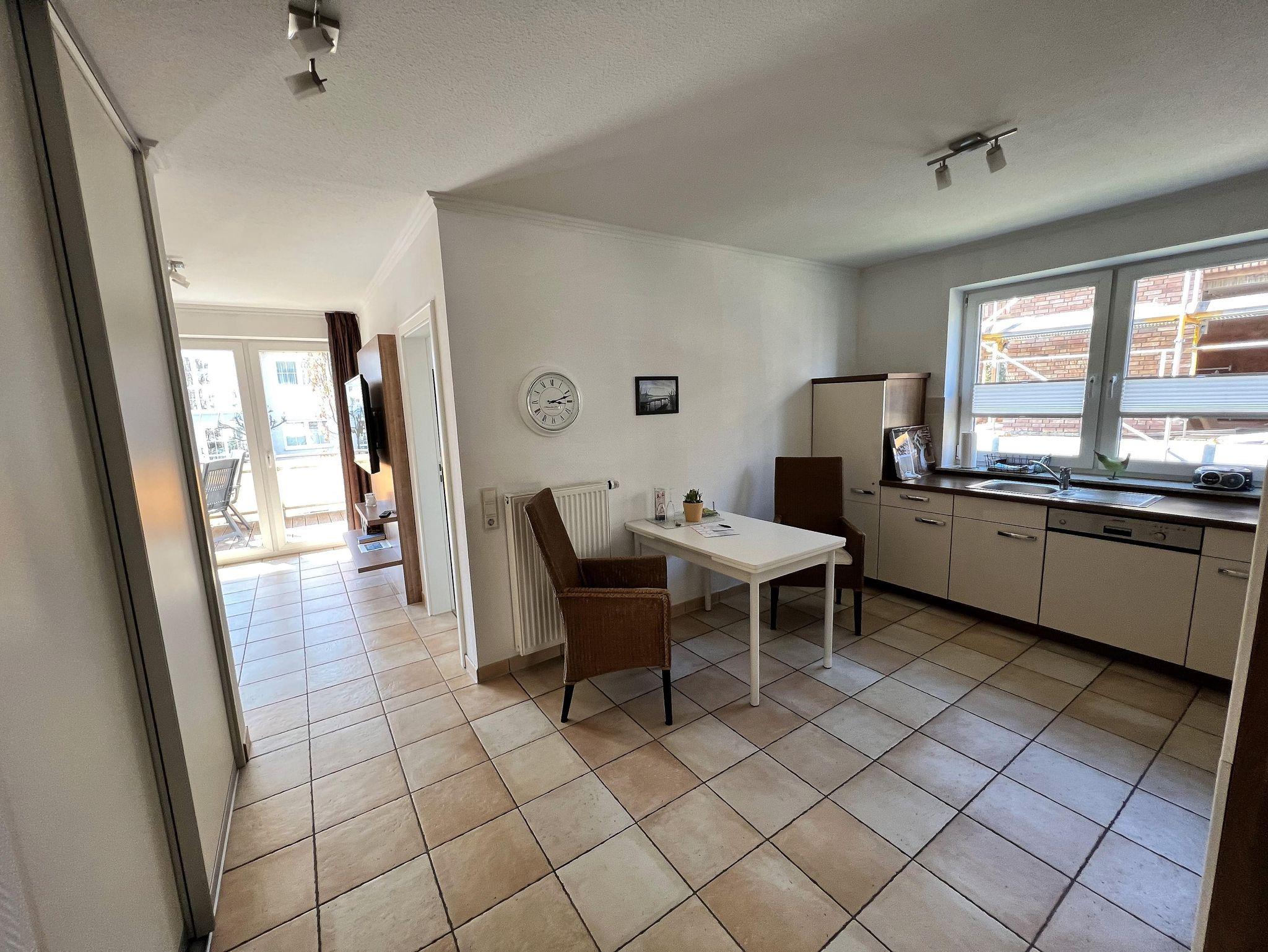Die helle und freundliche 2 Raum Ferienwohnung mit Duschbad ist zur Südwest Seite ausgerichtet. Auf dem großzügigen Balkon können Sie es sich in der Sonne gemütlich machen. Sowohl im Schlafzimmer, als auch im Wohlzimmer schauen Sie auf modernen Flachbildschirmen Kabel Fernsehen. Die Küche lässt keine Wünsche offen, ob Geschirrspüler, Kühlschrank mit Eisfach, Nespresso Kaffeemaschine, Geschirr und Kochutensilien. Einbauschränke bieten den notwendigen Stauraum. Die Betten sind mit Bettwäsche bezogen und Handtücher sind vorhanden.
