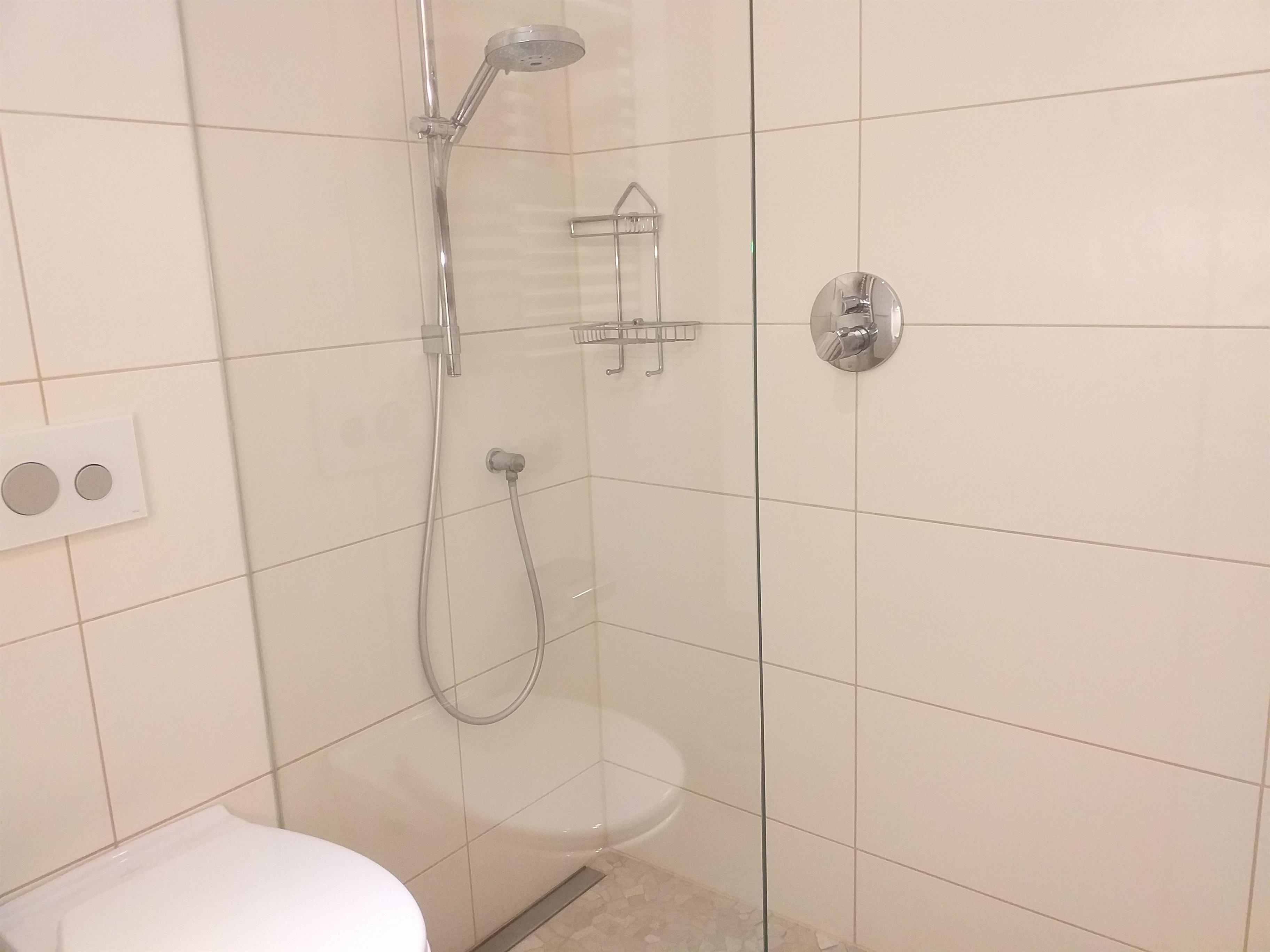 Zu der Ausstattung des hochwertigen Vollbades gehört eine große ebenerdige Dusche, WC und viel Stauraum. Selbstverständlich ist ein Haartrockner vorhanden.