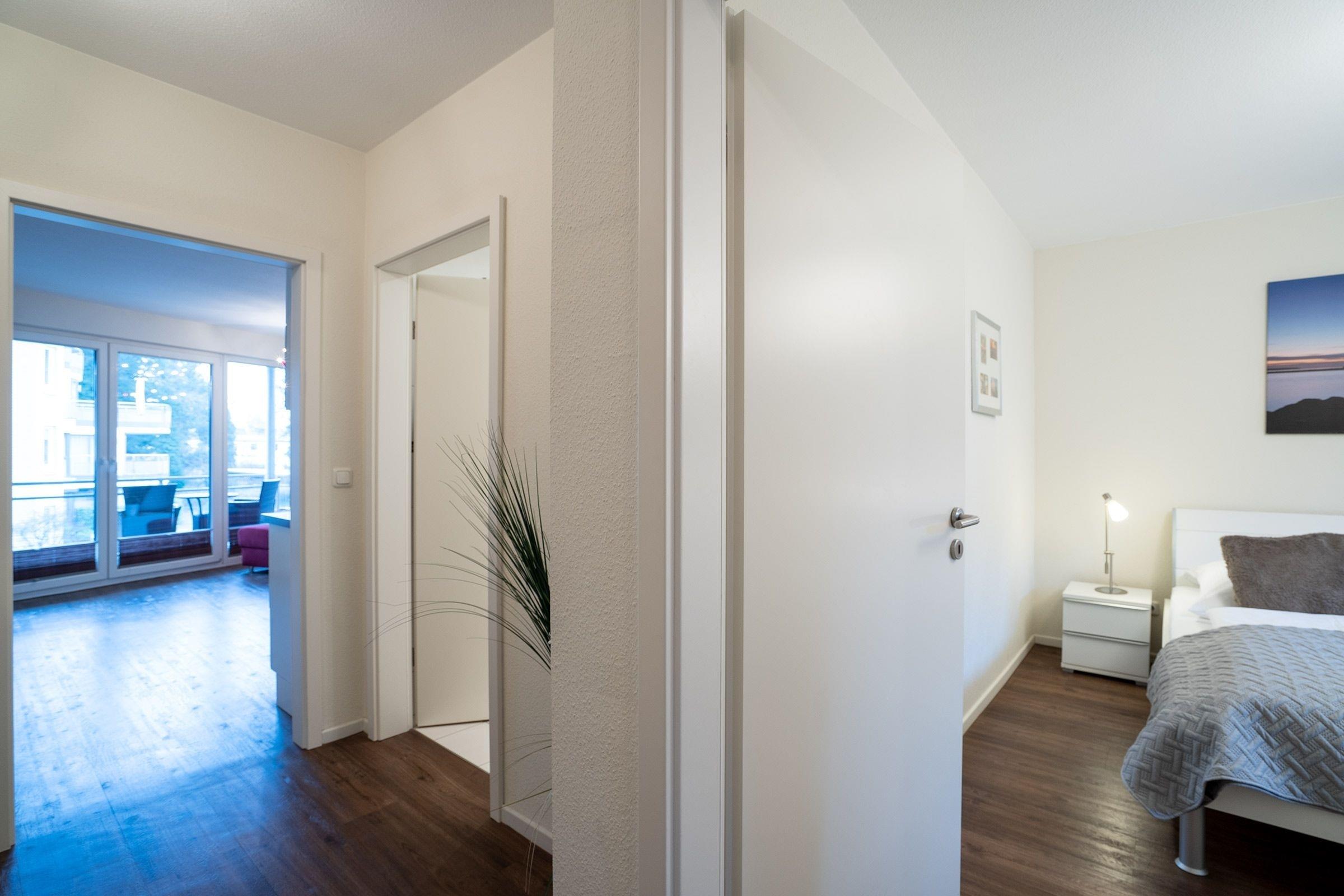 Von der Tiefgarage kommen Sie bequem mit dem Fahrstuhl in die 1. Etage. Ein geräumiger Flur empfängt Sie. Hängen Sie Ihre Jacken auf – und kommen Sie an. Das modern eingerichtete Schlafzimmer Ihres Ferienobjekts (ca. 54 qm) erreichen Sie vom Flur.
