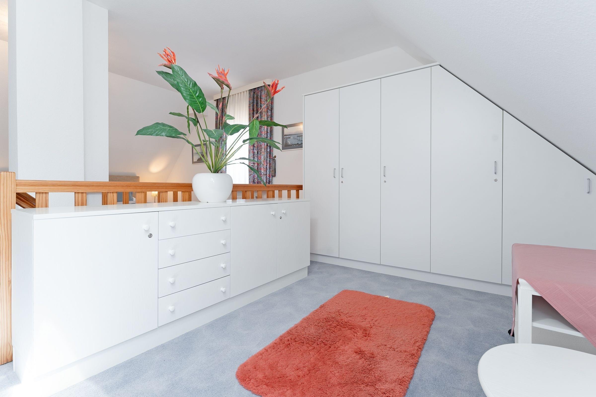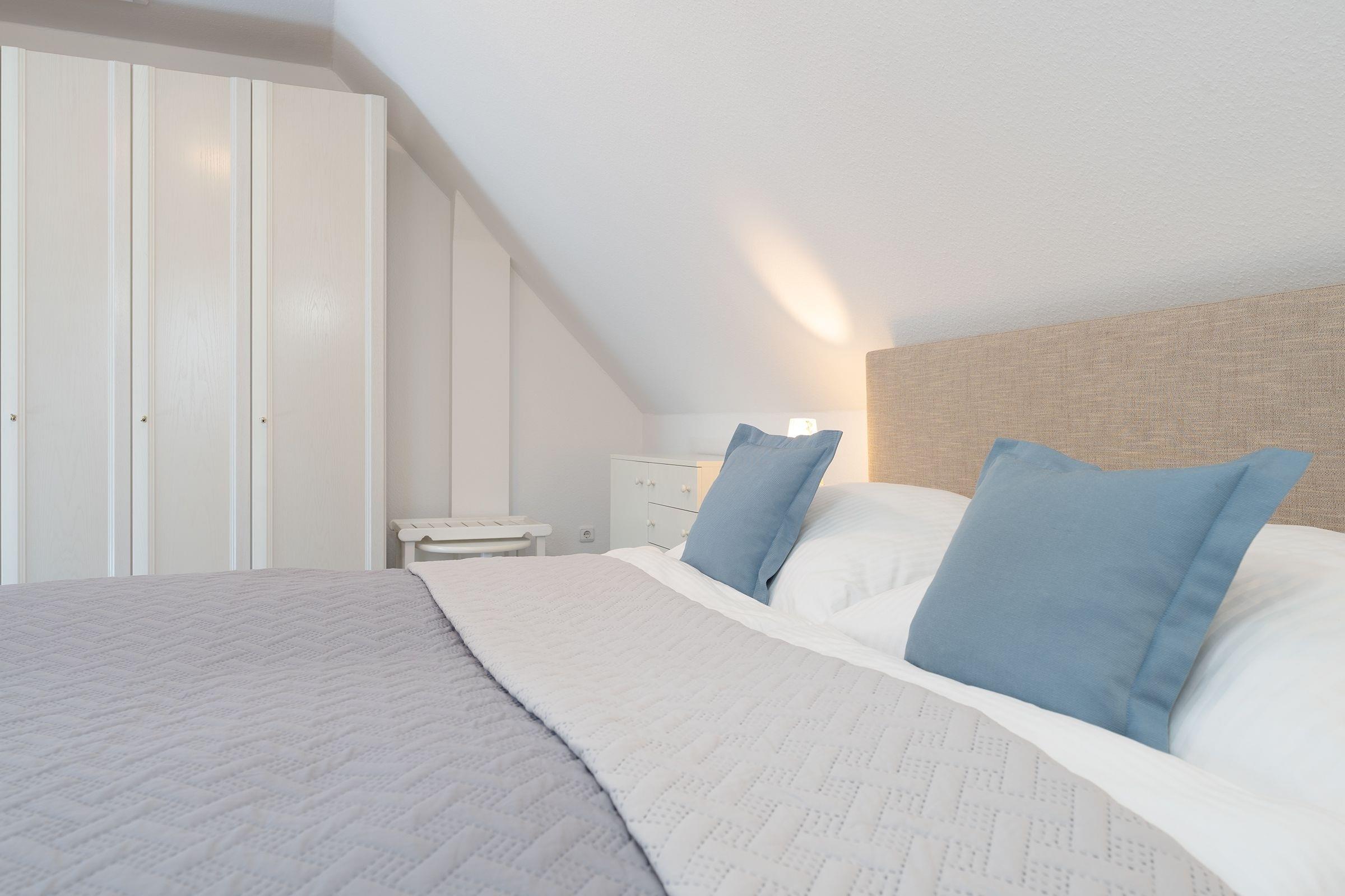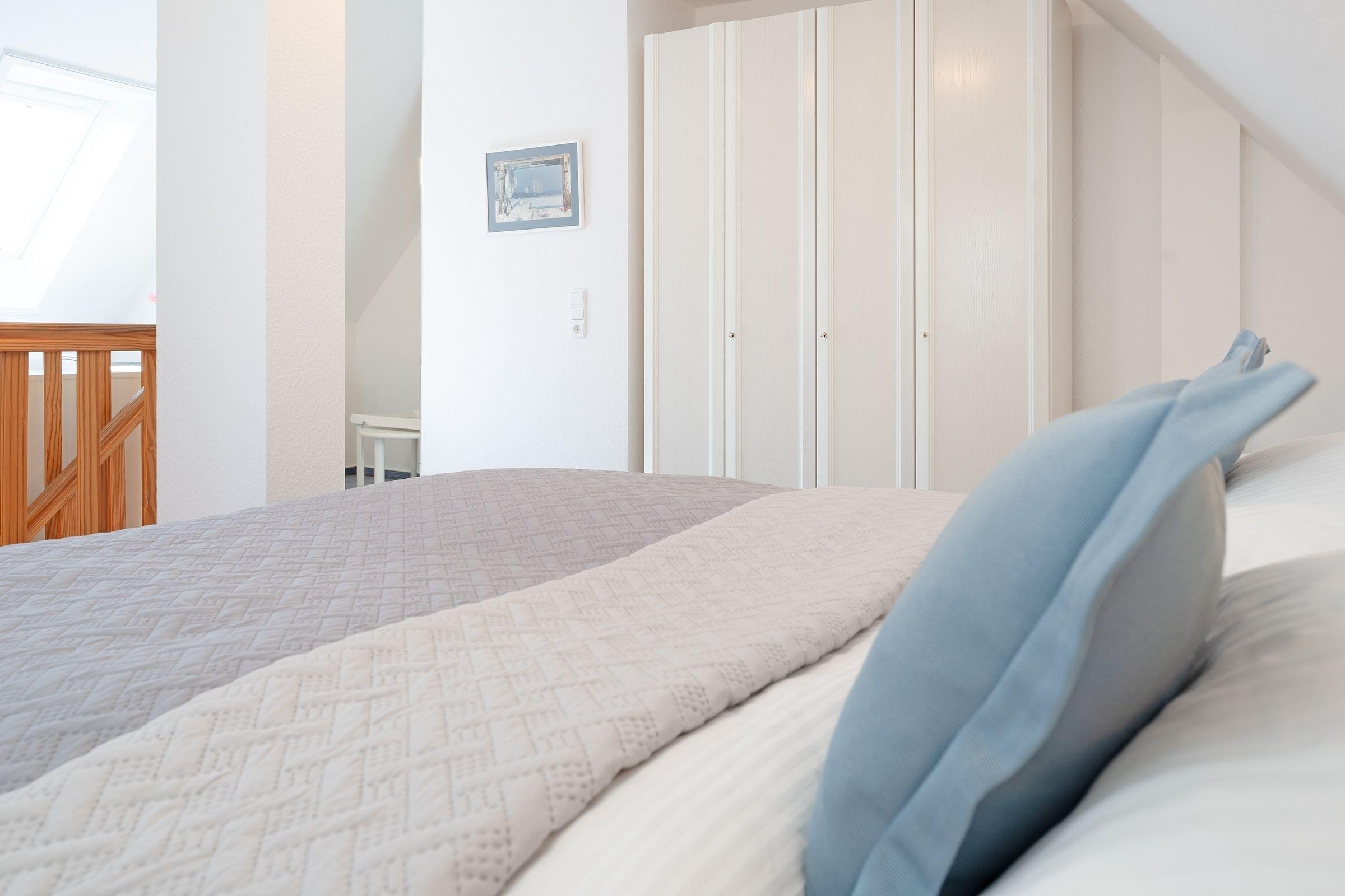 In der separaten Küche haben Sie reichlich Platz zur Zubereitung leckerer Urlaubsgerichte, hier wurde an alles gedacht. Vom Backofen bis zur Spülmaschine erleichtern diverse Annehmlichkeiten den Ferienalltag. Auch das hell geflieste Bad mit Eckdusche, WC, Waschtisch und ein großem Spiegelschrank ist komfortabel und großzügig gestaltet. In diesem Bereich der Wohnung liegt eins der beiden Schlafzimmer, ausgestattet mit Doppelbett (2x 90x200 cm), Kleiderschrank und Schminkspiegel. Vom Wohnbereich führt eine Holztreppe in die wohnliche Galerie mit zweitem Schlafbereich, ebenfalls mit bequemem Doppelbett (2x 90x200 cm), sowie einem Kleiderschrank mit reichlich Stauraum für Ihre Urlaubsgarderobe. Das gesamte Logis ist mit Teppich ausgelegt.