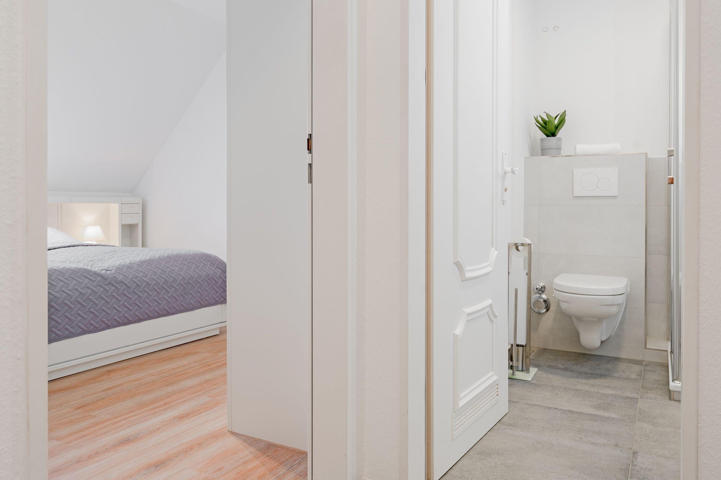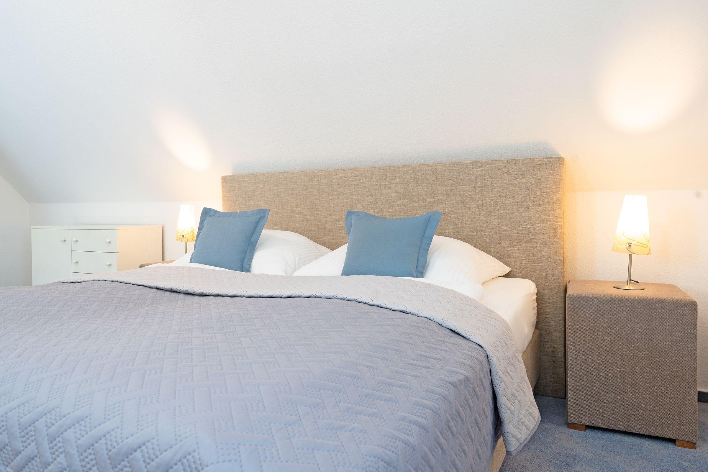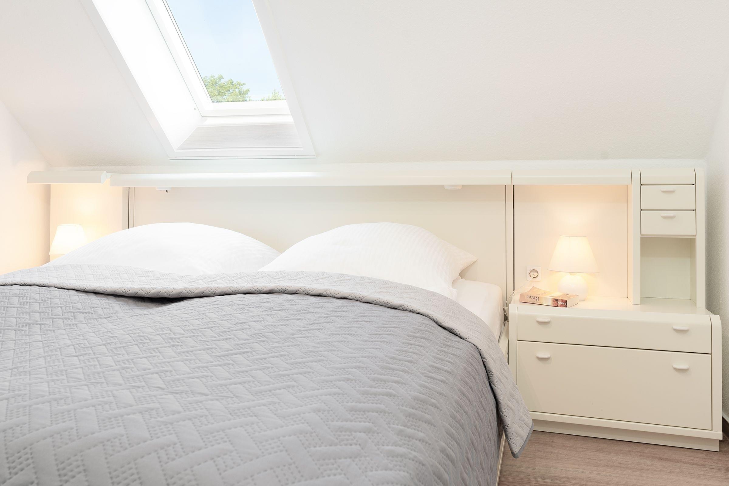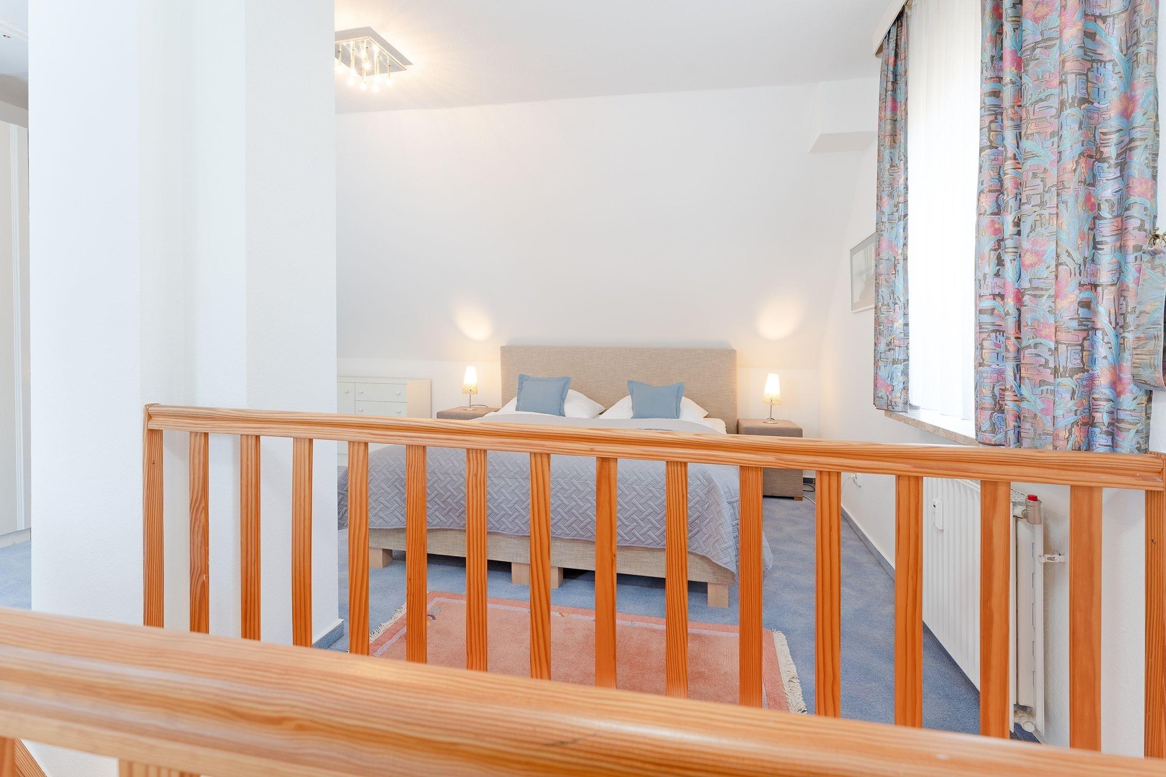In der separaten Küche haben Sie reichlich Platz zur Zubereitung leckerer Urlaubsgerichte, hier wurde an alles gedacht. Vom Backofen bis zur Spülmaschine erleichtern diverse Annehmlichkeiten den Ferienalltag. Auch das hell geflieste Bad mit Eckdusche, WC, Waschtisch und ein großem Spiegelschrank ist komfortabel und großzügig gestaltet. In diesem Bereich der Wohnung liegt eins der beiden Schlafzimmer, ausgestattet mit Doppelbett (2x 90x200 cm), Kleiderschrank und Schminkspiegel. Vom Wohnbereich führt eine Holztreppe in die wohnliche Galerie mit zweitem Schlafbereich, ebenfalls mit bequemem Doppelbett (2x 90x200 cm), sowie einem Kleiderschrank mit reichlich Stauraum für Ihre Urlaubsgarderobe. Das gesamte Logis ist mit Teppich ausgelegt.