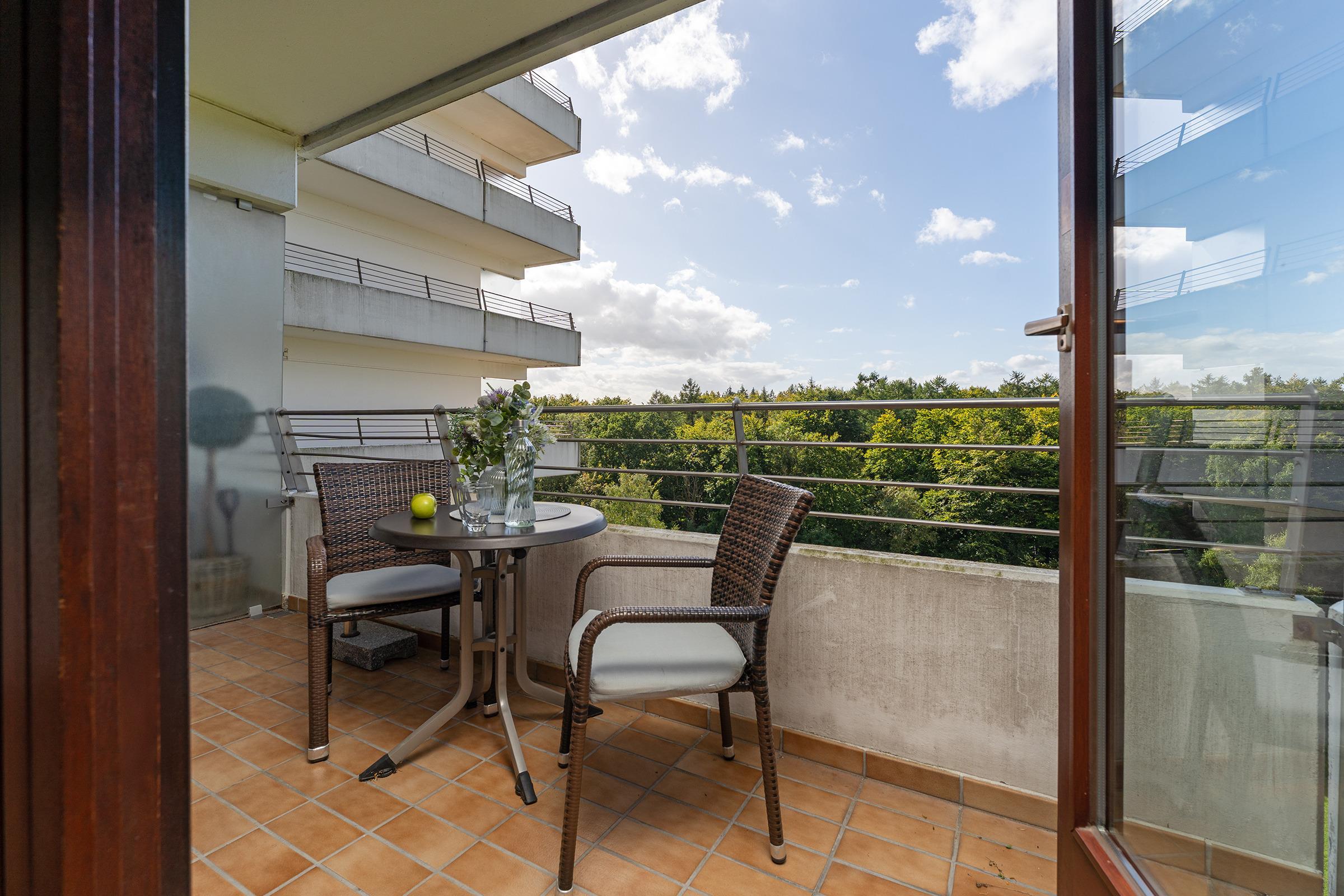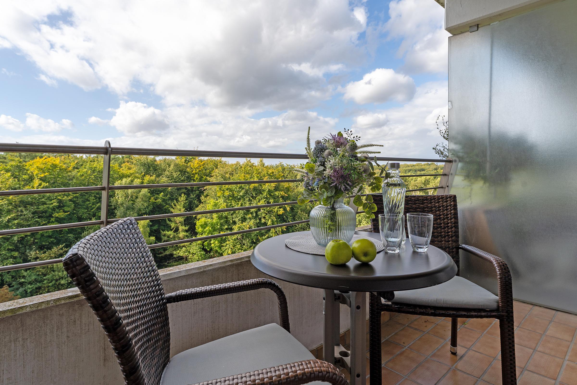 Der Wohn- und Schlafbereich ist offen gestaltet und das große Doppelbett (180x200cm) verspricht erholsame Nächte nach langen Strandspaziergängen. Auf dem bequemen Sofa können Sie ein Glas Wein vor dem TV genießen, sollte es auf dem großen überdachten Balkon mal zu frisch werden. Aus der 7. Etage haben Sie einen traumhaften Blick über den angrenzenden Wald. Wenn Sie sich selbst verpflegen möchten, können Sie sich mühelos in der kleinen Küche etwas Leckeres zubereiten und am Esstisch gemeinsamen speisen. Ein Badezimmer mit Eckdusche und großem beleuchteten Spiegel rundet die Ausstattung dieses Feriendomizils ab.