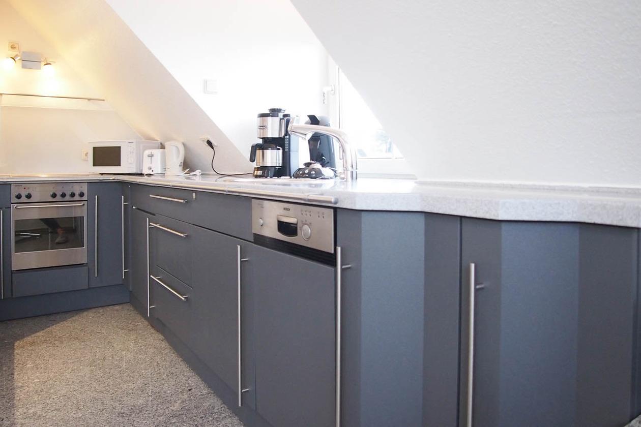 Die Wohnung befindet sich im 2. Obergeschoss einer kleinen Anlage und bietet auf 50 qm über 2 Wohnebenen ausreichend Platz für 2-4 Personen. Auf der unteren Ebene befinden sich ein Schlafzimmer mit Doppelbett (160x200), ein hochwertiges Duschbad mit Fußbodenheizung und ein lichtdurchfluteter Wohnraum mit TV. Die integrierte Küche ist gut ausgestattet und der anschließende Essbereich ist auf 3 Personen zugeschnitten. Eine weiße, offene Treppe führt zur Galerie mit dem zweiten Schlafbereich, der ebenfalls mit einem Doppelbett (140x200) ausgestattet ist. Der sonnige Südwestbalkon ist mit Gartenmöbeln sowie einer Markise ausgestattet und schließt sich direkt dem Wohnbereich an. WLAN steht zur kostenfreien Nutzung zur Verfügung.