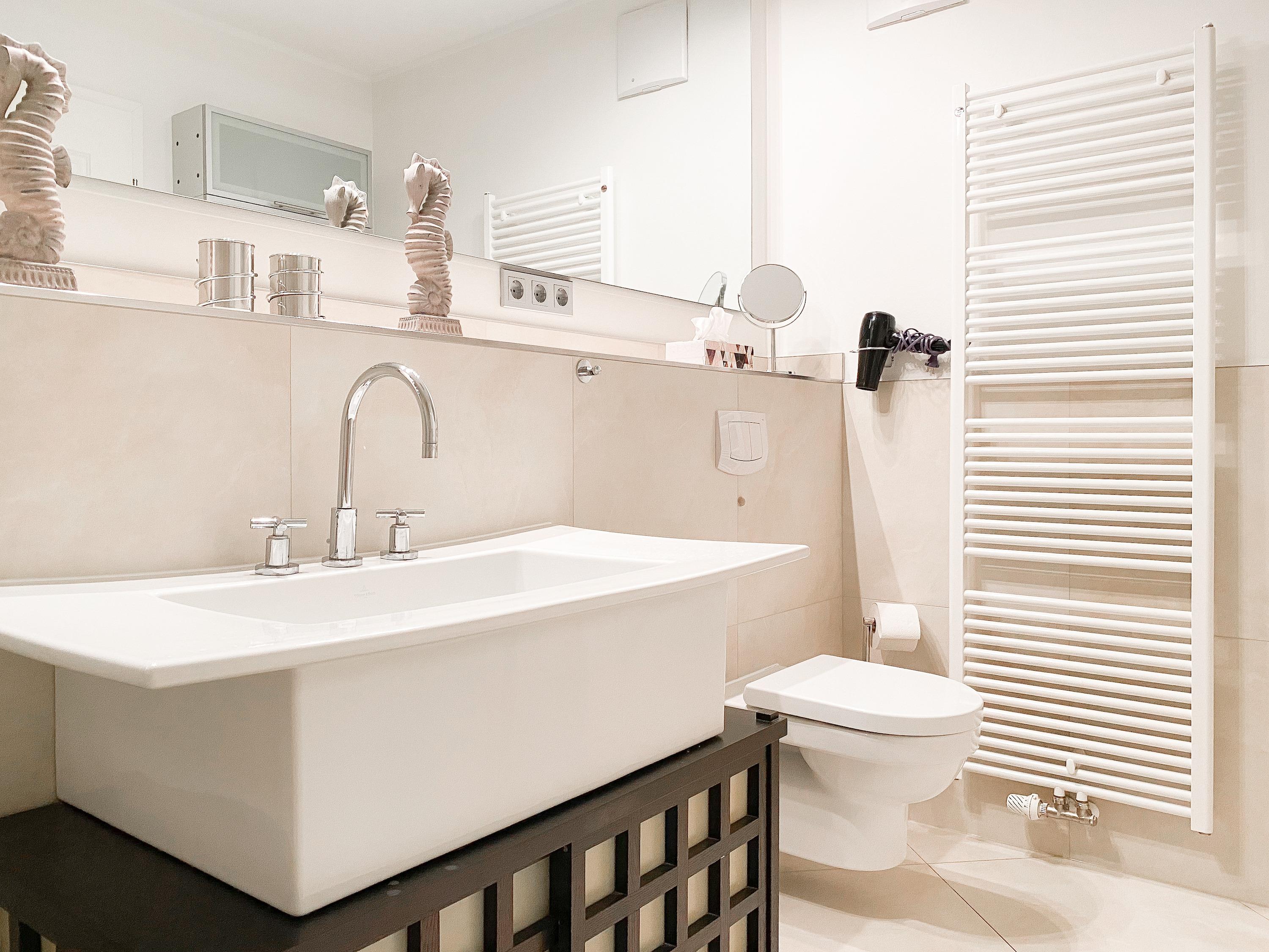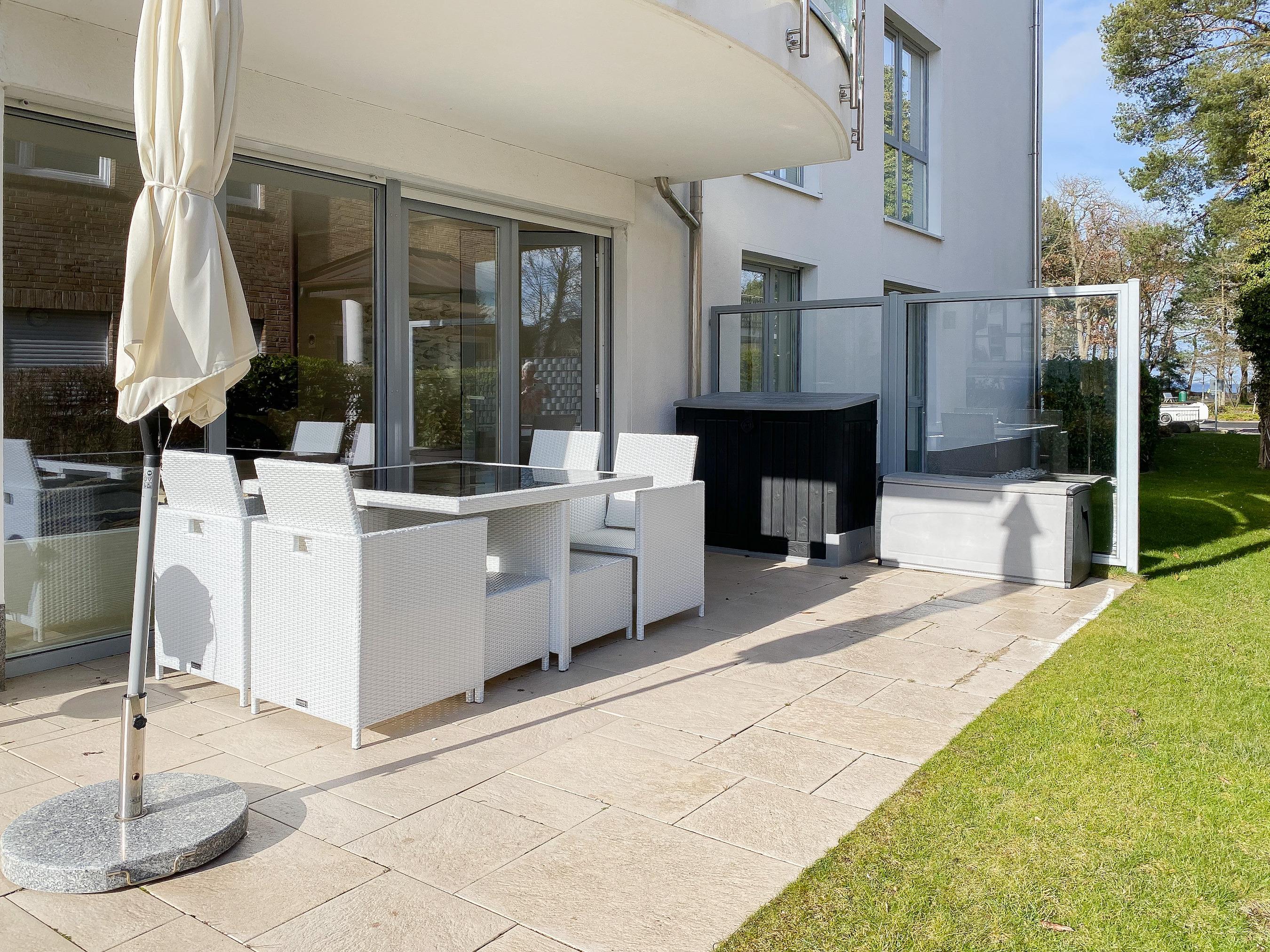 Ein absolutes Highlight dieser Wohnung sind die zwei großen Terrassenbereiche in Ost - Süd - West Ausrichtung, die mit Gartenmöbeln ausgestattet sind. Genießen Sie vom Frühstück bis in die Abendstunden die Sonne und sogar einen kleinen Blick auf die Ostsee! Die Terrassentür lässt sich mit dem Hausschlüssel öffnen und dient als privater Eingangsbereich, sodass Sie direkt über die eigene Terrasse und durch den Garten mit wenigen Schritten an der Ostsee sind.