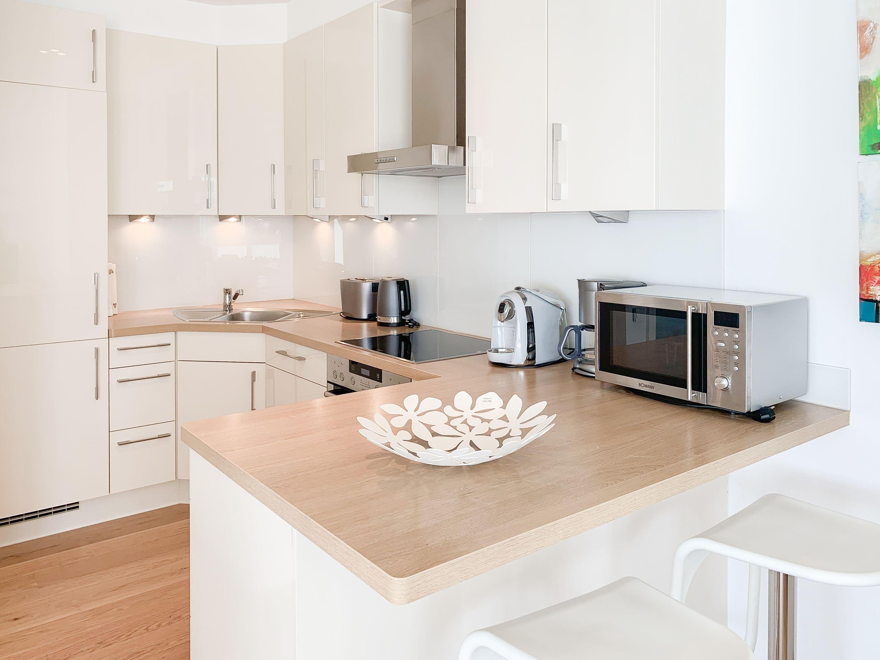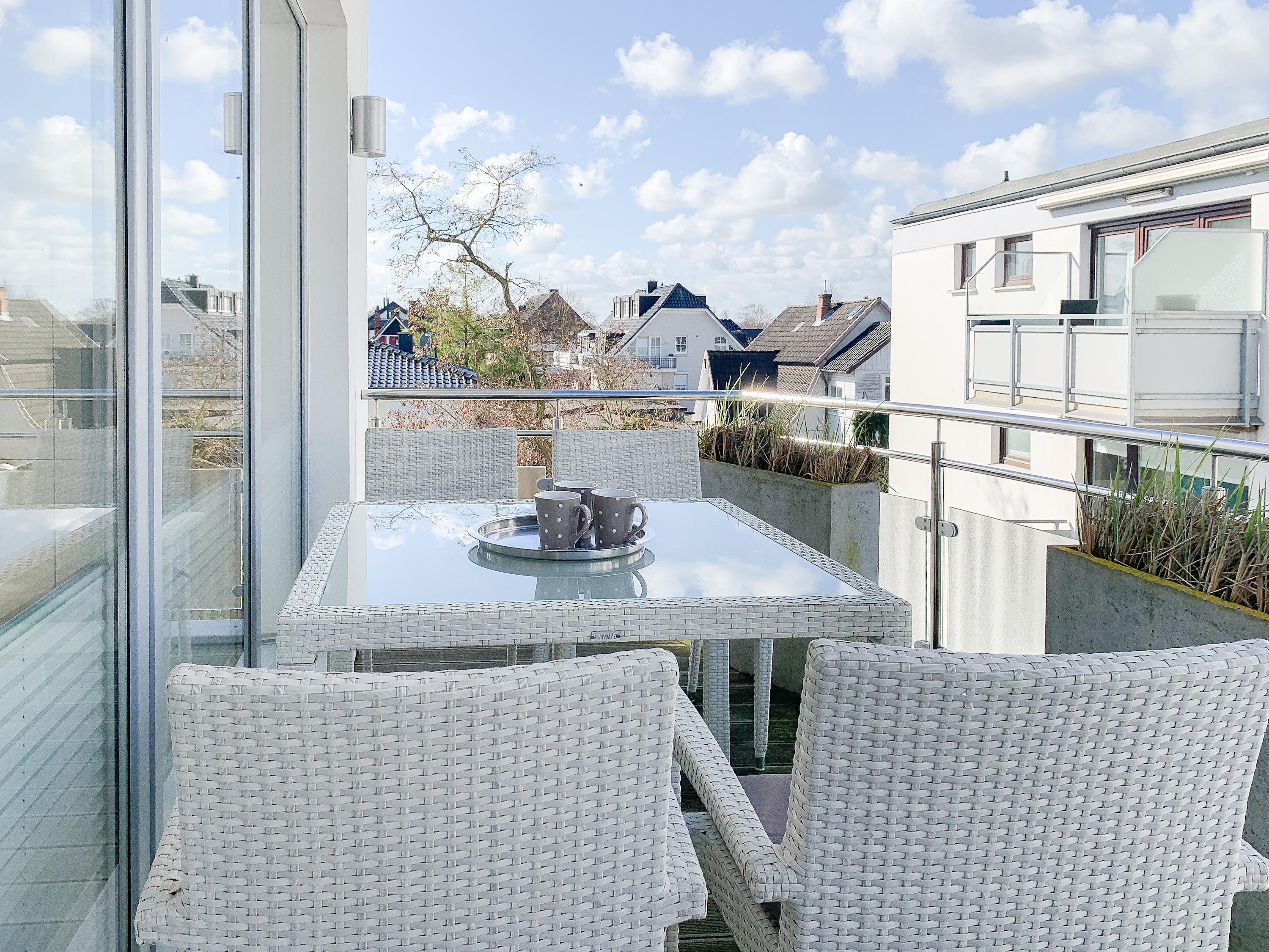 Die geschmackvoll eingerichtete Wohnung[nbsp] im 2. Obergeschoss hat helle, sonnige Wohnräume mit großen Fensterflächen und Echtholzparkett, die eine angenehme Wohnatmosphäre schaffen. Die offene Einbauküche verfügt über Mikrowelle, Backofen, Kochfeld und Spülmaschine. Im anschließenden Wohnbereich mit gemütlichem Sofa und Ethanol-Kamin, befinden sich ein TV, Hifi-Anlage sowie Internetanschluss über WLAN. Vor dem großzügigen Essbereich, der für 6 Personen ausreichend Platz bietet, befindet sich der mit Rattan Möbeln ausgestattete Westbalkon, auf dem vom frühen Nachmittag bis in die Abendstunden die Sonne scheint. Es stehen zwei separate Schlafzimmer zur Verfügung, wovon das eine mit einem Doppelbett (180x200) und das andere mit einem Doppelbett (160x200) und[nbsp] TV ausgestattet ist. Im modernen Bad mit großer Dusche und Handtuchwärmer ist eine Waschmaschine untergebracht. Ein separates Gäste WC steht ebenfalls zur Verfügung. Ein fest reservierter PKW Stellplatz und ein Fahrradkeller befindet sich in der hauseigenen Tiefgarage (Einfahrtshöhe 2 m). Das Haus verfügt über einen Fahrstuhl. Münzwaschmaschine und Trockner sind vorhanden.
