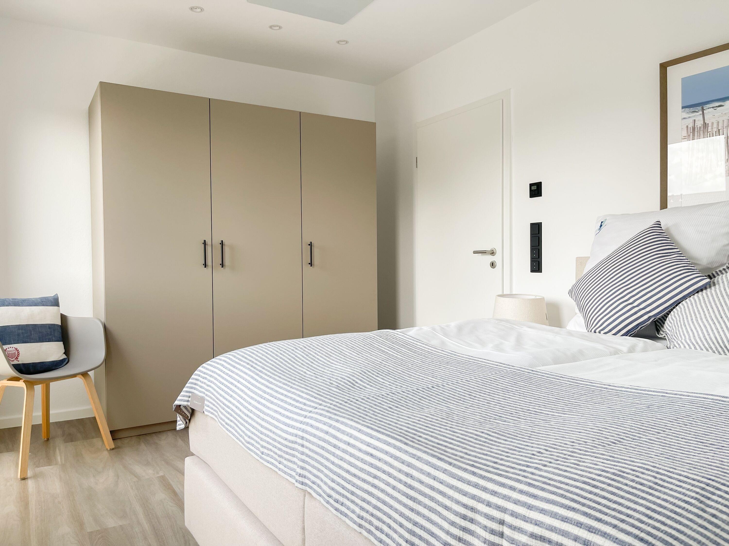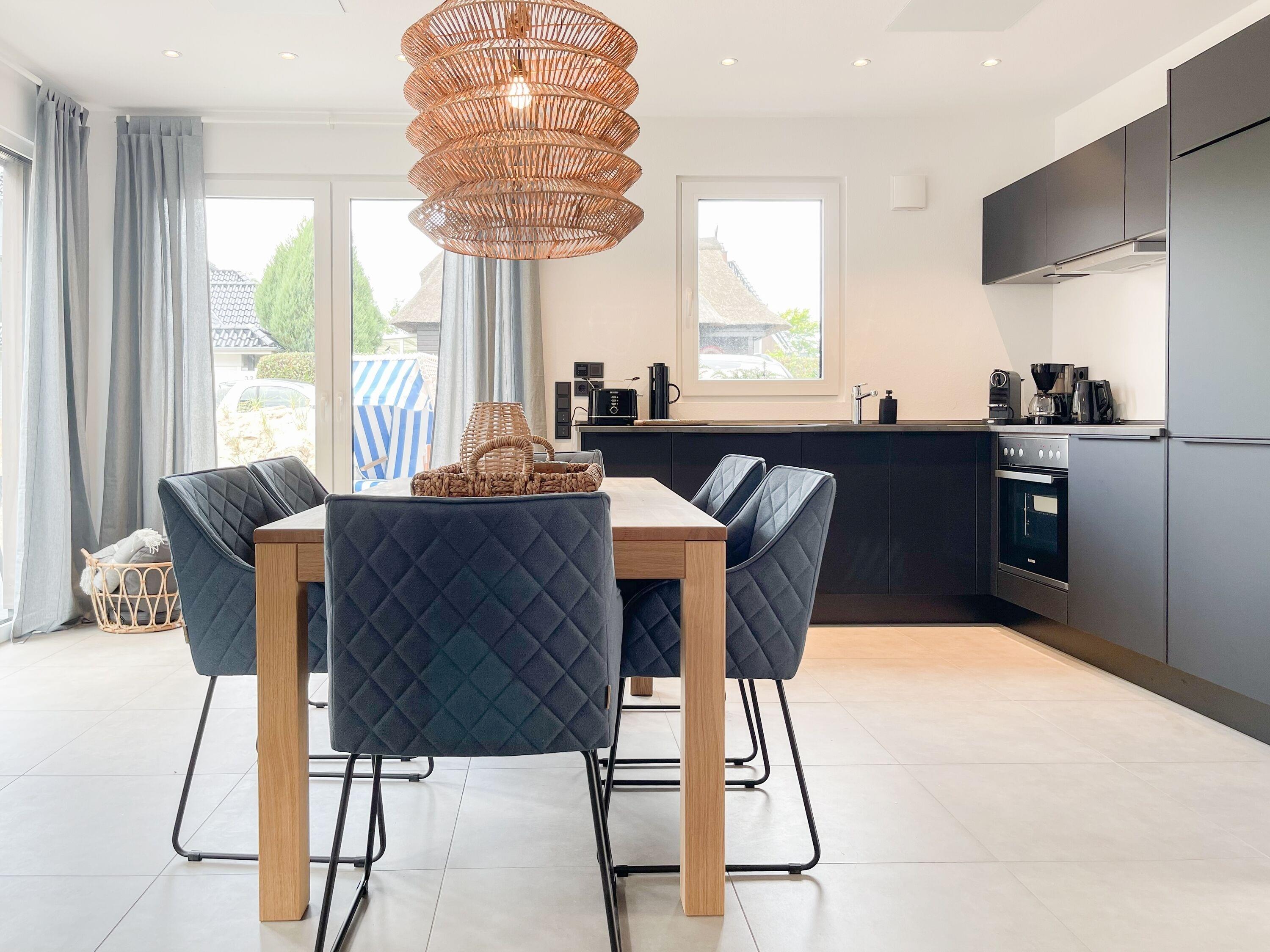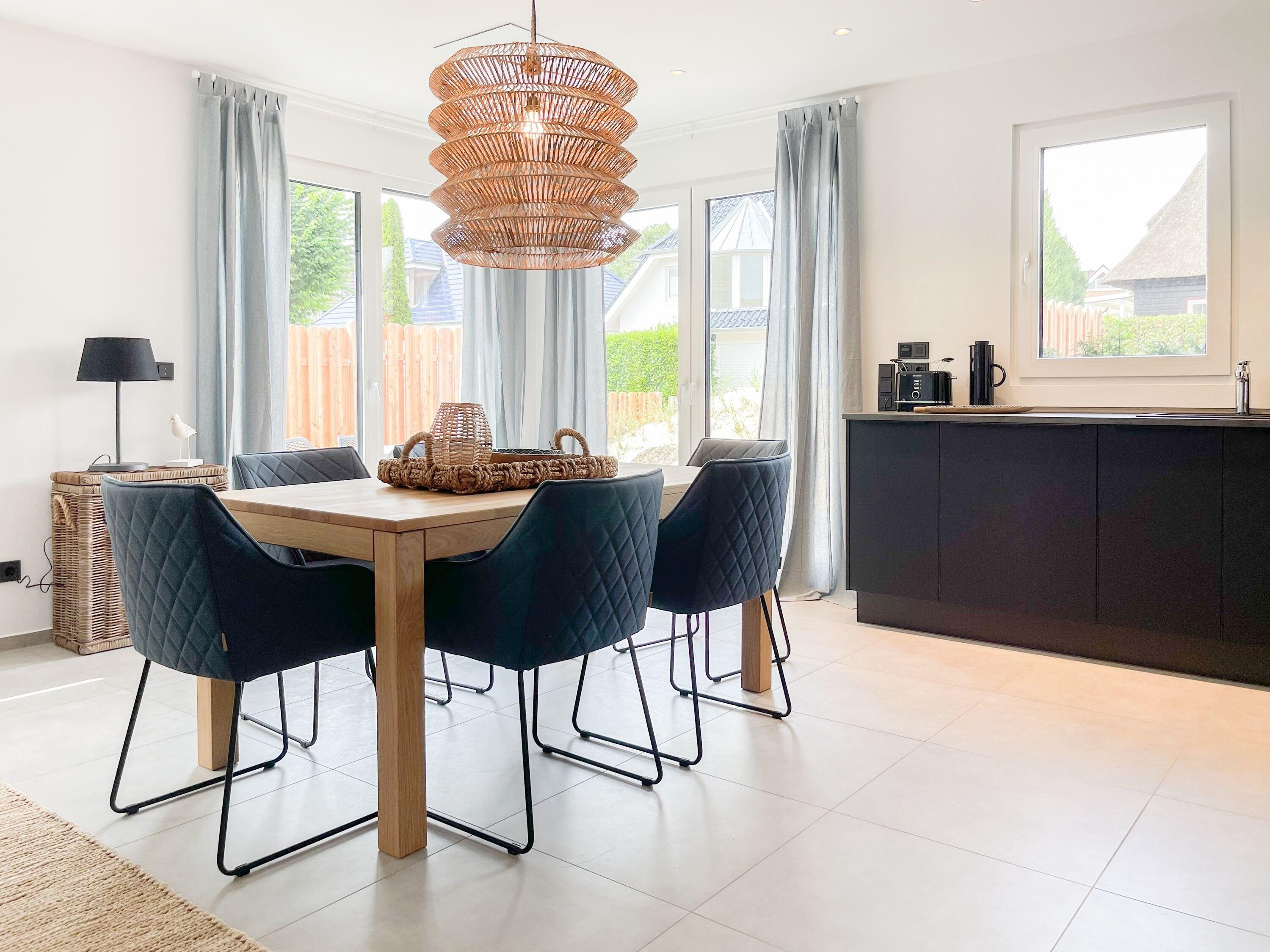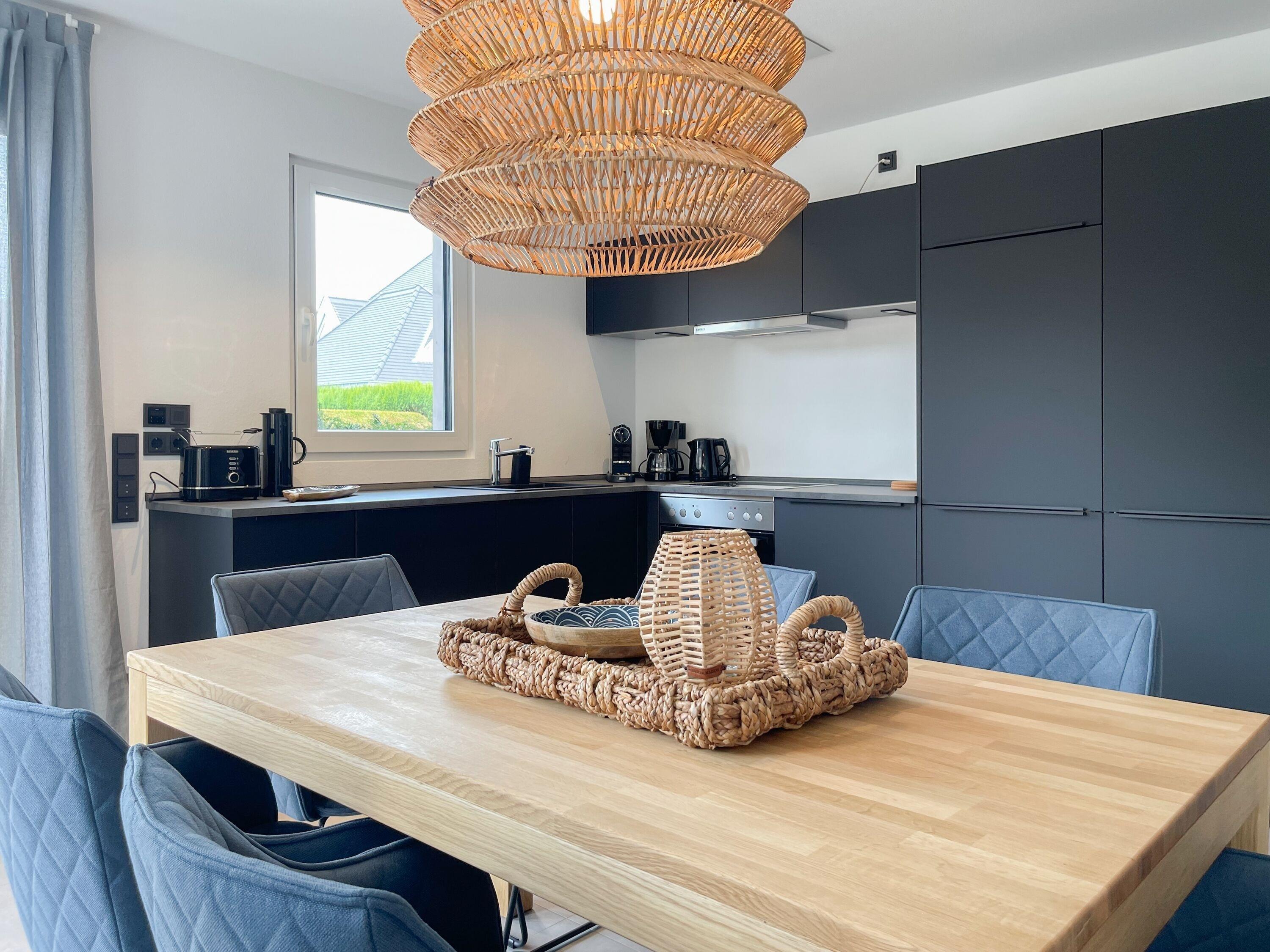 Es erwartet Sie eine wunderschönes Ferienhaus im skandinavischen Stil. Sonnige Räumlichkeiten und die äußerst hochwertige Einrichtung garantieren einen hohen Wohnstandard in einem schönen Ambiente. Mit 4 Schlafzimmern, einem exklusiven Bad mit Walk In Dusche, Radio und Sauna sowie einem zusätzlichen Gäste WC, bietet das Hygge Hus auf über 100 qm Wohnfläche ausreichend Raum für 5 Personen, um einen erholsamen Ostseeurlaub in Strandnähe zu verleben. Im Erdgeschoss erwartet Sie ein lichtdurchfluteter Wohn- Essbereich, großzügig geschnitten und hochwertig möbliert. Die integrierte Einbauküche in perfekter Ausstattung eignet sich hervorragend für gemeinsames Kochen. Die vorgelagerte Terrasse in Südwestausrichtung ist mit Gartenmöbeln und einem Strandkorb ausgestattet. Im Eingangsbereich befindet sich die Garderobe und ein modernes Gäste WC mit Fenster. Im Obergeschoss gibt es zwei separate Schlafzimmer mit Boxspringbetten (180x200 und 120x200), TV und Kleiderschrank. Das hochwertige Wellnessbad mit großzügiger Walk-In Dusche und integrierter Sauna befindet sich ebenfalls im Obergeschoss. Die Schlafzimmer 3 und 4 befinden sich im Dachgeschoss und sind jeweils mit Boxspringbetten (120x200) und Kommode eingerichtet. Alle Fenster sind mit elektrischen Außenjalousien versehren, außer[nbsp] 1 Schlafzimmer im Dachgeschoss, das mit Verdunkelungsplissees ausgestattet ist. Waschmaschine und Trockner sind im separaten Technikraum neben der Terrasse untergebracht.