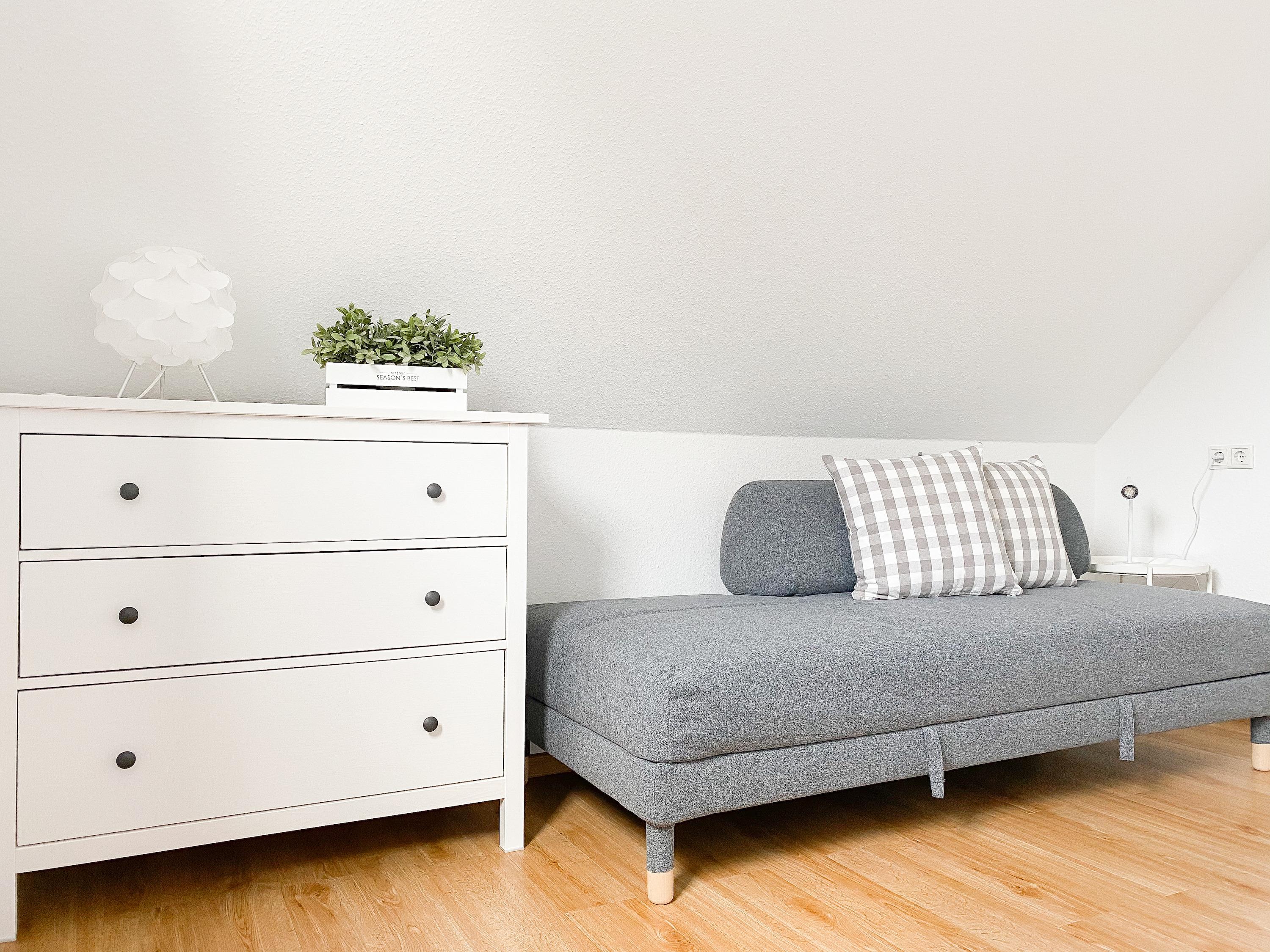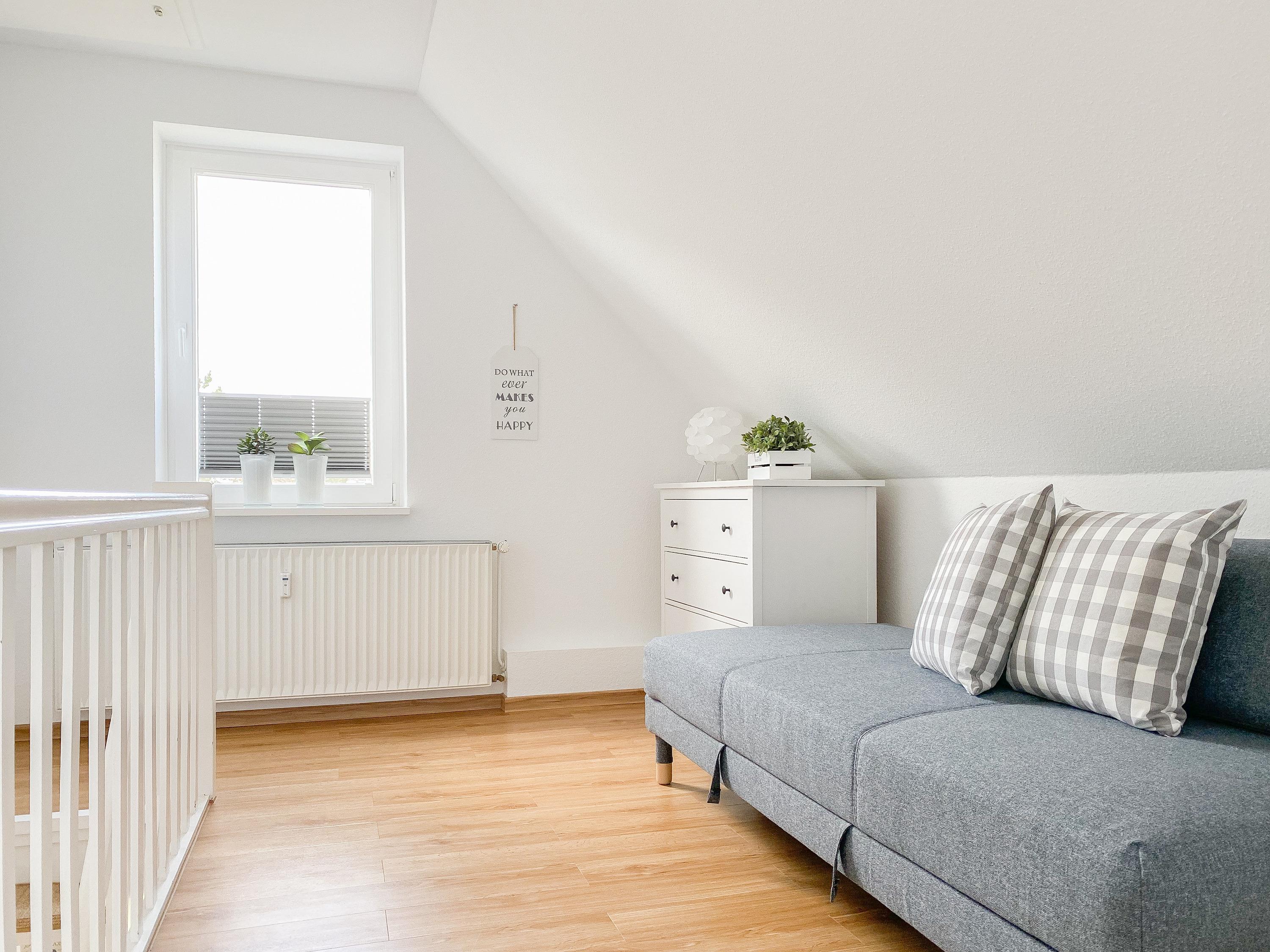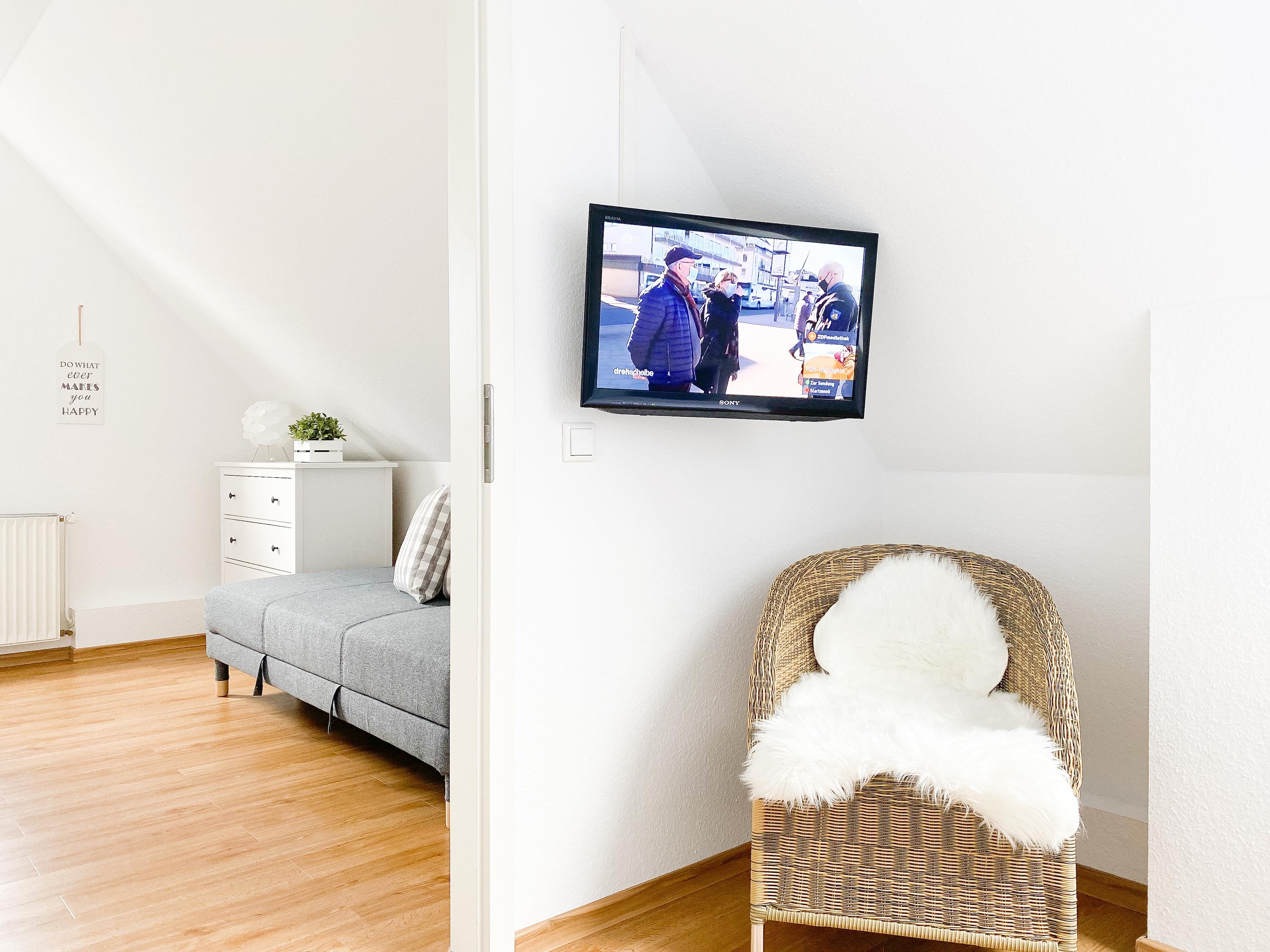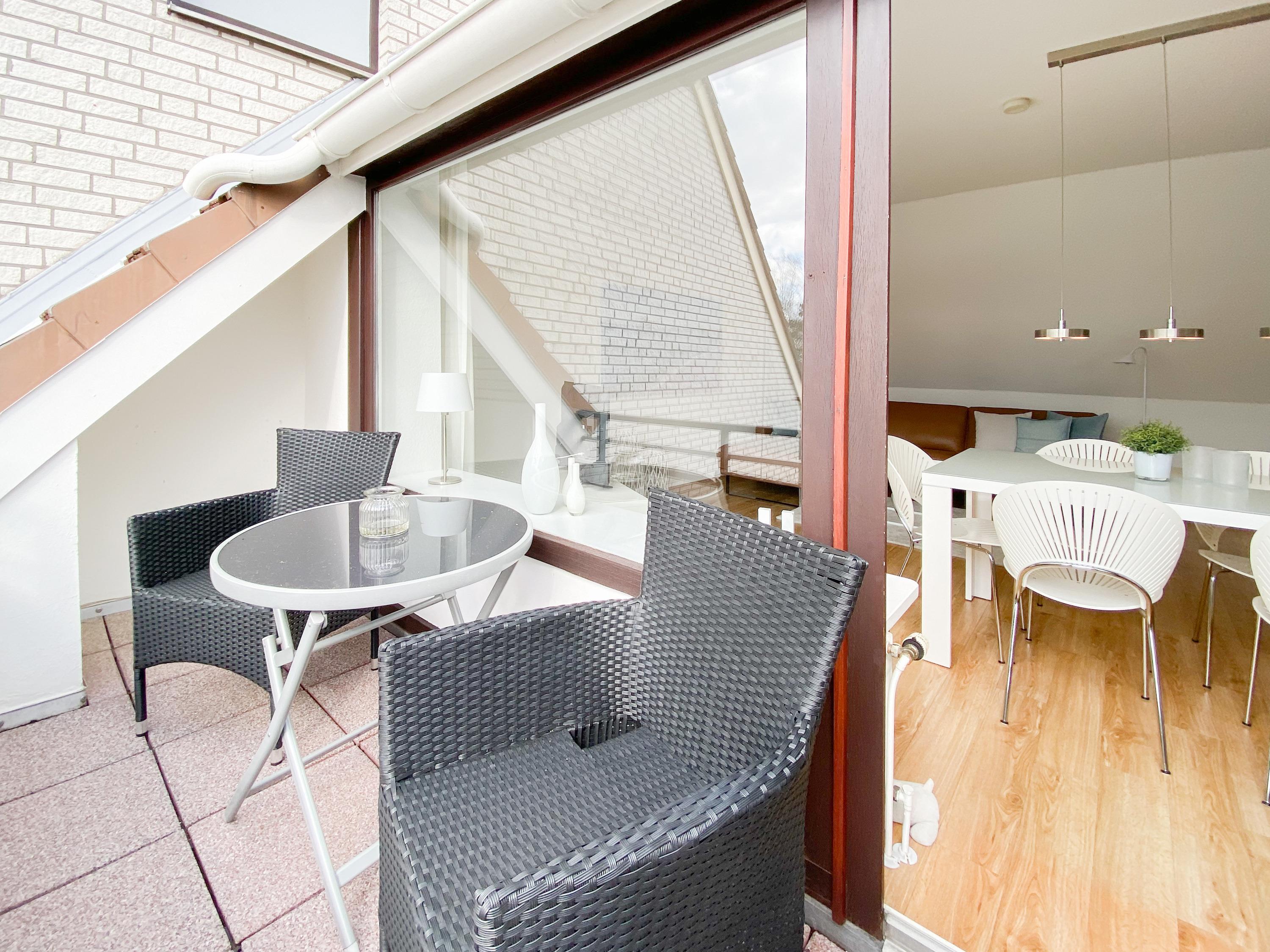 Die großzügige, liebevoll renovierte und geschmackvoll gestaltete Ferienwohnung im 2. Obergeschoss mit 2 Balkonen bietet auf ca. 83 qm ausreichend Platz für 5 Personen. Sie verfügt über ein Schlafzimmer mit Doppelbett (180x200) und vorgelagertem Balkon, ein weiteres Schlafzimmer auf der 2. Ebene ebenfalls mit einem Doppelbett (180x200) und TV sowie einen zusätzlichen Schlafbereich im Durchgangszimmer, ausgestattet mit einem Einzelbett (90x200). Alle Schlafzimmer sind mit Verdunkelungsplissees ausgestattet. Mittelpunkt der Wohnung ist der helle, freundliche Wohnraum mit abgrenzendem Essbereich. Die moderne, offene Einbauküche ist bestens ausgestattet mit Geschirrspüler, Mikrowelle, Backofen, Cerankochfeld sowie einer Frühstückstheke mit Barhockern. Vom Wohnbereich gelangt man auf den sonnigen Süd Balkon. Der Nord-West Balkon ist sowohl vom Flur als auch vom Schlafzimmer zu betreten. Das helle Duschbad verfügt über einen Handtuchwärmer und dank eines Fensters über Tageslicht.