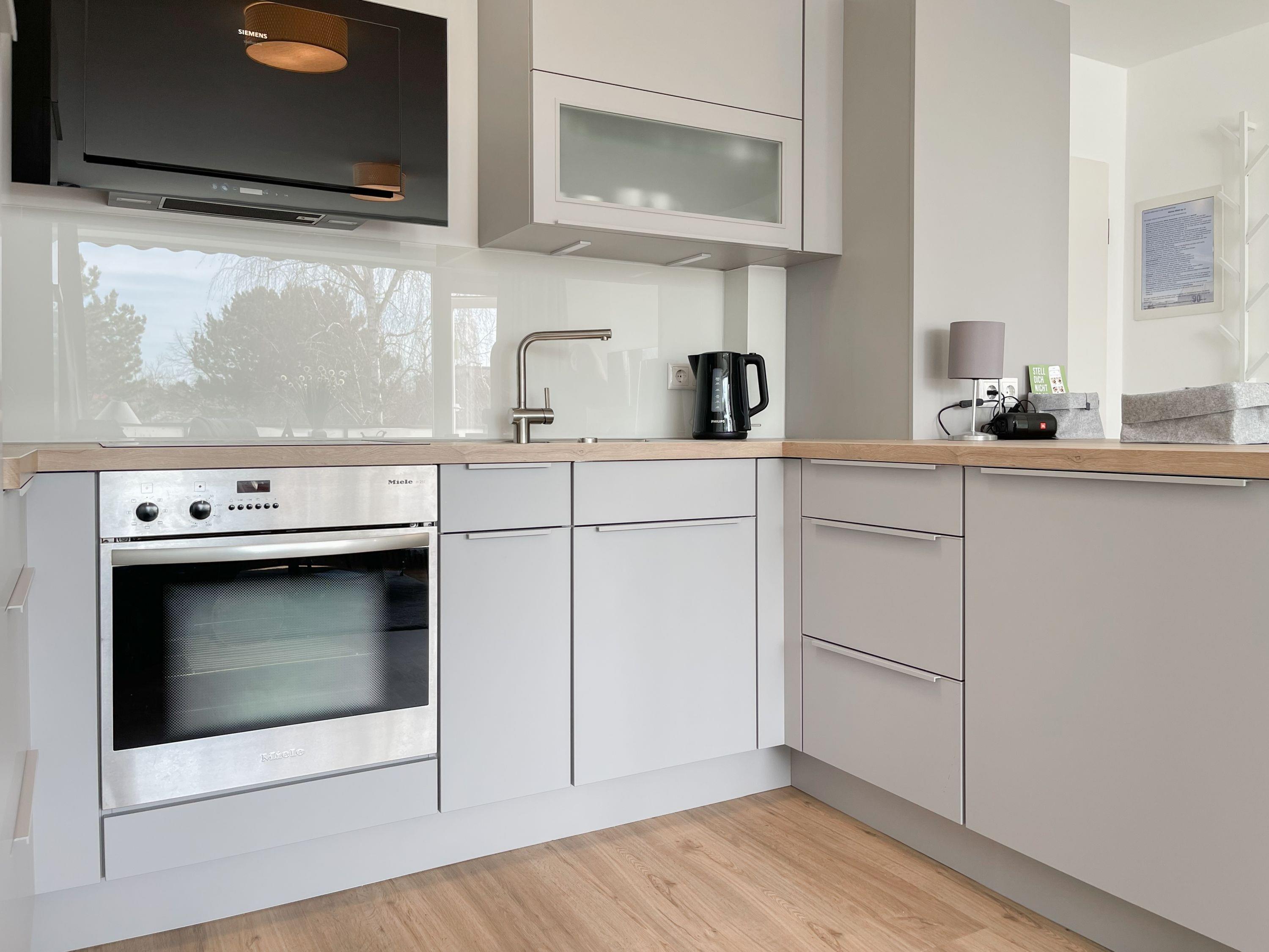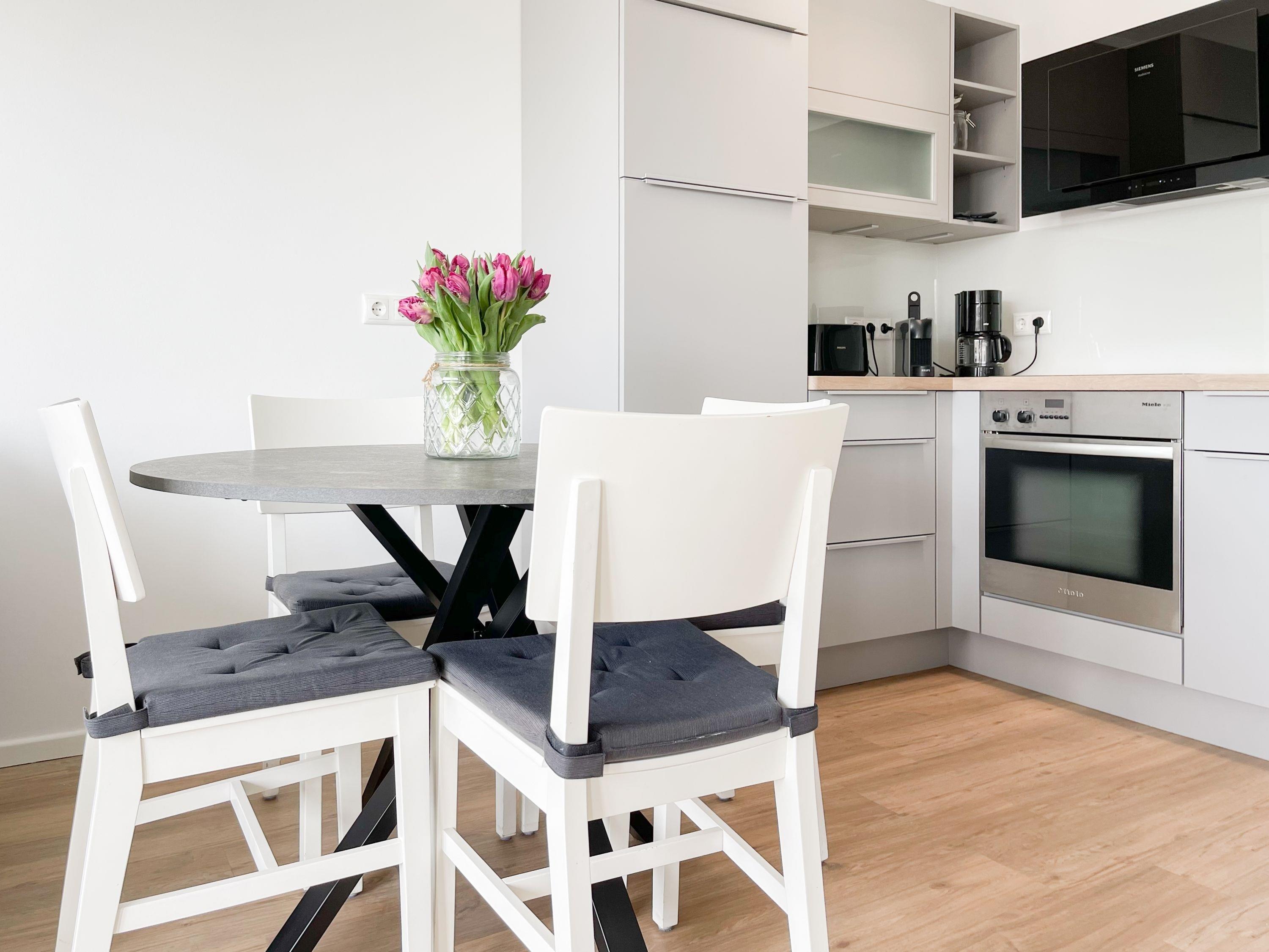 Die Ferienwohnung im 1. Obergeschoss besticht durch ihr gelungenes Raumkonzept und lädt 2-3 Personen zum Wohlfühlen in Strandnähe ein. Der herrliche Sonnenbalkon befindet sich direkt vor dem Wohnbereich und ist mit Gartenmöbeln und einer Markise ausgestattet, um zu jeder Tageszeit erholsame Stunden an der frischen Luft zu genießen. Es erwartet Sie ein heller, freundlicher Wohnraum mit großzügigen Fensterflächen, geschmackvoll gestaltet und hochwertig eingerichtet mit einem Sofa mit Schlaffunktion, TV, Bluetoothradio und einem Essbereich für 4 Personen. WLAN steht selbstverständlich zur kostenlosen Nutzung zur Verfügung. Die offene Küche ist bestens ausgestattet, unter anderem mit Spülmaschine, Mikrowelle, Backofen, Ceranfeld und vielem mehr. Das Schlafzimmer ist mit Schiebetüren vom Wohnbereich getrennt und bietet ein hochwertiges Boxpringbett (180x200), elektrische Außenjalousien und einen Kleiderschrank mit ausreichend Stauraum für die Urlaubsgarderobe. Das neue sehr hochwertige Bad verfügt über Dusche, WC, Waschtisch, Fön, Handtuchtrockner und ein Oberlichtfenster.