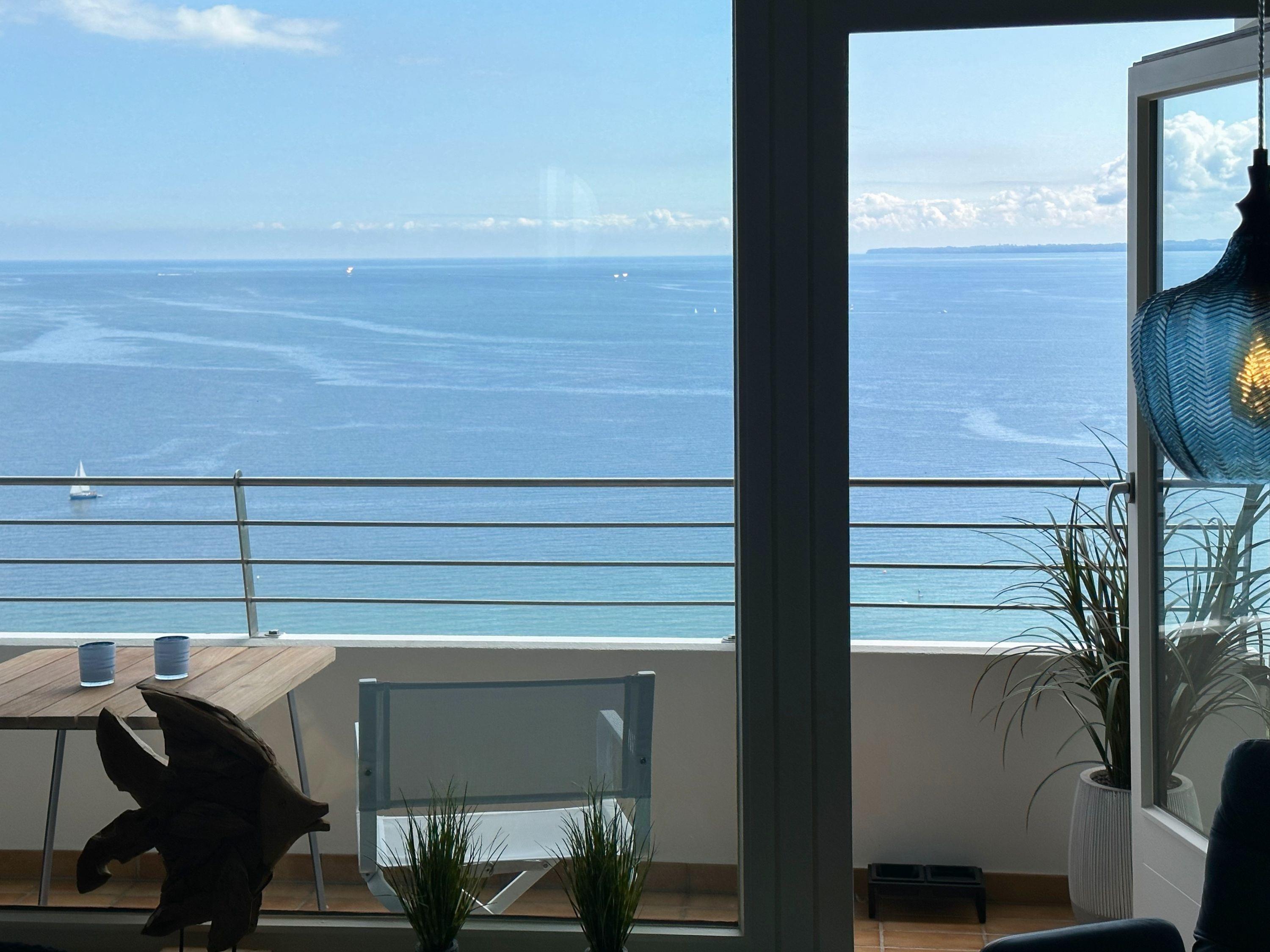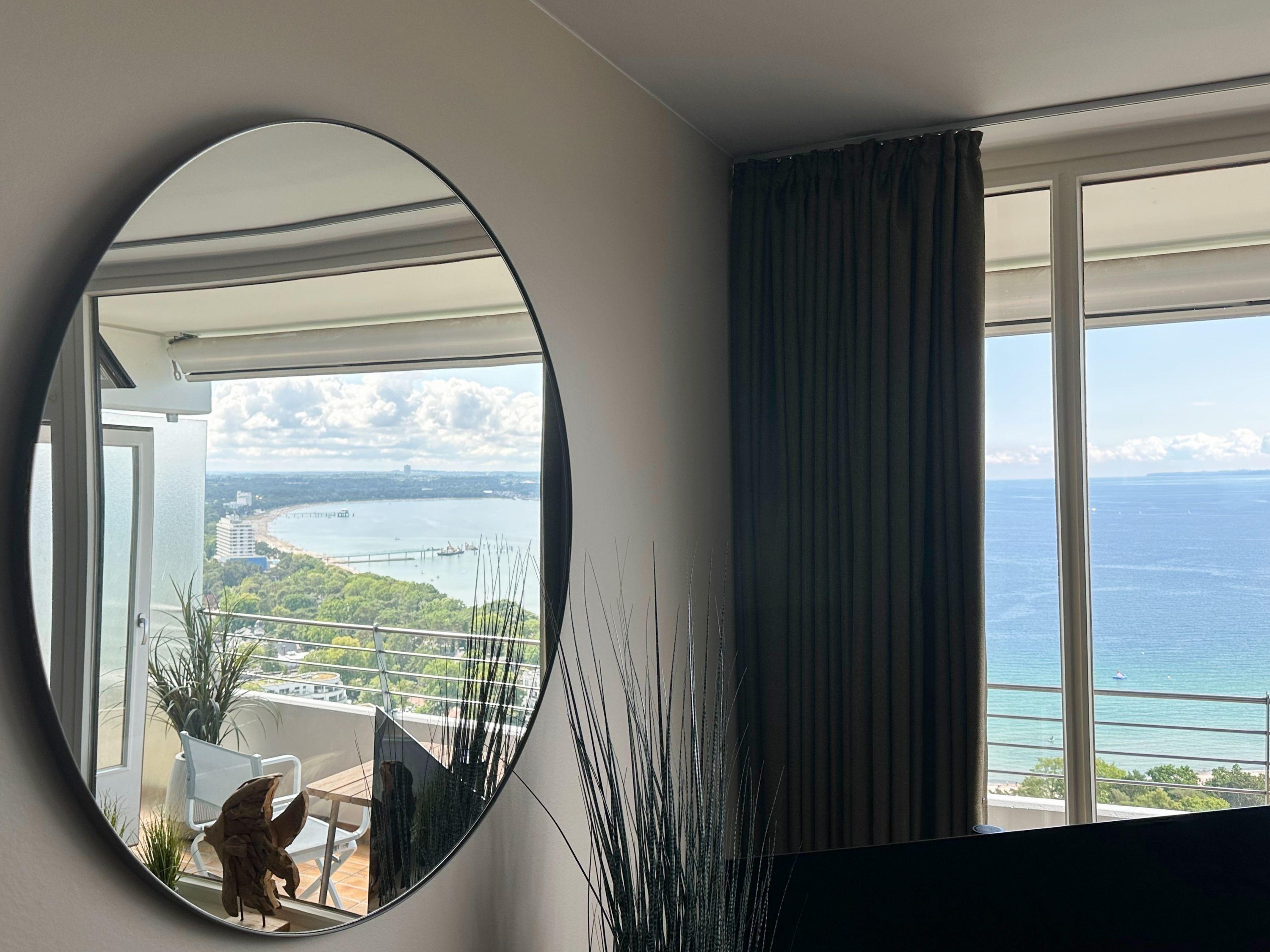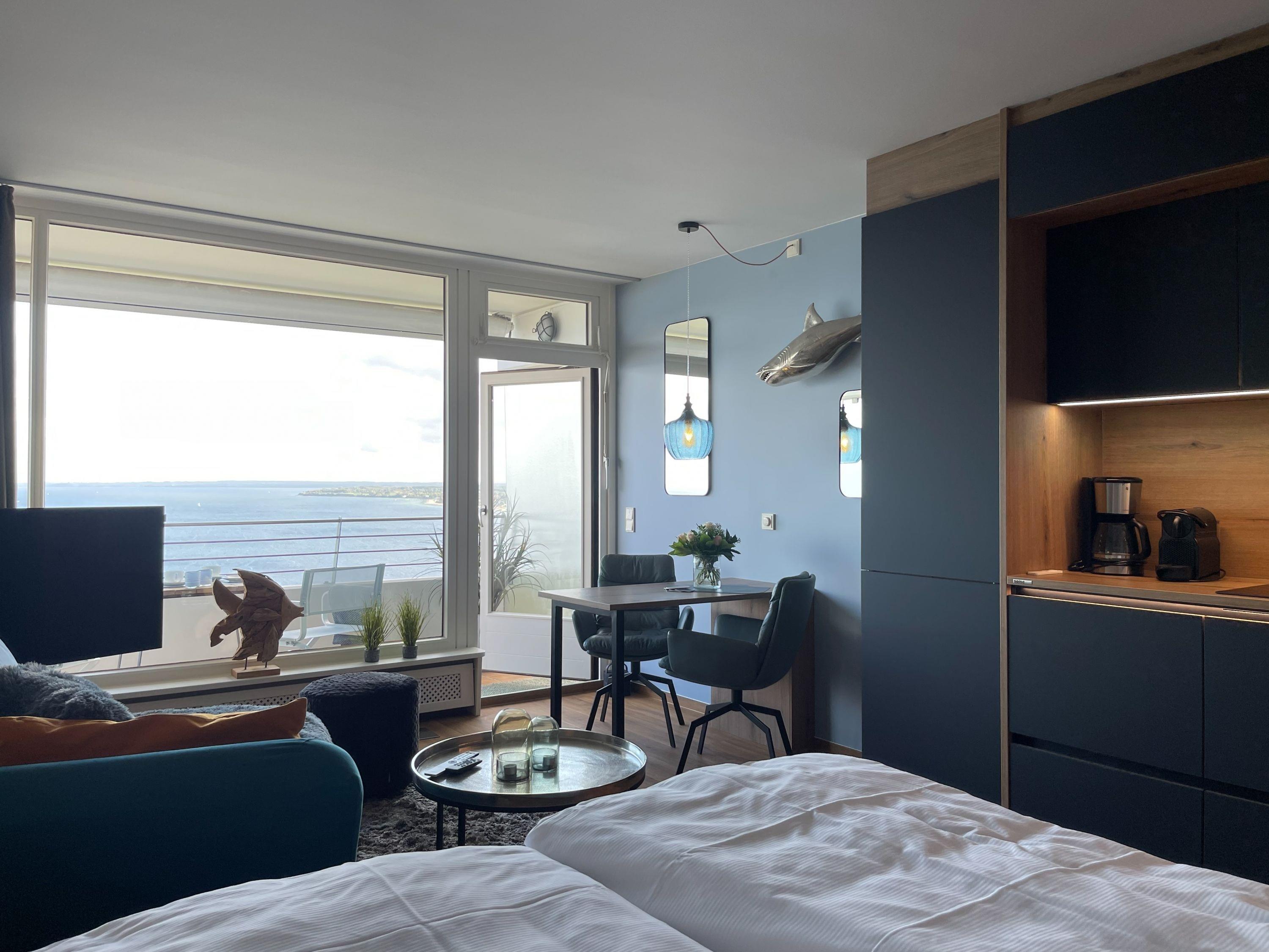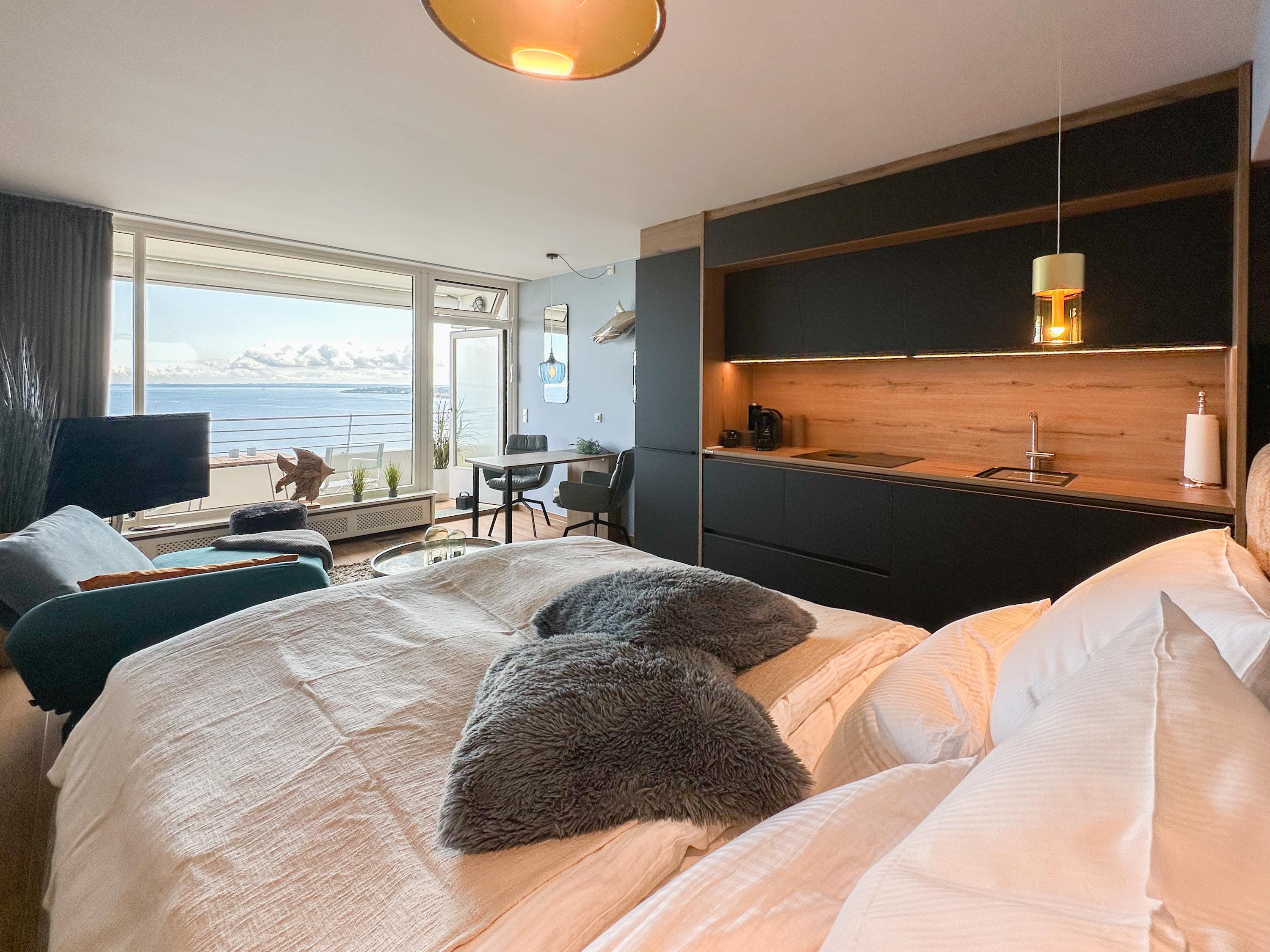 Aufwachen mit traumhaftem Ostseeblick und wohl fühlen in einem herrlichen Ambiente durch warme Farben, hochwertige Materialen und exklusivem Mobiliar. Zeitgemäßer Luxus in Perfektion! Das Einraum Studio ist mit einem Boxspringbett (160x200), einem gemütlichem Sofa und einem Esstisch mit 2 bequemen Ledersesseln eingerichtet. Die äußerst hochwertige Designküche in perfekter Ausstattung fügt sich wunderbar in den Wohnraum ein, ebenso die weiteren Einbauten, die ausreichend Platz für die Urlaubsgarderobe bieten. Genießen Sie das traumhafte Meerblickpanorama aus dem Studio oder vom Balkon, der mit Gartenmöbeln und einer elektrischen Markise ausgestattet ist und bei Dunkelheit die besondere Atmosphäre der beleuchteten Lübecker Bucht. Das moderne Bad verfügt über Waschtisch, Dusche, Föhn und WC sowie ausreichend Stauraum. Die Fensterfront ist mit Verdunkelungsvorhängen versehen. WLAN steht selbstverständlich zur kostenlosen Nutzung zur Verfügung.