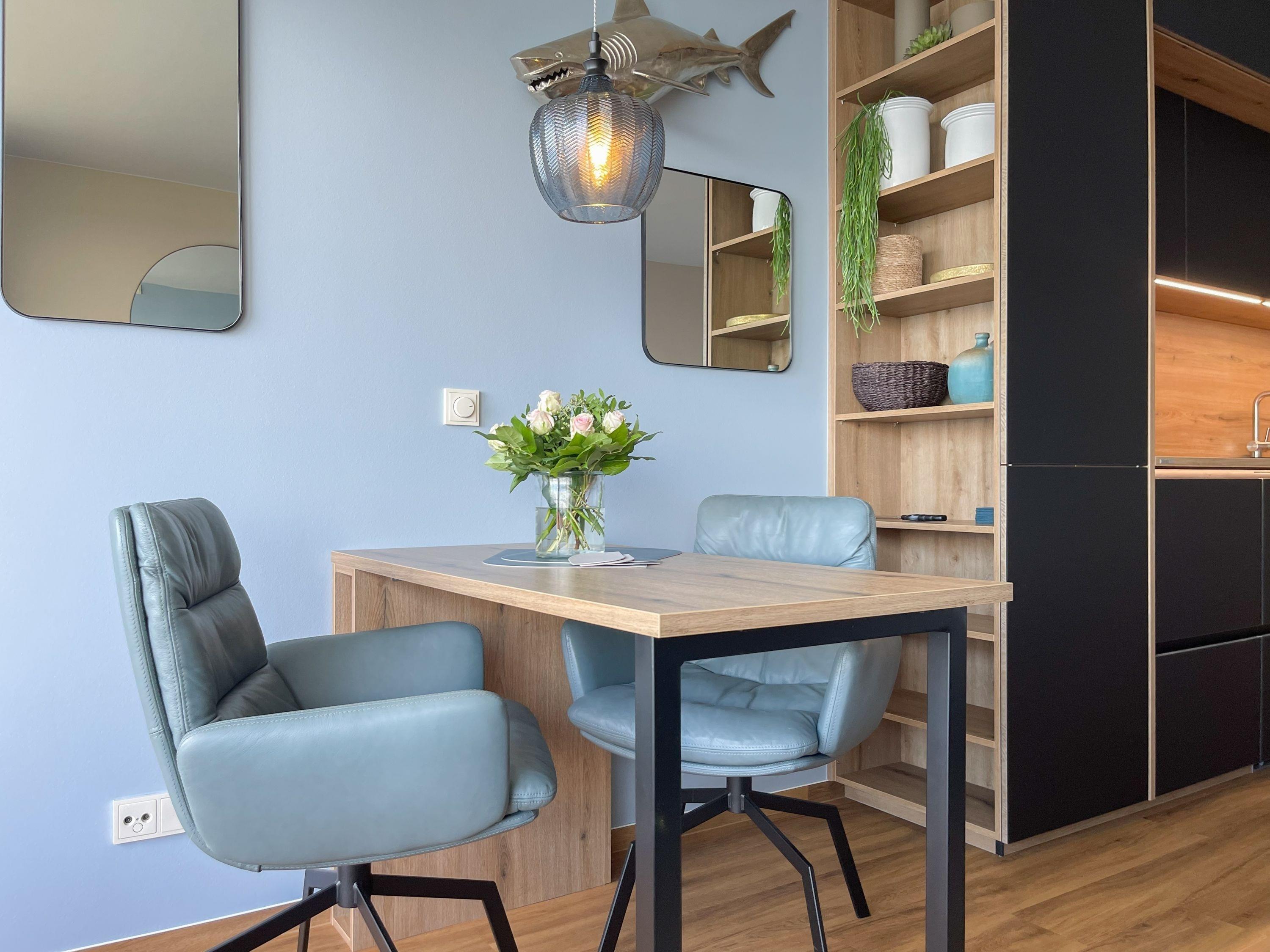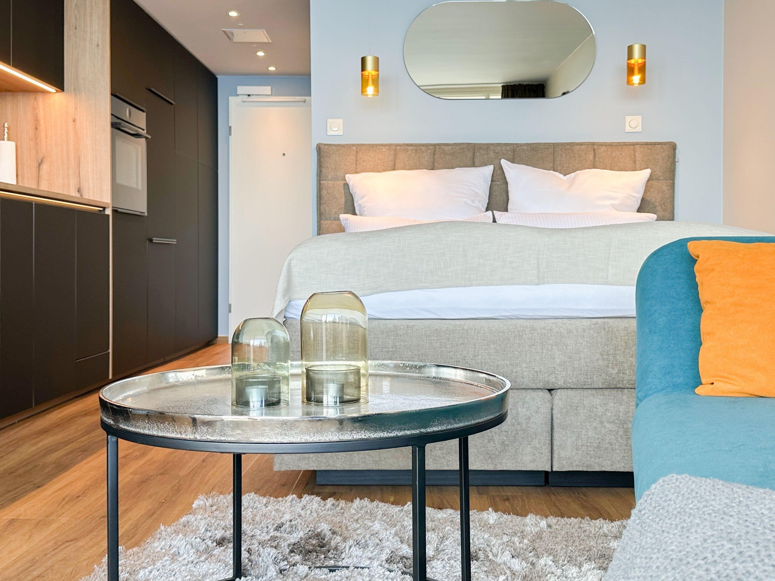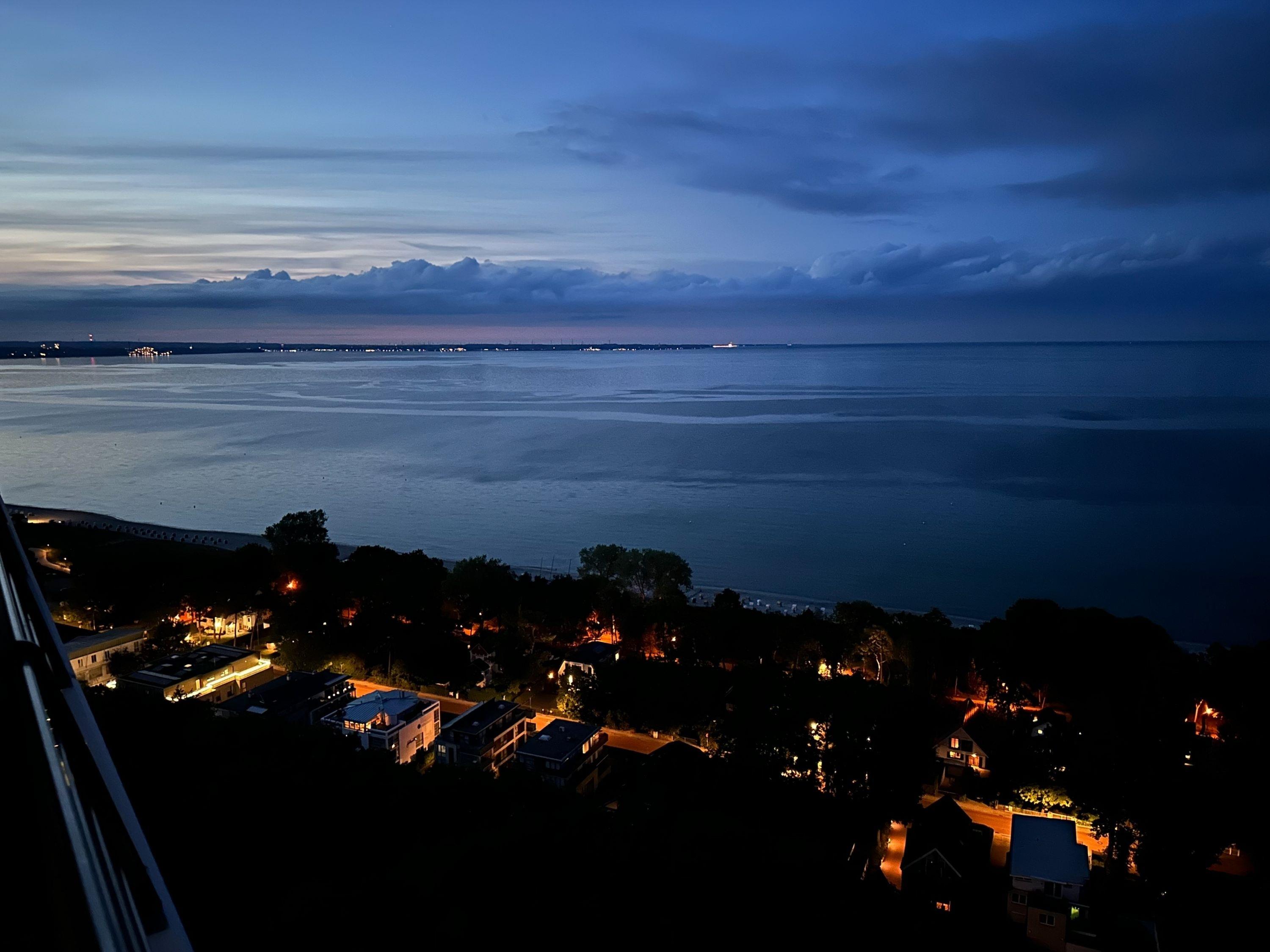 Aufwachen mit traumhaftem Ostseeblick und wohl fühlen in einem herrlichen Ambiente durch warme Farben, hochwertige Materialen und exklusivem Mobiliar. Zeitgemäßer Luxus in Perfektion! Das Einraum Studio ist mit einem Boxspringbett (160x200), einem gemütlichem Sofa und einem Esstisch mit 2 bequemen Ledersesseln eingerichtet. Die äußerst hochwertige Designküche in perfekter Ausstattung fügt sich wunderbar in den Wohnraum ein, ebenso die weiteren Einbauten, die ausreichend Platz für die Urlaubsgarderobe bieten. Genießen Sie das traumhafte Meerblickpanorama aus dem Studio oder vom Balkon, der mit Gartenmöbeln und einer elektrischen Markise ausgestattet ist und bei Dunkelheit die besondere Atmosphäre der beleuchteten Lübecker Bucht. Das moderne Bad verfügt über Waschtisch, Dusche, Föhn und WC sowie ausreichend Stauraum. Die Fensterfront ist mit Verdunkelungsvorhängen versehen. WLAN steht selbstverständlich zur kostenlosen Nutzung zur Verfügung.