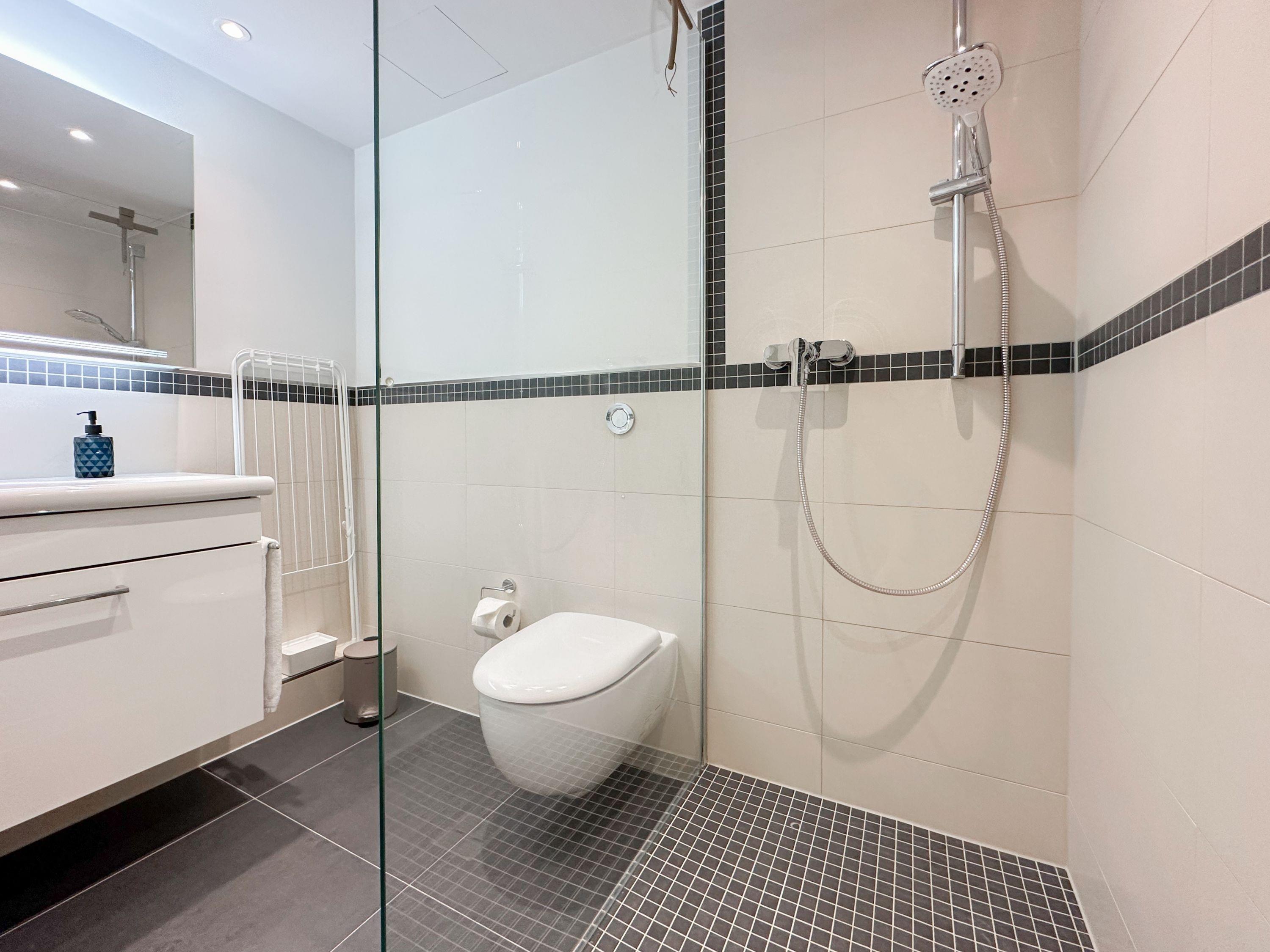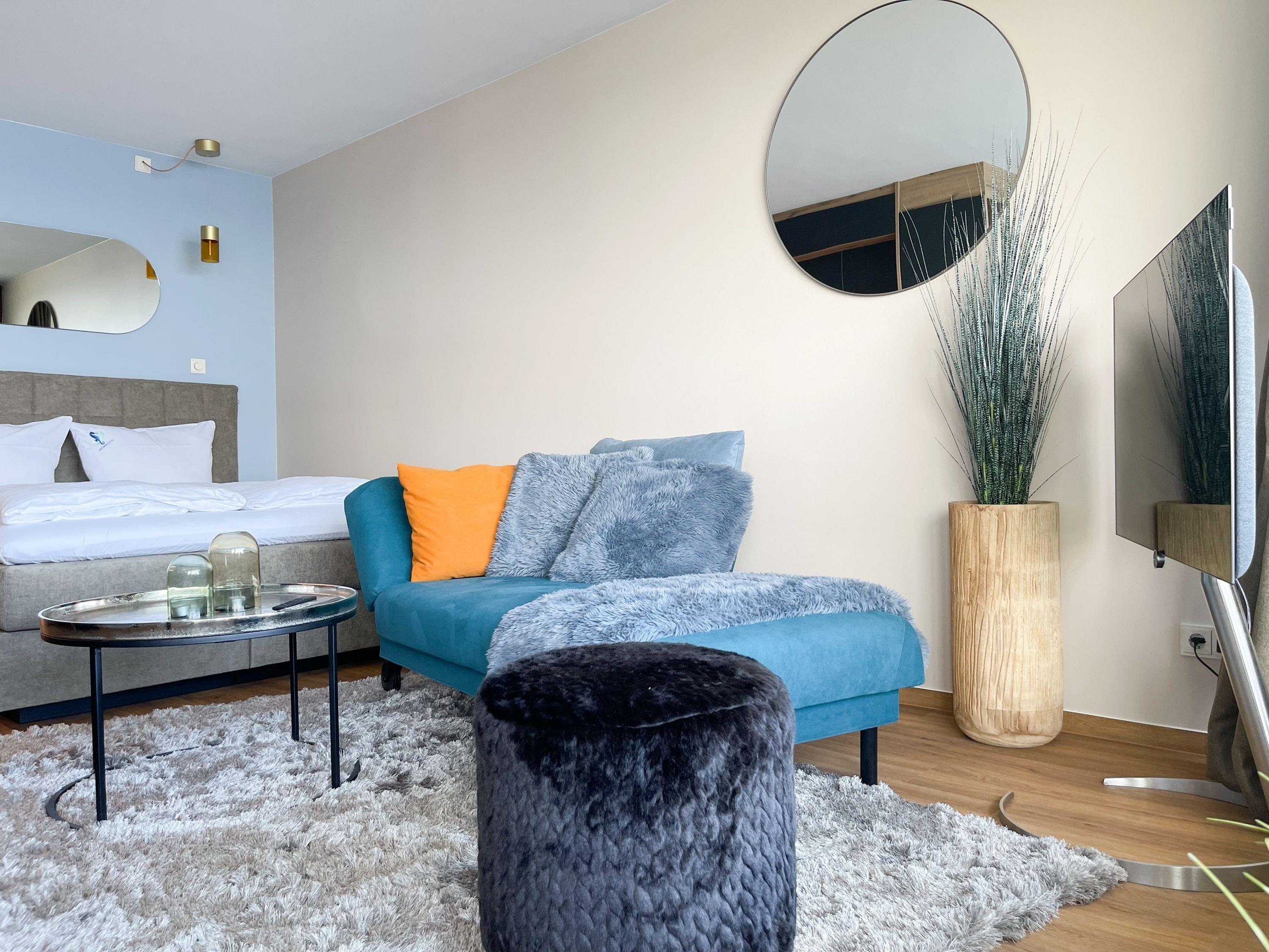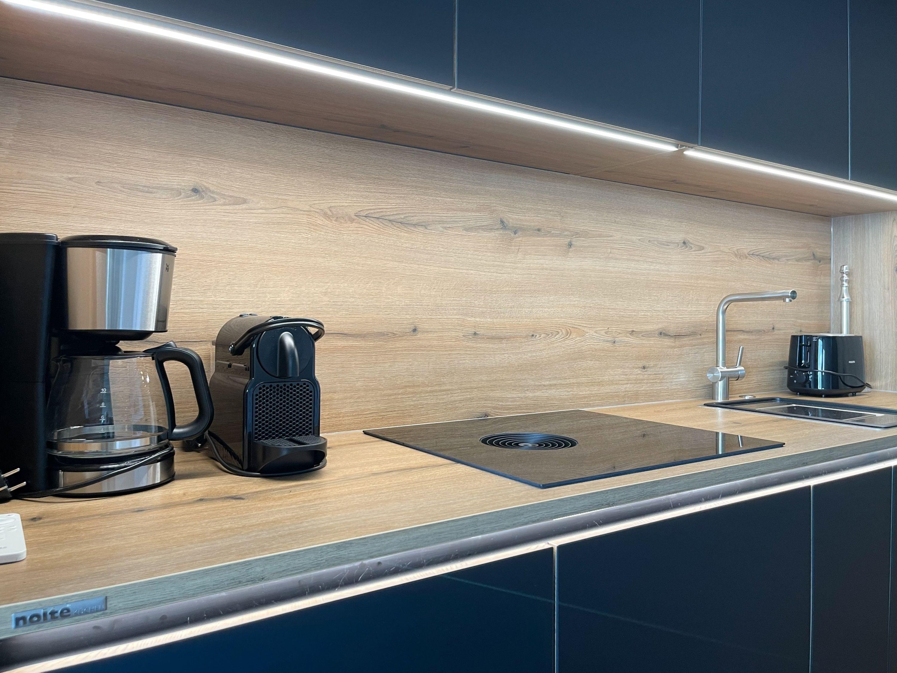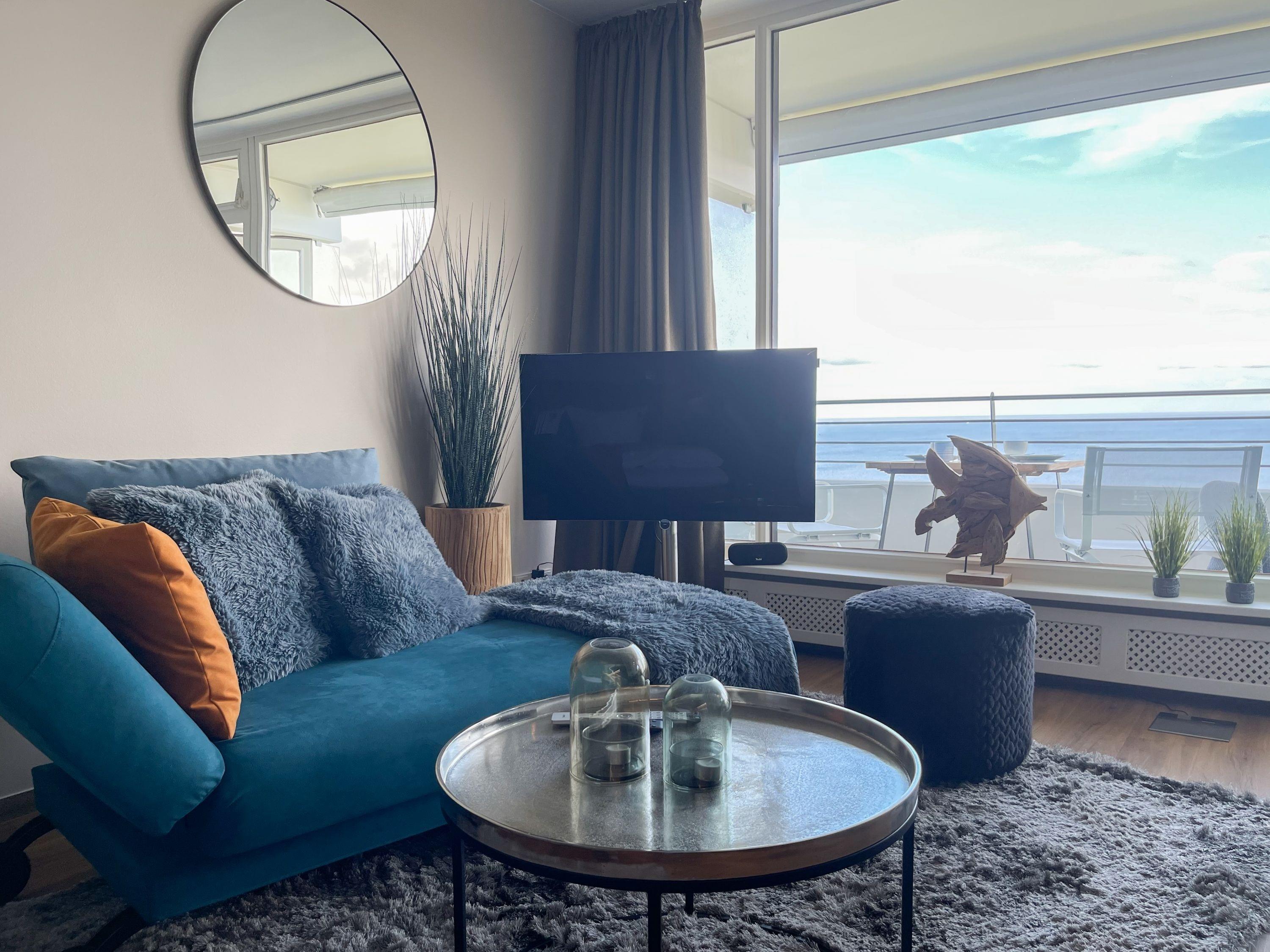 Aufwachen mit traumhaftem Ostseeblick und wohl fühlen in einem herrlichen Ambiente durch warme Farben, hochwertige Materialen und exklusivem Mobiliar. Zeitgemäßer Luxus in Perfektion! Das Einraum Studio ist mit einem Boxspringbett (160x200), einem gemütlichem Sofa und einem Esstisch mit 2 bequemen Ledersesseln eingerichtet. Die äußerst hochwertige Designküche in perfekter Ausstattung fügt sich wunderbar in den Wohnraum ein, ebenso die weiteren Einbauten, die ausreichend Platz für die Urlaubsgarderobe bieten. Genießen Sie das traumhafte Meerblickpanorama aus dem Studio oder vom Balkon, der mit Gartenmöbeln und einer elektrischen Markise ausgestattet ist und bei Dunkelheit die besondere Atmosphäre der beleuchteten Lübecker Bucht. Das moderne Bad verfügt über Waschtisch, Dusche, Föhn und WC sowie ausreichend Stauraum. Die Fensterfront ist mit Verdunkelungsvorhängen versehen. WLAN steht selbstverständlich zur kostenlosen Nutzung zur Verfügung.