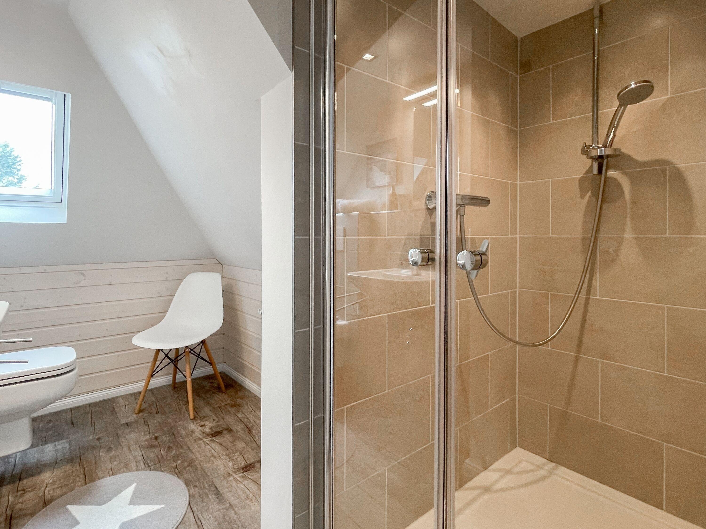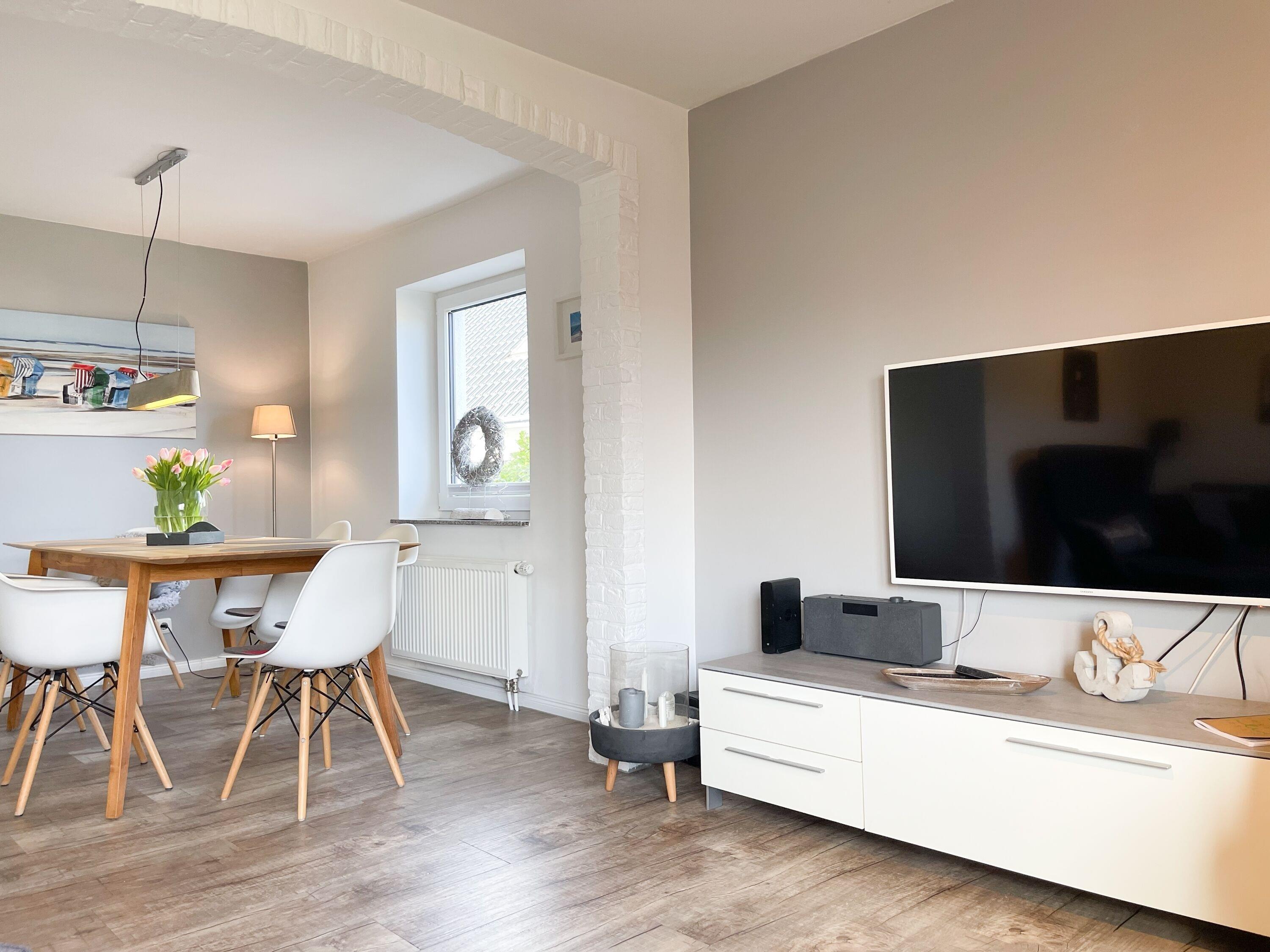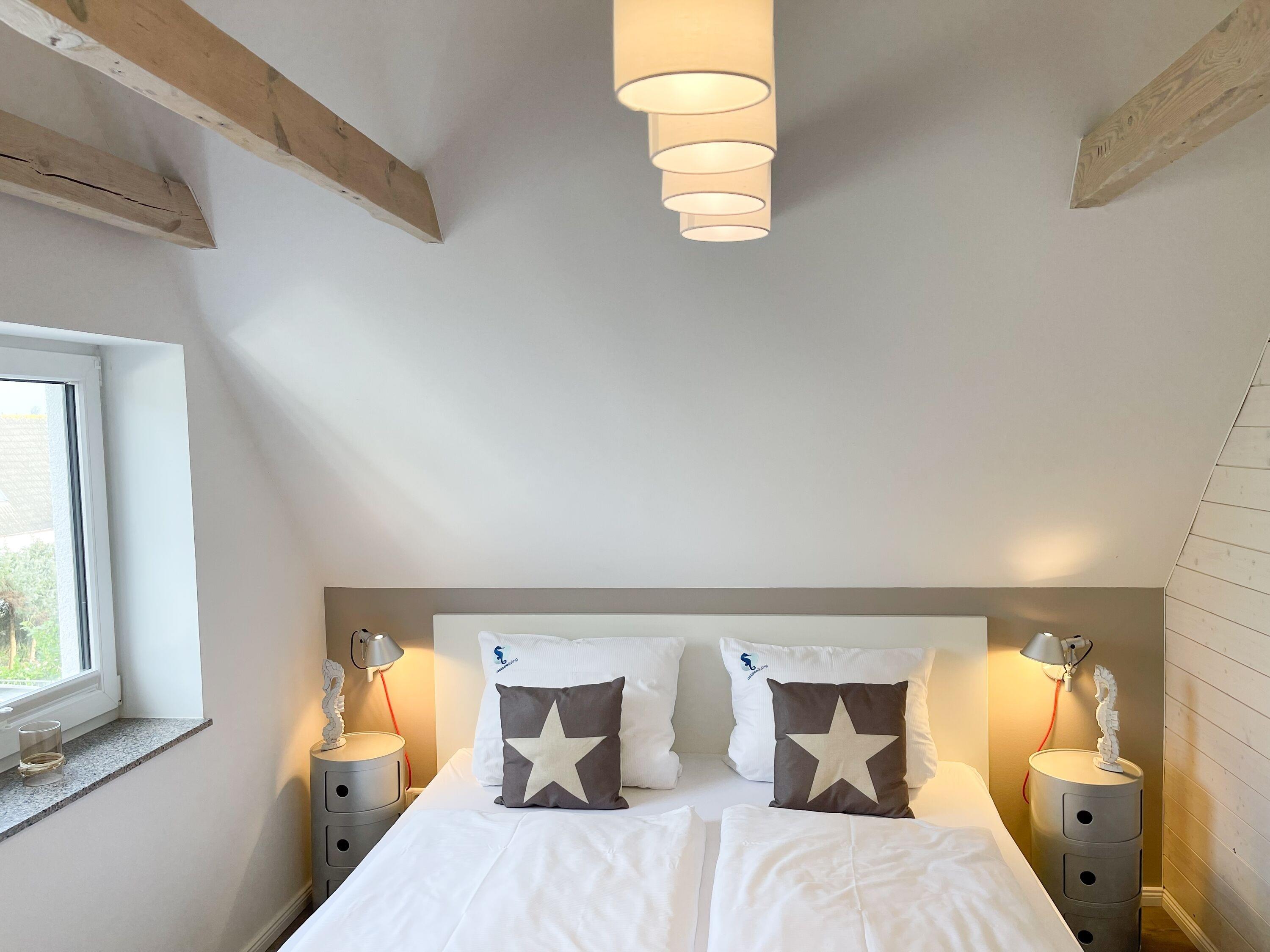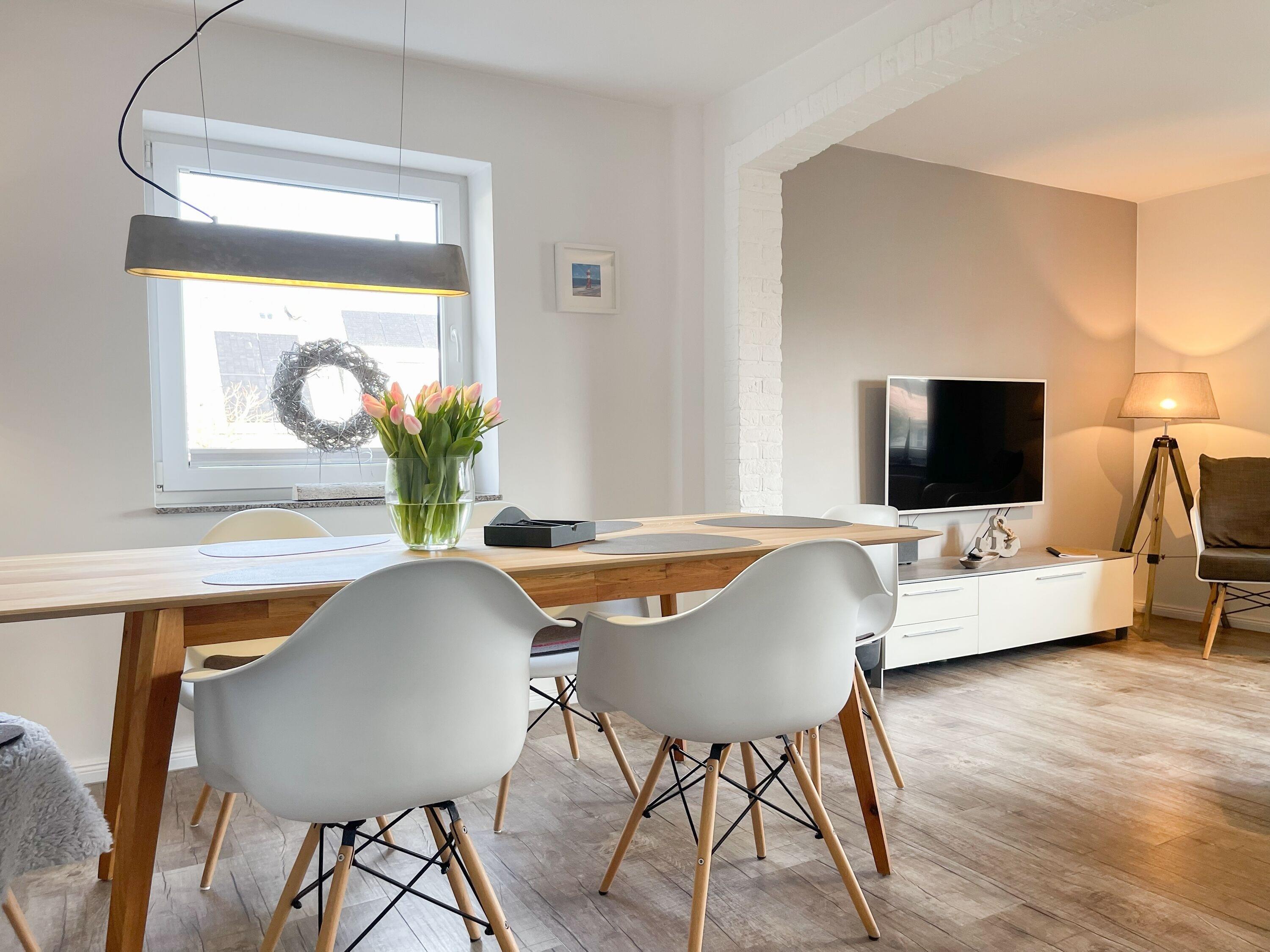 Mittelpunkt des Hauses bildet ein großzügig angelegter, heller Wohnbereich, hochwertig und geschmackvoll eingerichtet (TV, Hifi Anlage, WLAN) mit einem angrenzenden Essbereich, der ausreichend Platz für 6 Personen bietet. Die abgeschlossene Küche [nbsp]ist bestens ausgestattet. Der Bartresen mit zwei Barhockern ist als kleiner Frühstücksbereich oder Treffpunkt für gemeinsames Kochen gedacht. Ein hochwertiges Bad mit Dusche und Badewanne ist ebenfalls im Erdgeschoss untergebracht. Im Obergeschoss befindet sich ein Schlafzimmer mit zwei Einzelbetten (80x200) und ein modernes Duschbad en-suite sowie ein äußerst großzügiges Schlafzimmer mit einem Doppelbett (180x200), TV und Einbauschrank. Ein weiteres kleines Schlafzimmer ist mit einem Einzelbett, Sessel und Kommode eingerichtet.