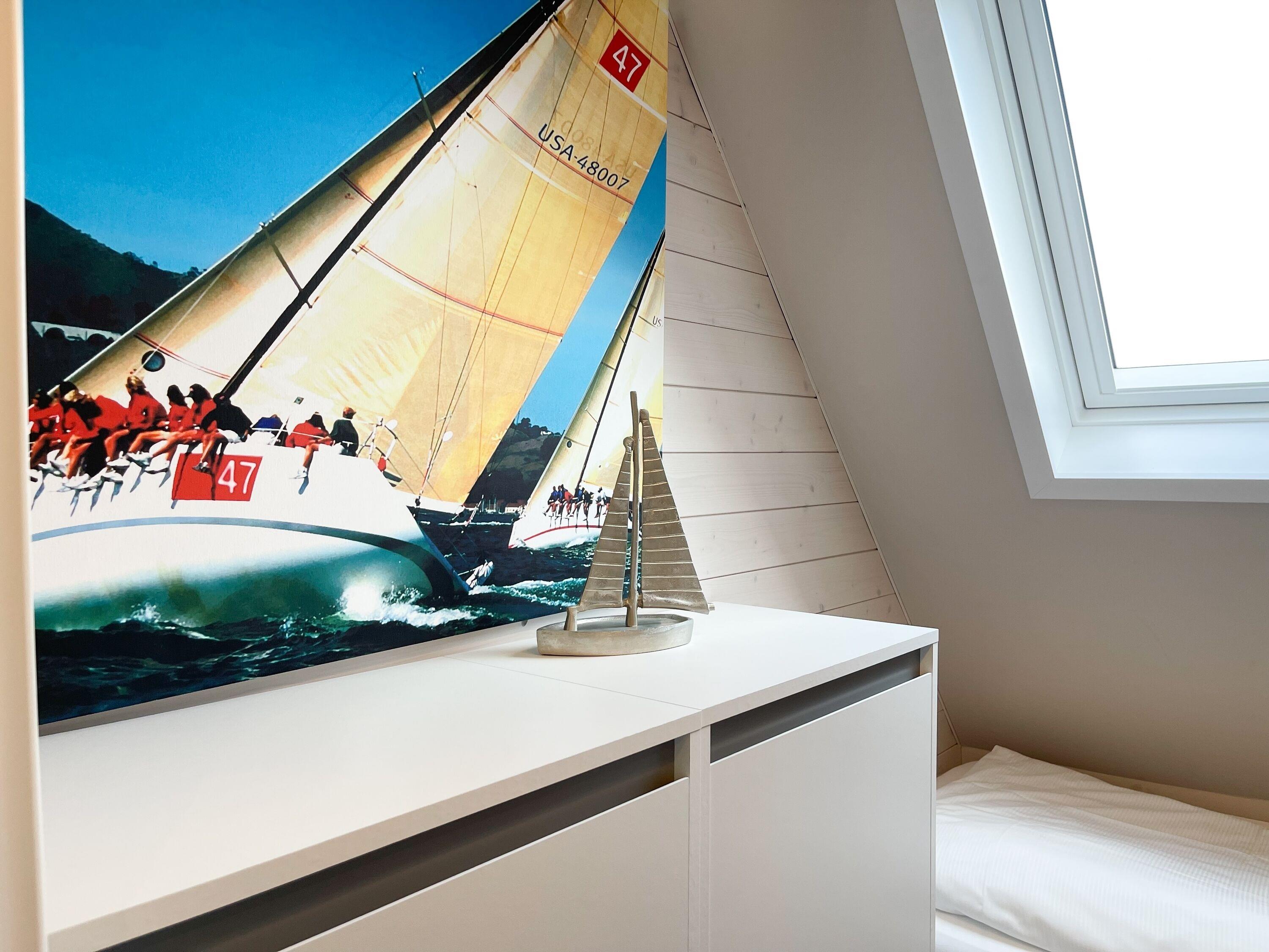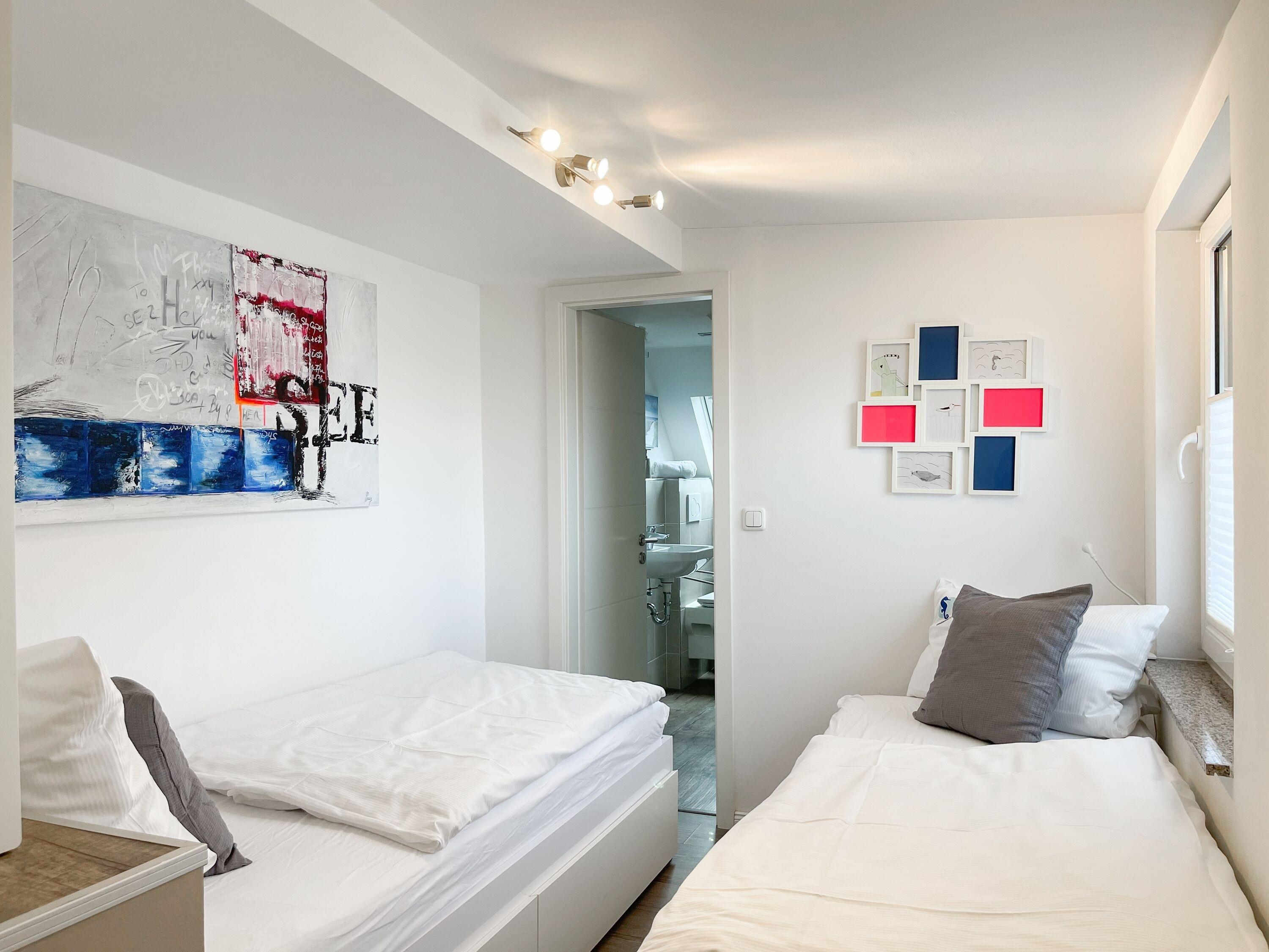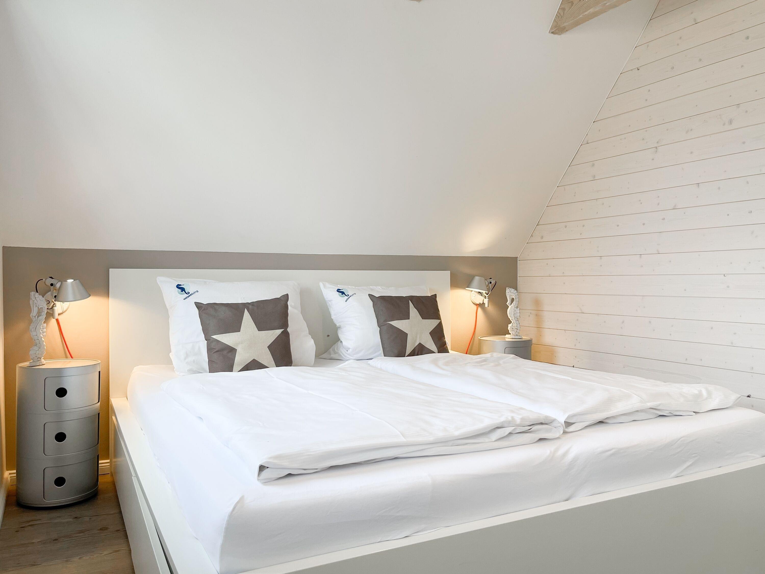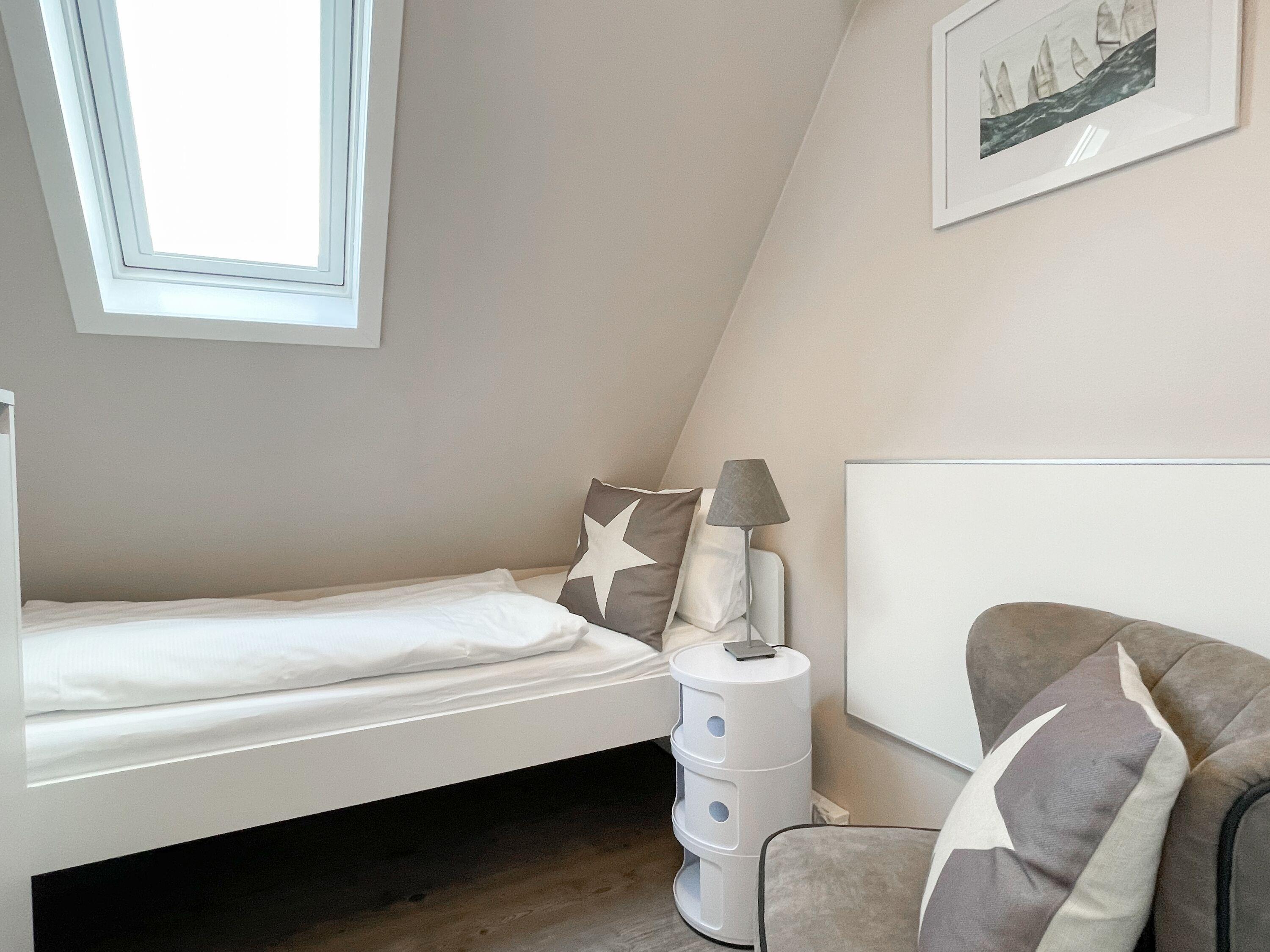 Mittelpunkt des Hauses bildet ein großzügig angelegter, heller Wohnbereich, hochwertig und geschmackvoll eingerichtet (TV, Hifi Anlage, WLAN) mit einem angrenzenden Essbereich, der ausreichend Platz für 6 Personen bietet. Die abgeschlossene Küche [nbsp]ist bestens ausgestattet. Der Bartresen mit zwei Barhockern ist als kleiner Frühstücksbereich oder Treffpunkt für gemeinsames Kochen gedacht. Ein hochwertiges Bad mit Dusche und Badewanne ist ebenfalls im Erdgeschoss untergebracht. Im Obergeschoss befindet sich ein Schlafzimmer mit zwei Einzelbetten (80x200) und ein modernes Duschbad en-suite sowie ein äußerst großzügiges Schlafzimmer mit einem Doppelbett (180x200), TV und Einbauschrank. Ein weiteres kleines Schlafzimmer ist mit einem Einzelbett, Sessel und Kommode eingerichtet.