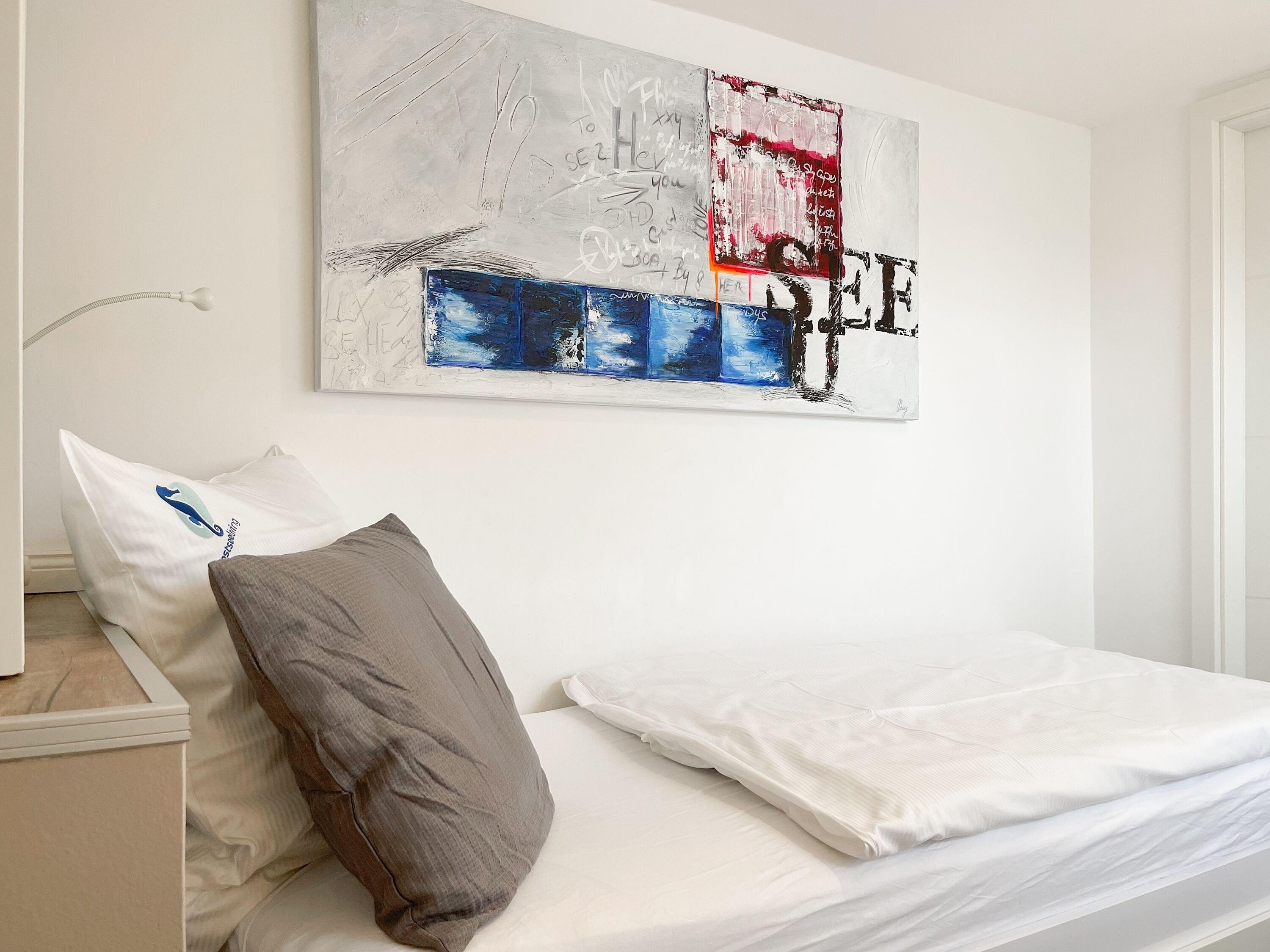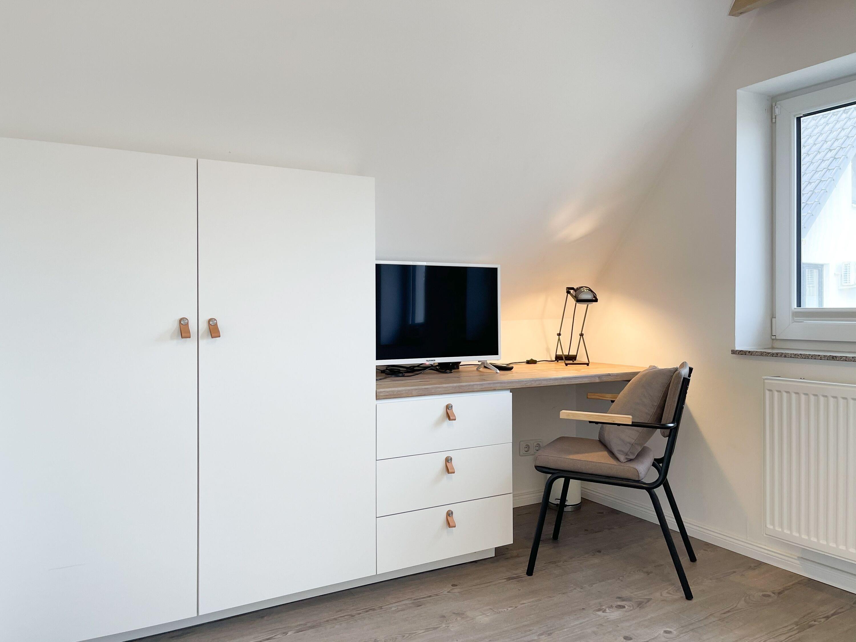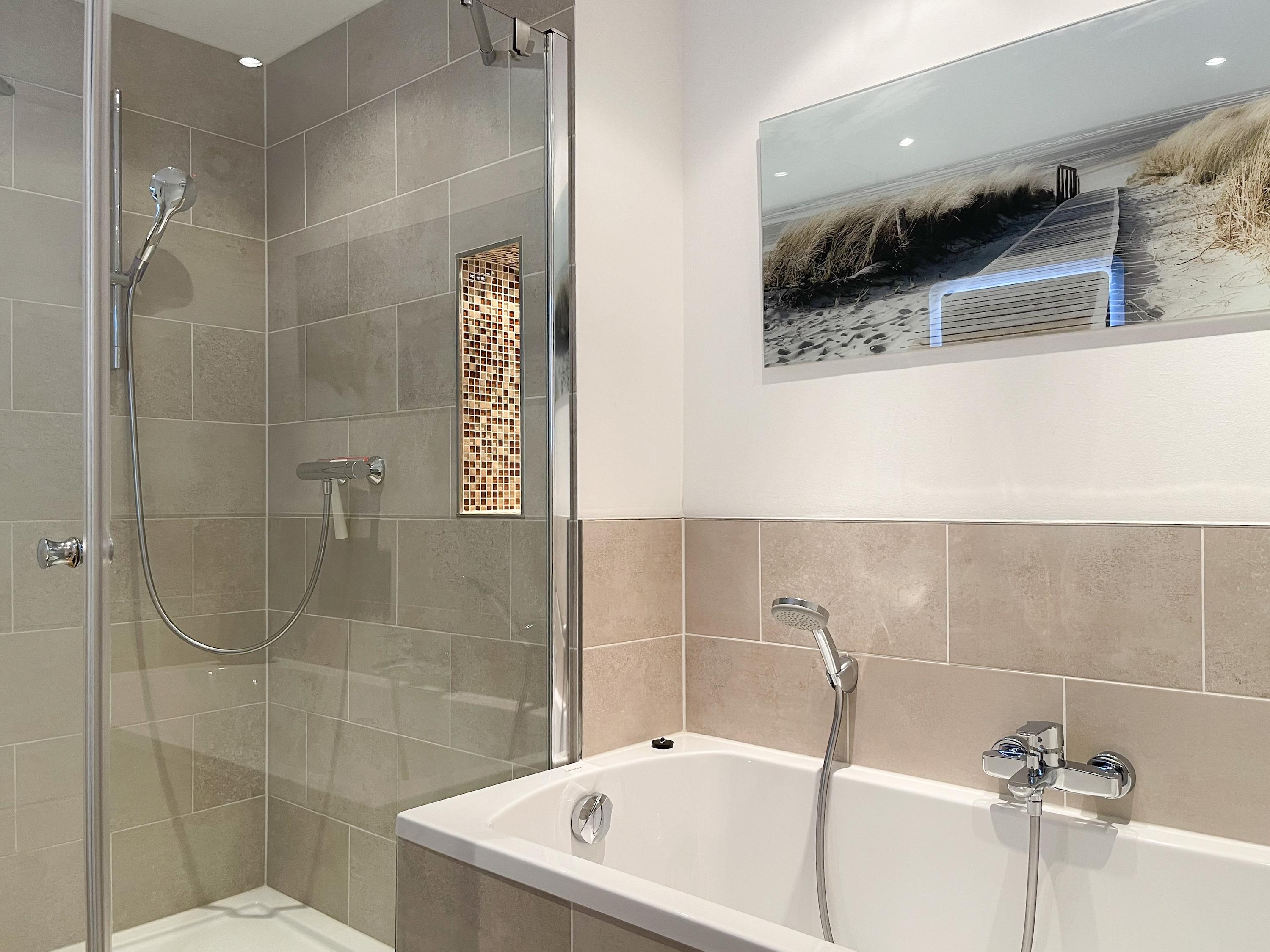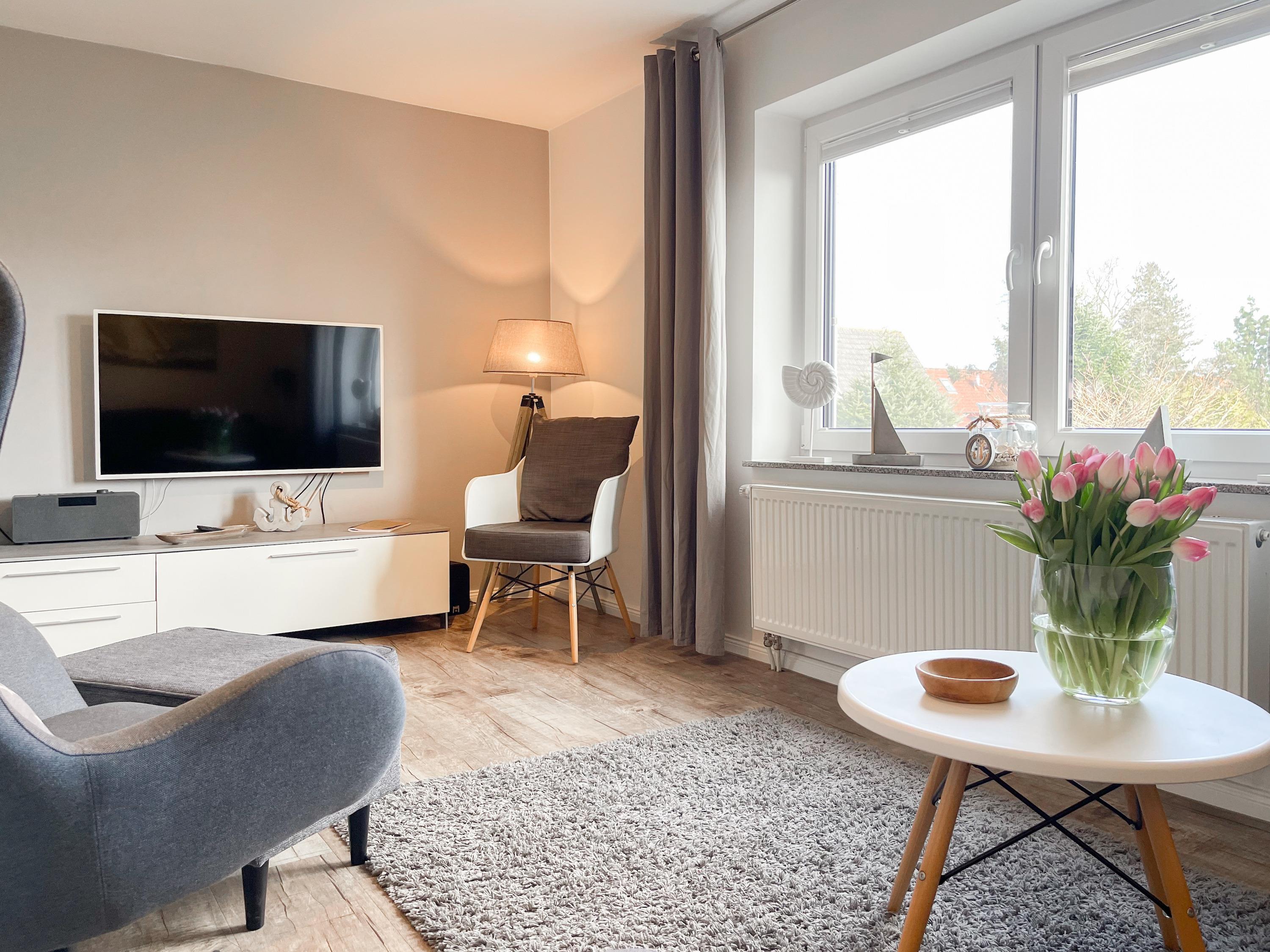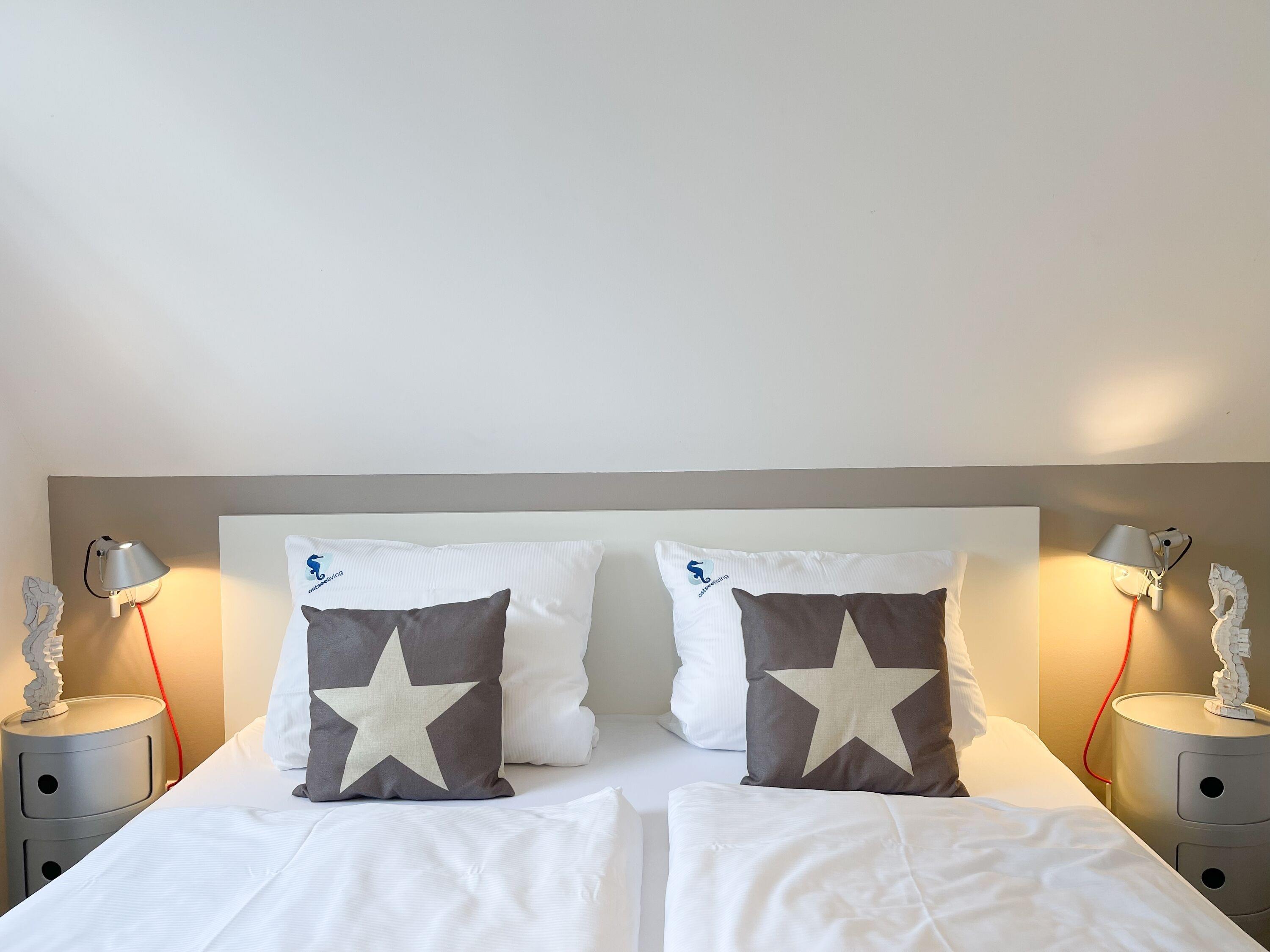 Mittelpunkt des Hauses bildet ein großzügig angelegter, heller Wohnbereich, hochwertig und geschmackvoll eingerichtet (TV, Hifi Anlage, WLAN) mit einem angrenzenden Essbereich, der ausreichend Platz für 6 Personen bietet. Die abgeschlossene Küche [nbsp]ist bestens ausgestattet. Der Bartresen mit zwei Barhockern ist als kleiner Frühstücksbereich oder Treffpunkt für gemeinsames Kochen gedacht. Ein hochwertiges Bad mit Dusche und Badewanne ist ebenfalls im Erdgeschoss untergebracht. Im Obergeschoss befindet sich ein Schlafzimmer mit zwei Einzelbetten (80x200) und ein modernes Duschbad en-suite sowie ein äußerst großzügiges Schlafzimmer mit einem Doppelbett (180x200), TV und Einbauschrank. Ein weiteres kleines Schlafzimmer ist mit einem Einzelbett, Sessel und Kommode eingerichtet.