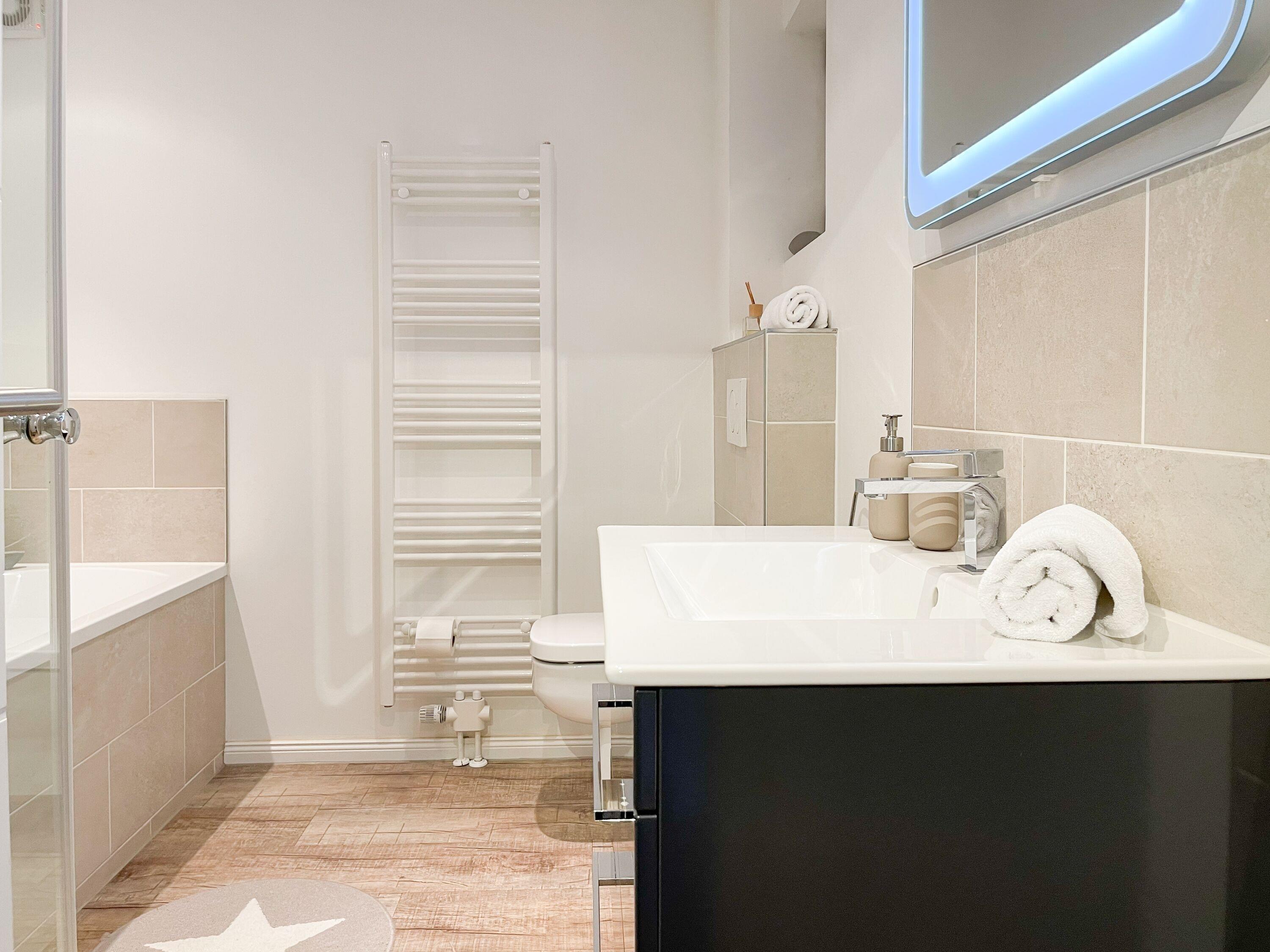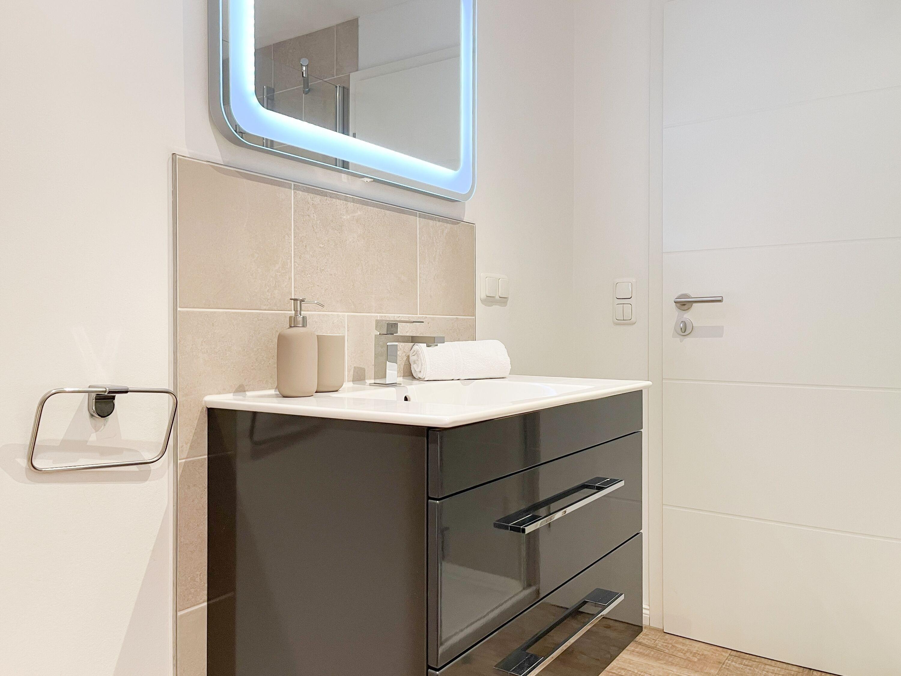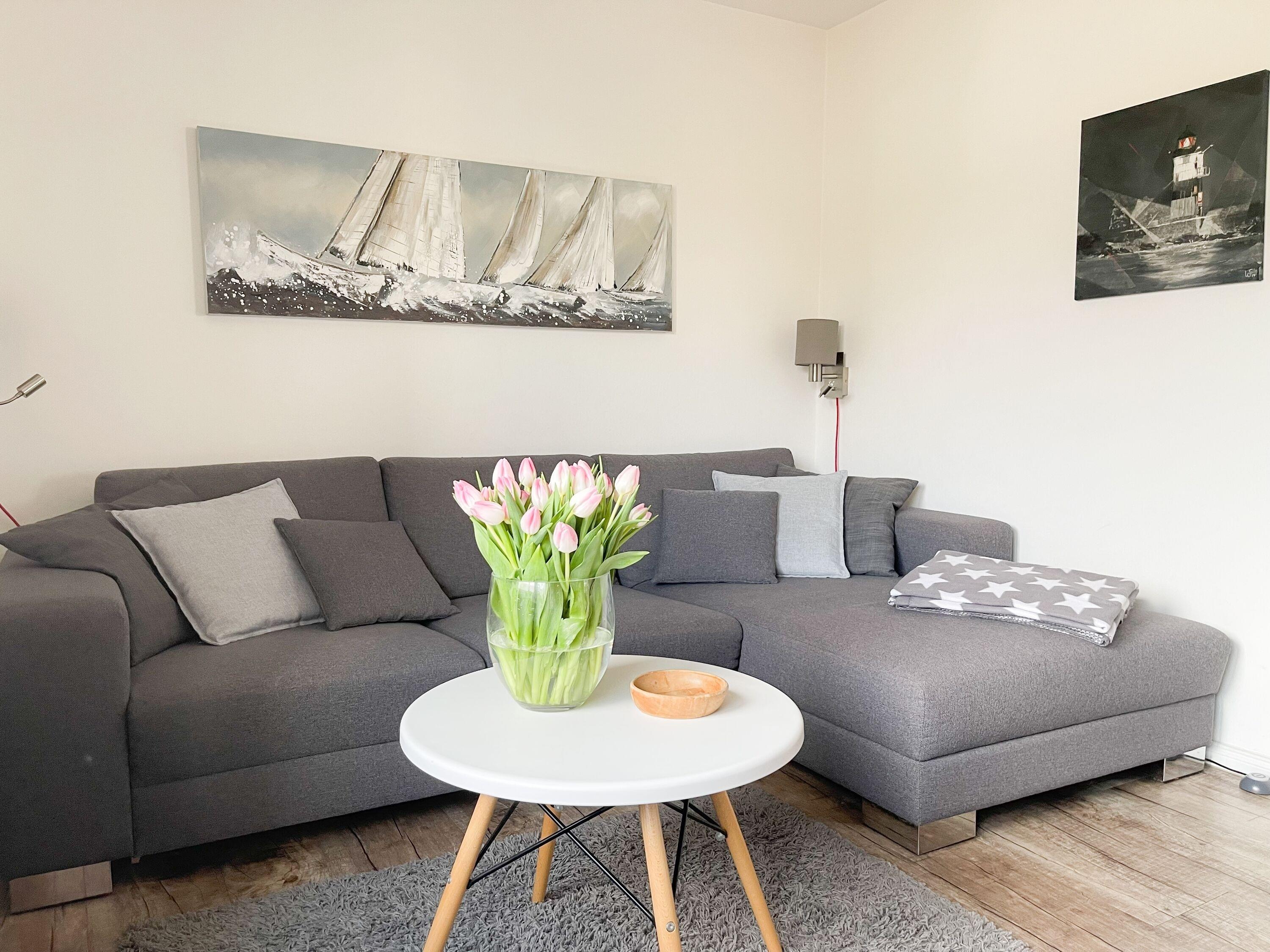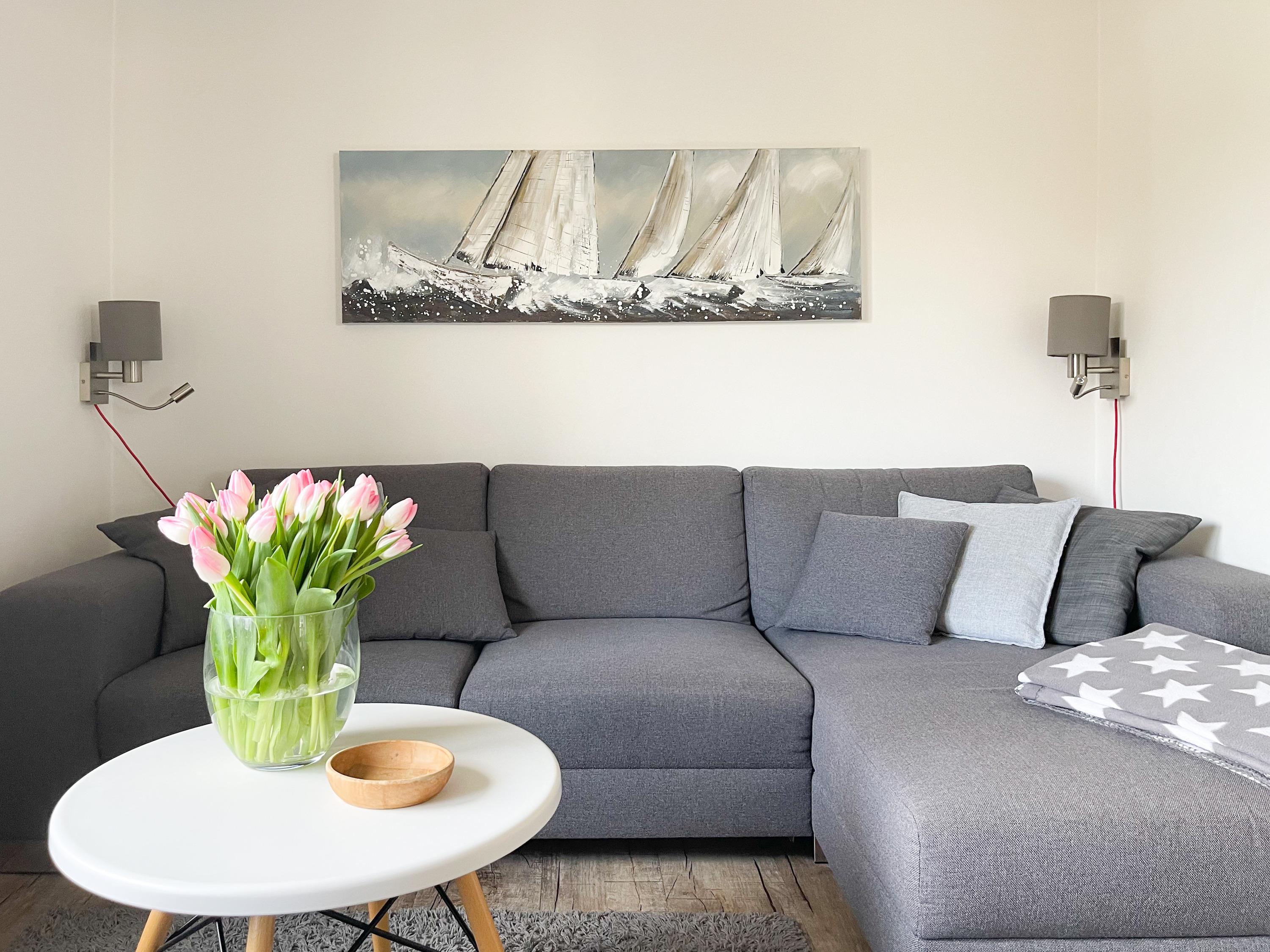 Mittelpunkt des Hauses bildet ein großzügig angelegter, heller Wohnbereich, hochwertig und geschmackvoll eingerichtet (TV, Hifi Anlage, WLAN) mit einem angrenzenden Essbereich, der ausreichend Platz für 6 Personen bietet. Die abgeschlossene Küche [nbsp]ist bestens ausgestattet. Der Bartresen mit zwei Barhockern ist als kleiner Frühstücksbereich oder Treffpunkt für gemeinsames Kochen gedacht. Ein hochwertiges Bad mit Dusche und Badewanne ist ebenfalls im Erdgeschoss untergebracht. Im Obergeschoss befindet sich ein Schlafzimmer mit zwei Einzelbetten (80x200) und ein modernes Duschbad en-suite sowie ein äußerst großzügiges Schlafzimmer mit einem Doppelbett (180x200), TV und Einbauschrank. Ein weiteres kleines Schlafzimmer ist mit einem Einzelbett, Sessel und Kommode eingerichtet.