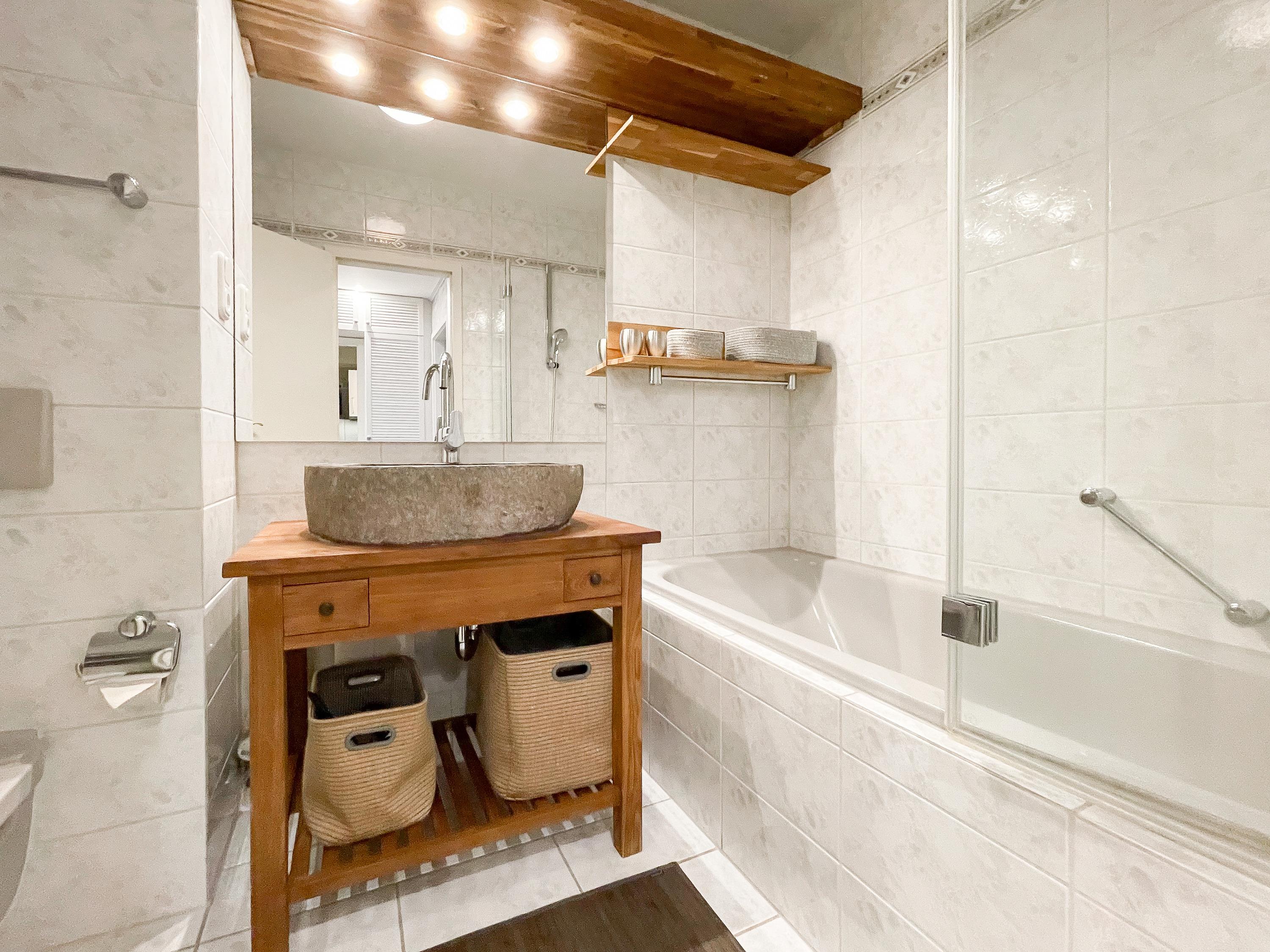 Zu der Wohnung gehört ein Tiefgaragenstellplatz (Tor-Durchfahrtshöhe max. 1,90 m), dort können auch 2 Fahrräder vor dem Fahrzeug abgestellt werden. Das Tor ist von innen über den Schalter zu öffnen.