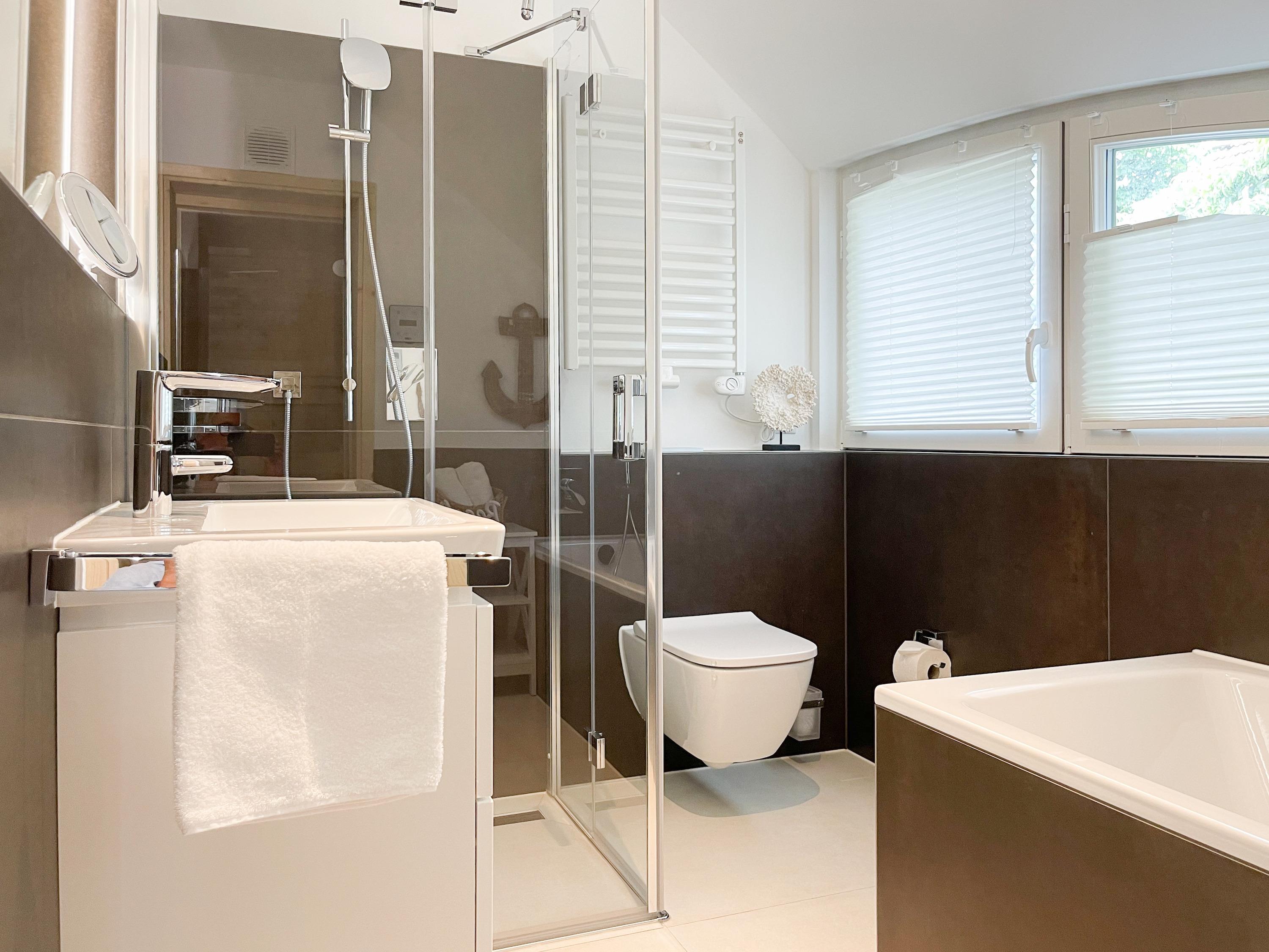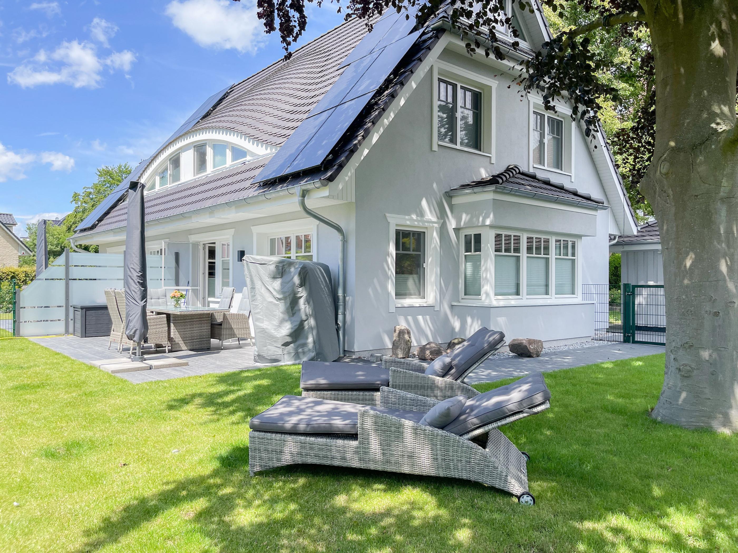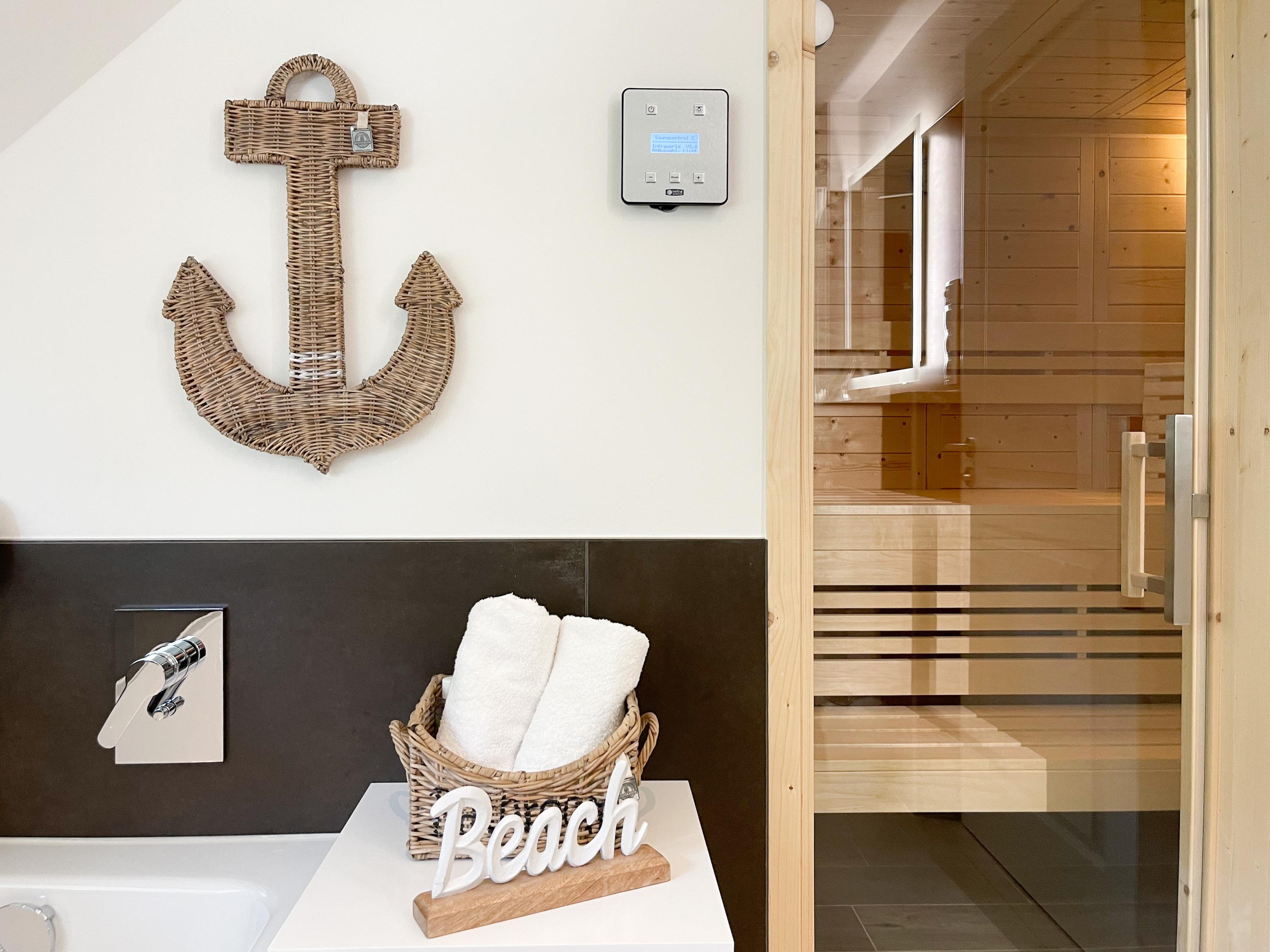 Es erwartet Sie eine wunderschönes Doppelhaus, das bereits beim Eintreten Behaglichkeit und Wohlbefinden spüren läßt. Warme Farben, viel Licht und die hochwertige Einrichtung sorgen für einen hohen Wohnstandard in einer wunderbaren Atmosphäre. Mit 3 Schlafzimmern, zwei Bädern und Sauna bietet das Haus auf[nbsp] über 100 qm Wohnfläche ausreichend Raum für 5 Personen, um einen erholsamen Ostseeurlaub ganz nah am Strand zu verleben. Im Erdgeschoss erwartet Sie ein lichtdurchfluteter Wohn- Essbereich, großzügig geschnitten und hochwertig möbliert. Die integrierte Einbauküche in perfekter Ausstattung eignet sich hervorragend für gemeinsames Kochen. Die vorgelagerte Sonnenterrasse in Südausrichtung ist mit Gartenmöbeln und Sonnenliegen ausgestattet und von einem privaten Gartengrundstück umgeben, das vollständig eingezäunt ist. Im Eingangsbereich befindet sich die Garderobe und ein modernes Bad mit Walk-In Dusche und Fenster. Die Waschmaschine ist im separaten Hauswirtschaftsraum untergebracht. Im Obergeschoss gibt es zwei separate Schlafzimmer, die mit Boxspringbetten (180x200), Kleiderschränken und TV eingerichtet sind. Der Zugang zu dem dritten kleinen Einzelschlafzimmer, das ebenfalls über ein Boxspringbett verfügt (90x200), erfolgt über eines der Doppelschlafzimmer. Das exklusive Wellnessbad mit Badewanne, Walk-In Dusche und integrierter Sauna befindet sich ebenfalls im Obergeschoss. Das Dachgeschoss ist für das home office mit einem Schreibtisch eingerichtet. Alle Fenster der Schlafräume sind mit Blackout Plissees versehen.