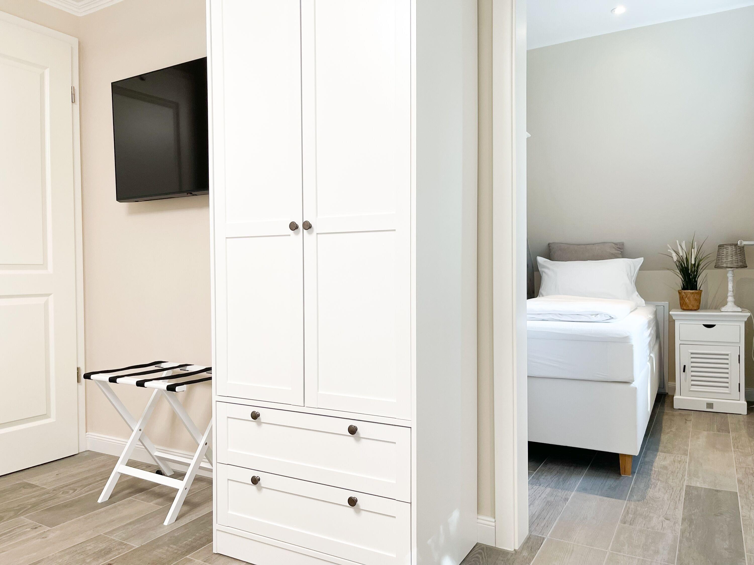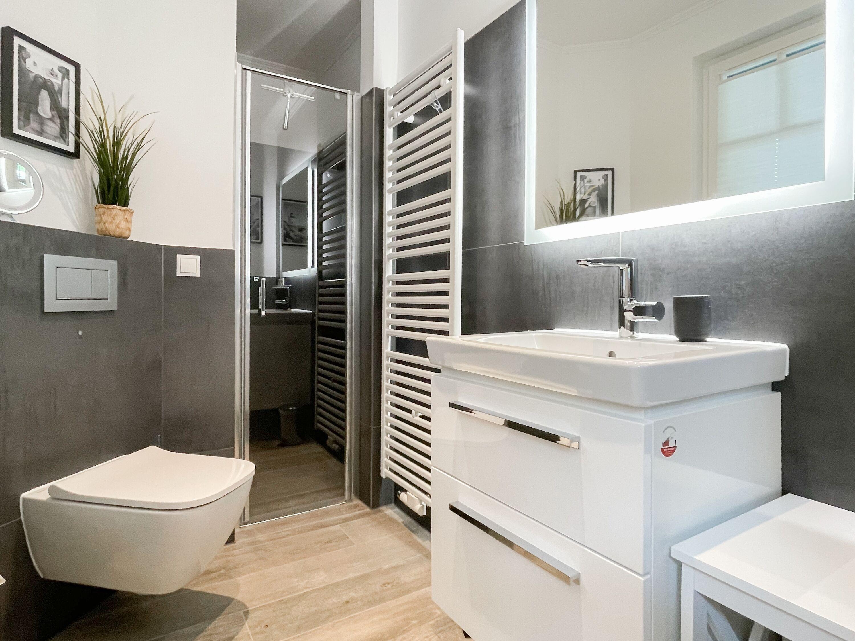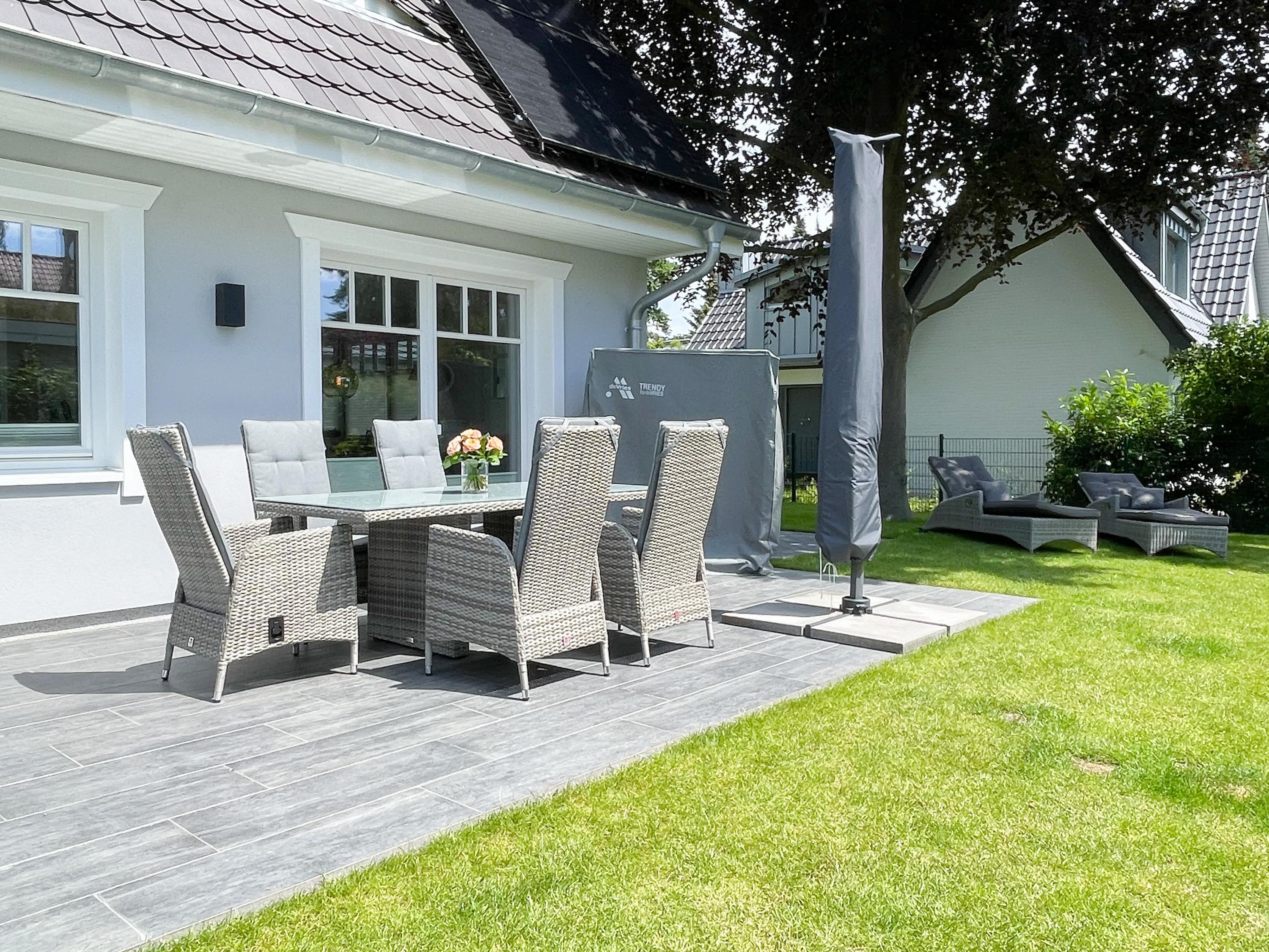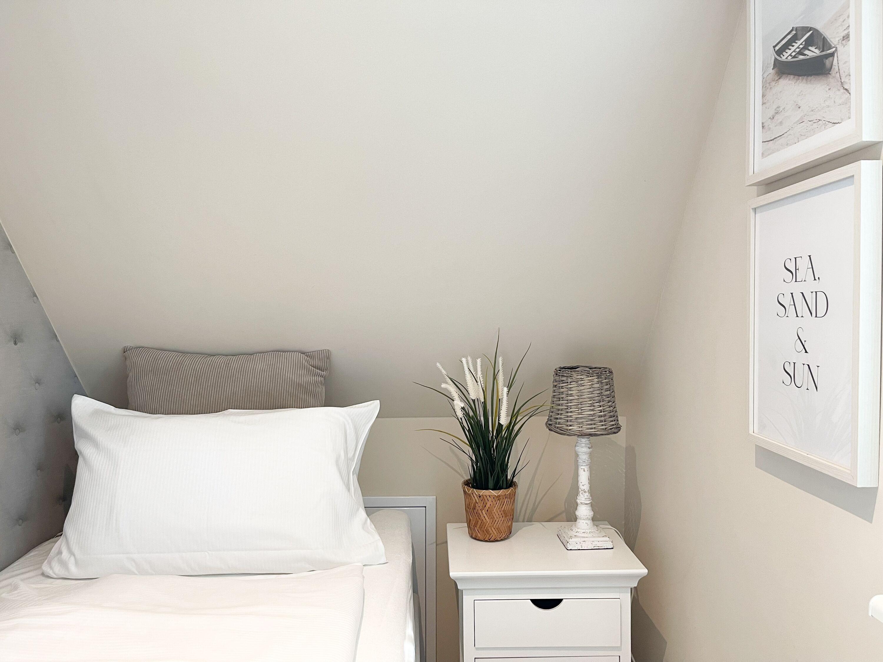 Es erwartet Sie eine wunderschönes Doppelhaus, das bereits beim Eintreten Behaglichkeit und Wohlbefinden spüren läßt. Warme Farben, viel Licht und die hochwertige Einrichtung sorgen für einen hohen Wohnstandard in einer wunderbaren Atmosphäre. Mit 3 Schlafzimmern, zwei Bädern und Sauna bietet das Haus auf[nbsp] über 100 qm Wohnfläche ausreichend Raum für 5 Personen, um einen erholsamen Ostseeurlaub ganz nah am Strand zu verleben. Im Erdgeschoss erwartet Sie ein lichtdurchfluteter Wohn- Essbereich, großzügig geschnitten und hochwertig möbliert. Die integrierte Einbauküche in perfekter Ausstattung eignet sich hervorragend für gemeinsames Kochen. Die vorgelagerte Sonnenterrasse in Südausrichtung ist mit Gartenmöbeln und Sonnenliegen ausgestattet und von einem privaten Gartengrundstück umgeben, das vollständig eingezäunt ist. Im Eingangsbereich befindet sich die Garderobe und ein modernes Bad mit Walk-In Dusche und Fenster. Die Waschmaschine ist im separaten Hauswirtschaftsraum untergebracht. Im Obergeschoss gibt es zwei separate Schlafzimmer, die mit Boxspringbetten (180x200), Kleiderschränken und TV eingerichtet sind. Der Zugang zu dem dritten kleinen Einzelschlafzimmer, das ebenfalls über ein Boxspringbett verfügt (90x200), erfolgt über eines der Doppelschlafzimmer. Das exklusive Wellnessbad mit Badewanne, Walk-In Dusche und integrierter Sauna befindet sich ebenfalls im Obergeschoss. Das Dachgeschoss ist für das home office mit einem Schreibtisch eingerichtet. Alle Fenster der Schlafräume sind mit Blackout Plissees versehen.