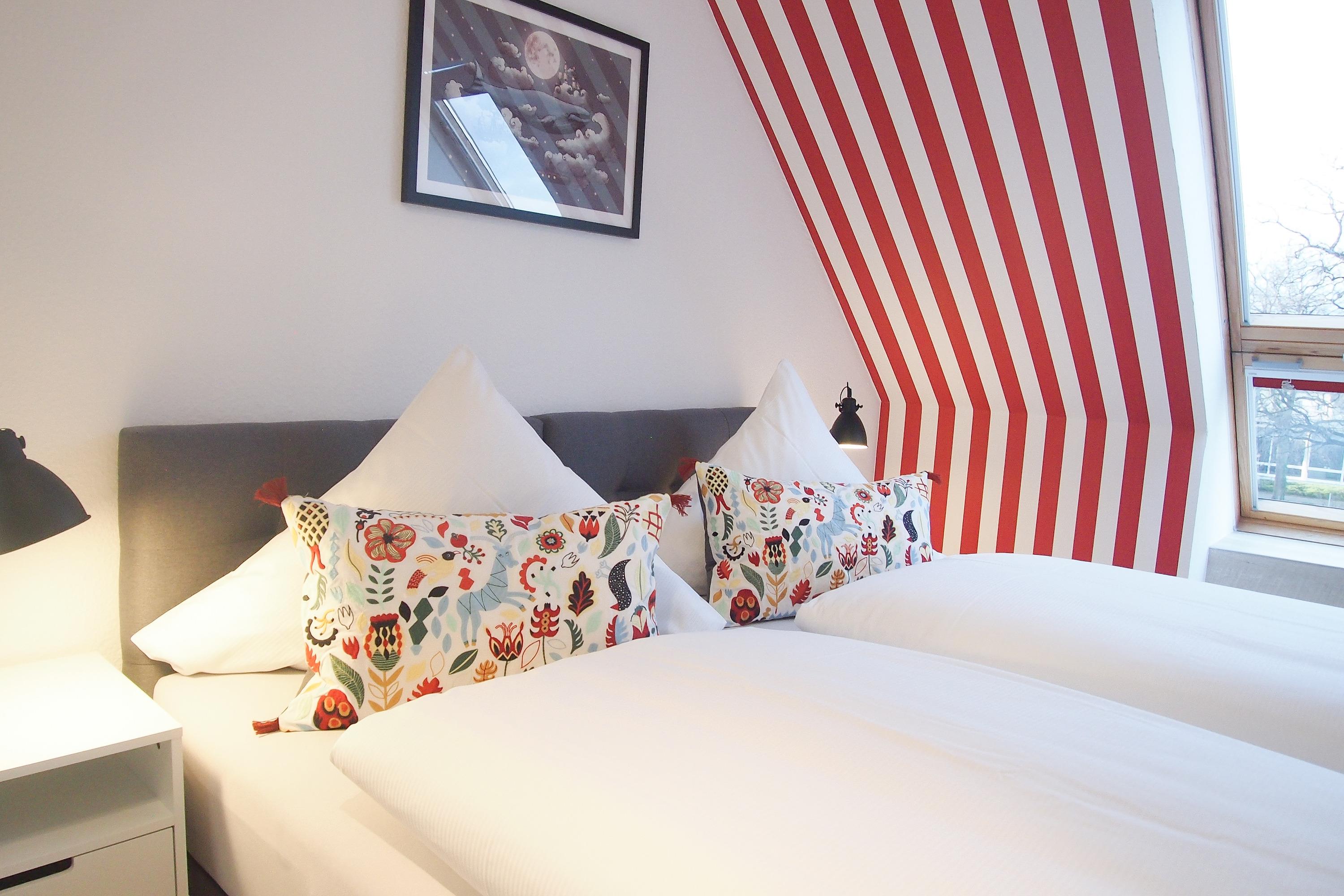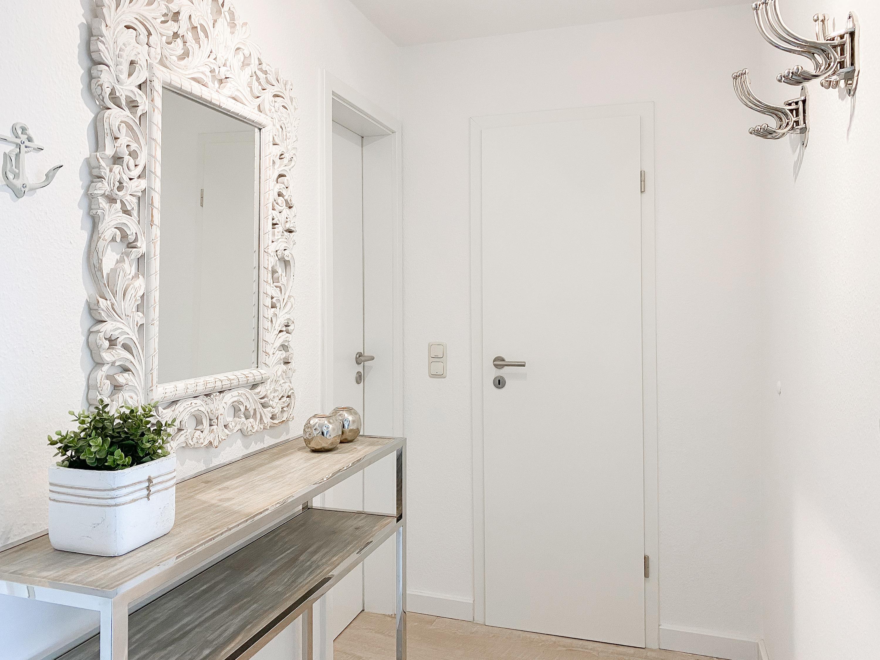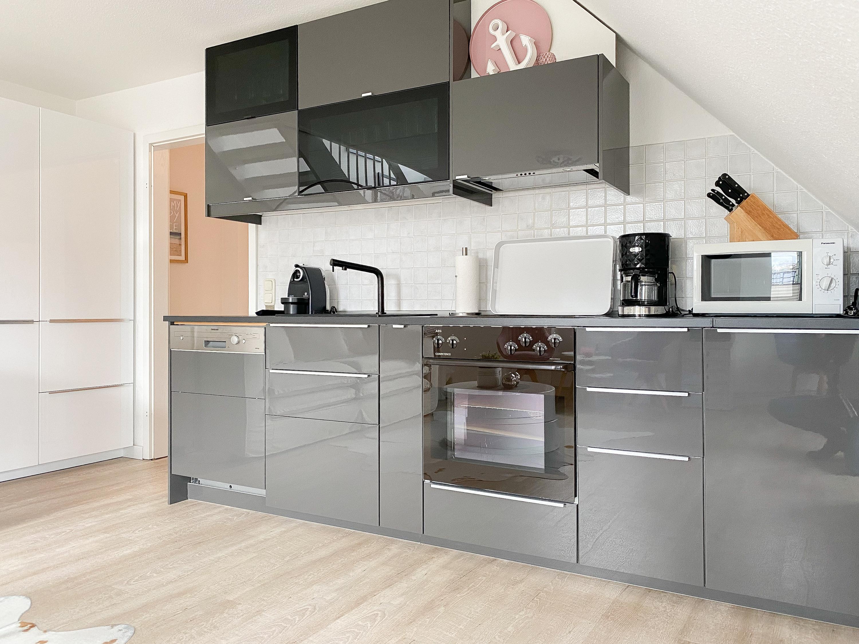 Die Ferienwohnung präsentiert sich als wunderschönes, lichtdurchflutetes Loft über 2 Ebenen in Südausrichtung. Die Wohnung verfügt über zwei Balkone und befindet sich in der obersten Etage (2. OG) des Feriendomizils Strandburg. Die hochwertige, äußerst geschmackvolle Einrichtung vermittelt ein herrliches Wohngefühl. Auf der unteren Ebene befindet sich der gemütliche Wohnbereich mit Sonnenbalkon, TV, Musikanlage und WLAN, der anschließende Essbereich und die offene, bestens ausgestattete Wohnküche sowie ein Gäste WC und ein Abstellraum mit kombiniertem Waschtrockner. Auf der oberen Ebene gibt es zwei großzügige Schlafzimmer mit Boxspringbetten, eines mit Balkon und zusätzlichem TV, ein hochwertiges Duschbad und eine gemütliche Leseecke. Die Schlafräume lassen sich mittels Plissees und Vorhängen verdunkeln.