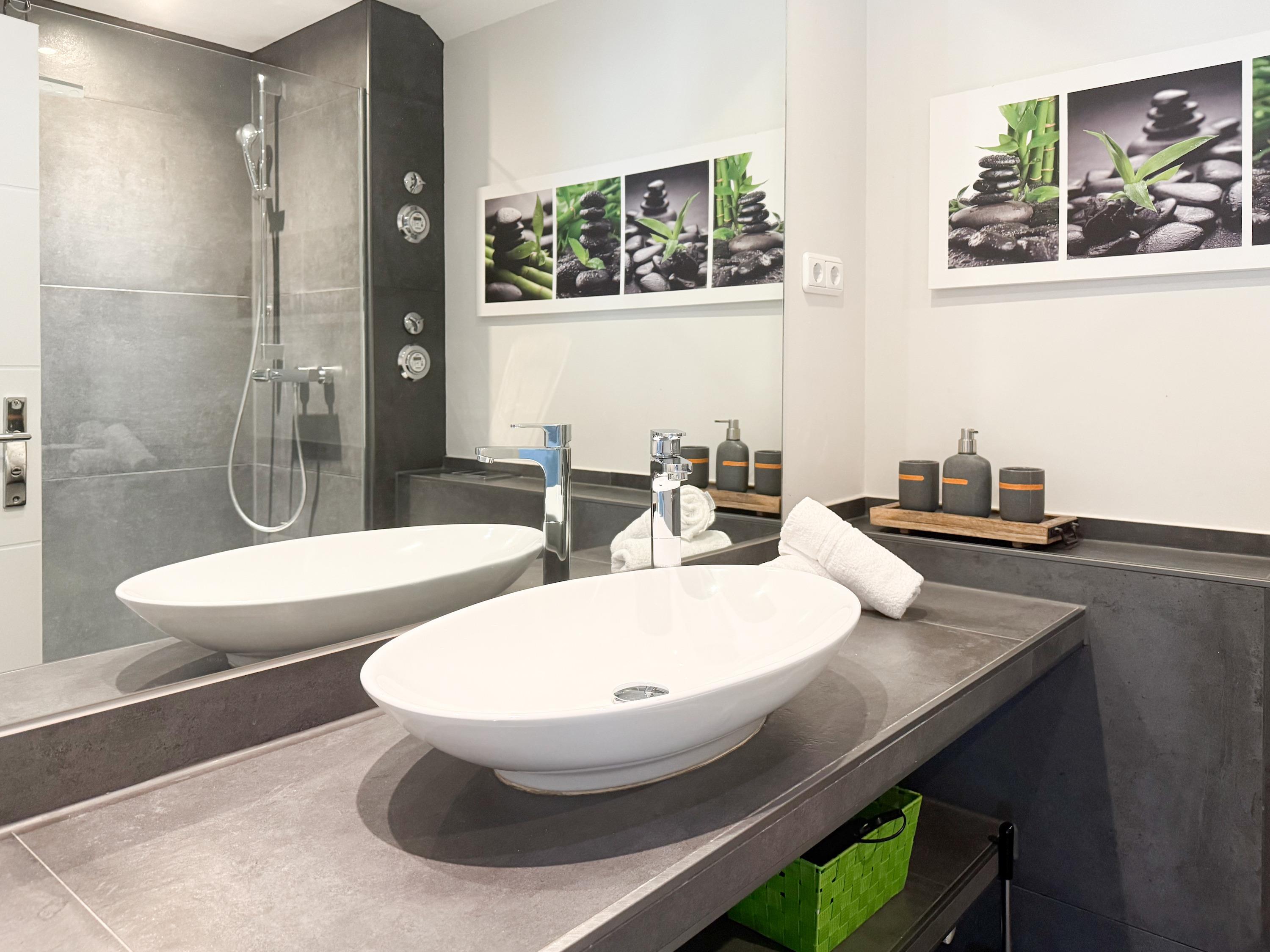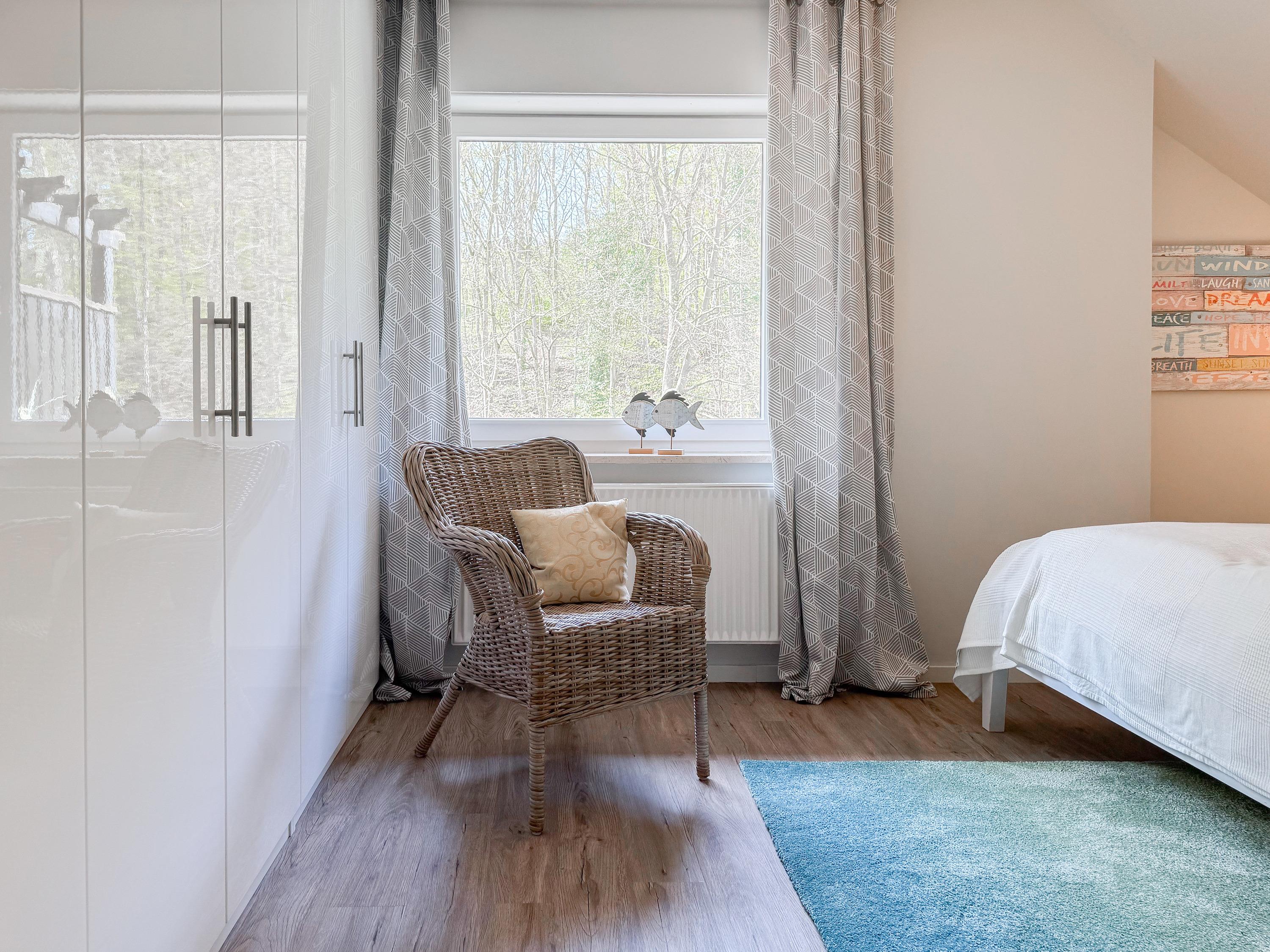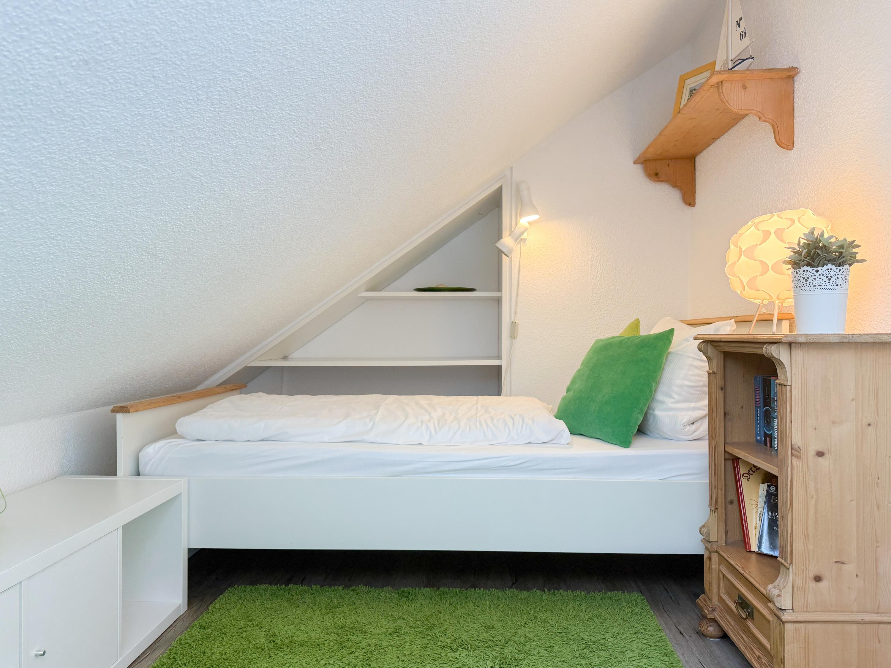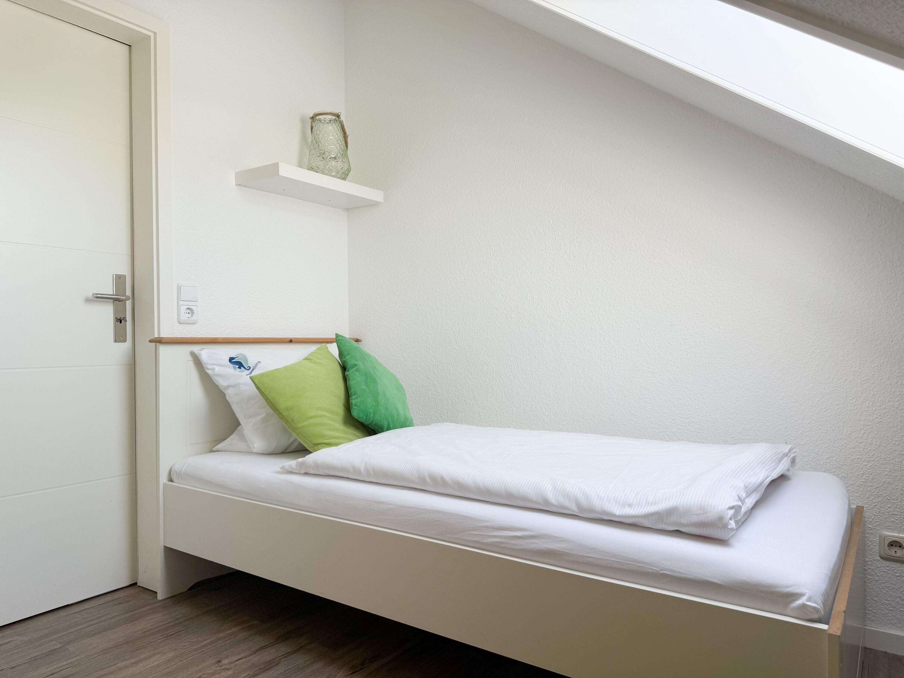 Der geschmackvoll gestaltete, helle Wohnbereich ist mit Sofa, TV, WLAN und Essbereich für 4 Personen ausgestattet. Von hier ist der Südwestbalkon zu erreichen, der über Markise, Gartenmöbel und Sonnenliege verfügt. Genießen Sie die Sonne von früh bis spät und entspannen mit einem schönen Blick ins Grüne. Die separate, moderne Einbauküche ist bestens ausgestattet und verfügt über einen kleinen Frühstücksbereich. Ein großes Schlafzimmer mit Doppelbett (180x200) und TV, ein kleineres Schlafzimmer mit 2 Einzelbetten (100x200) und ein modernes, neues Duschbad stehen den Gästen zur Verfügung. Alle Fenster sind mit Außenjalousien versehen. Waschmaschine und Trockner sind im Keller untergebracht und stehen zur kostenlosen Nutzung zur Verfügung.