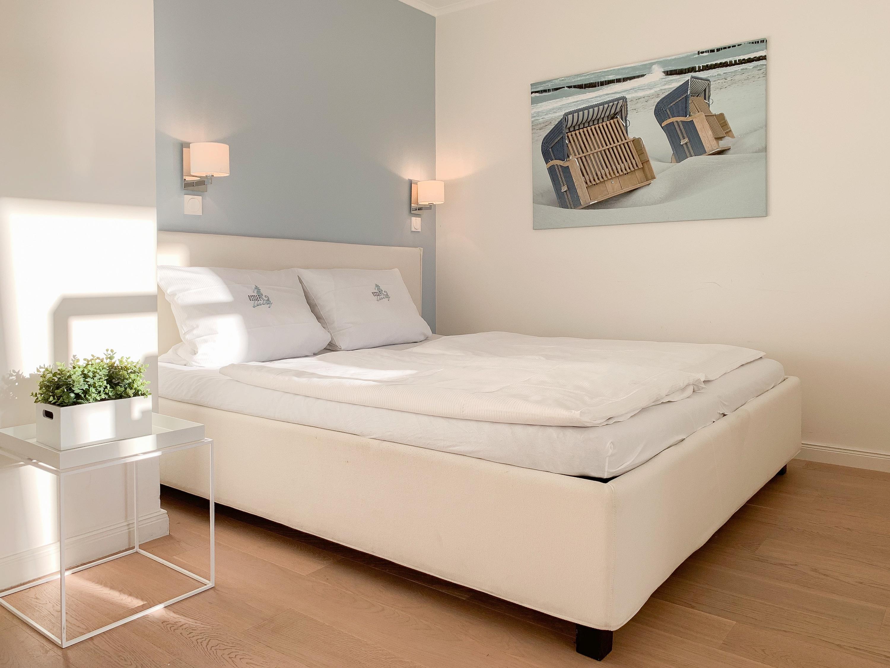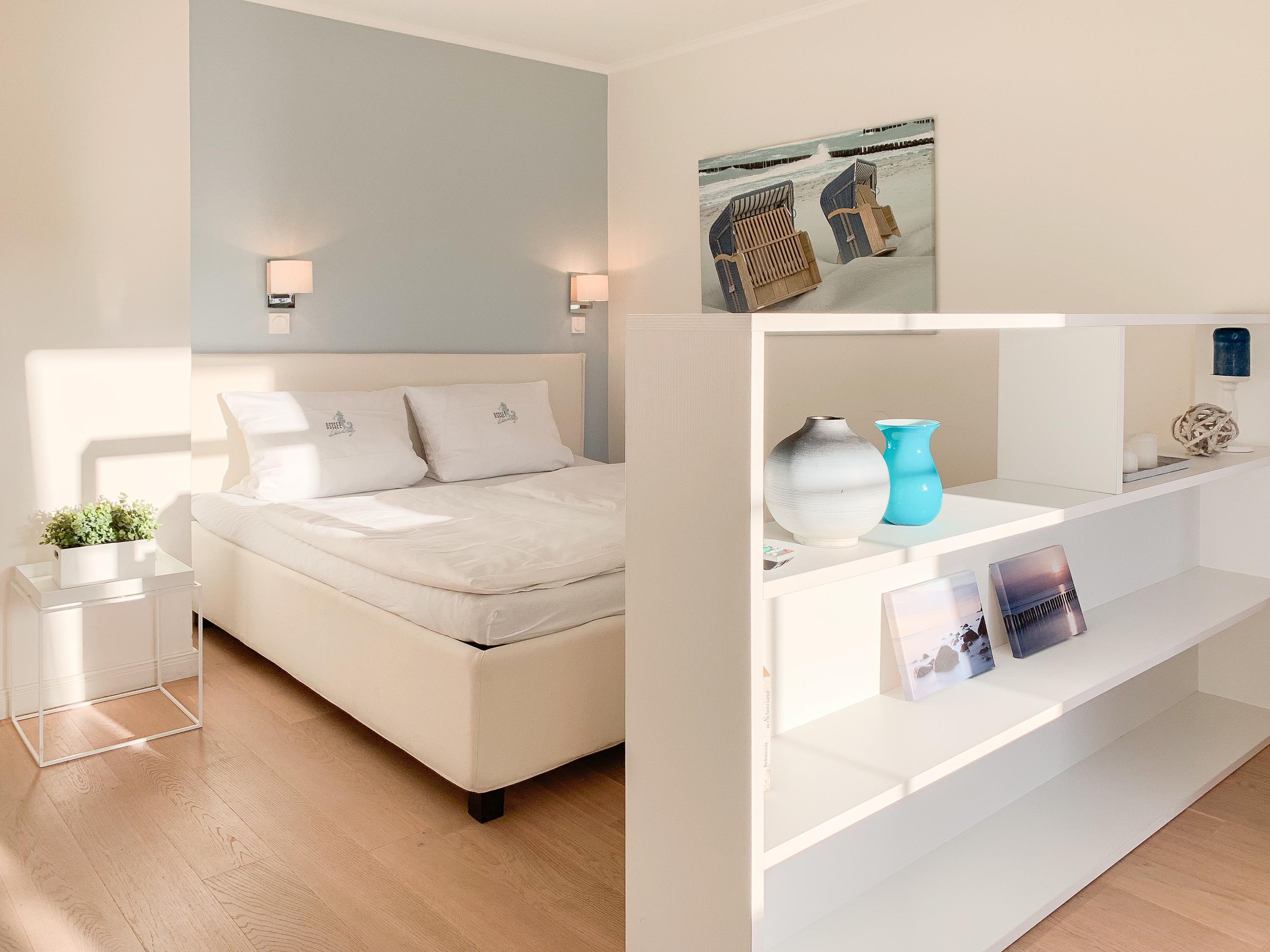Bodentiefe Fensterelemente, Echtholzparkett und die hochwertige Einrichtung schaffen eine helle und freundliche Wohnatmosphäre. Die 42 qm wurden optimal genutzt und bieten ausreichend Platz für 2-3 Personen. Es steht ein geschmackvoll eingerichteter, großzügiger Wohn-/Schlafbereich mit einem hochwertigen Sofa mit Schlaffunktion, TV und ein Essbereich für 4 Personen zur Verfügung. Das Doppelbett (160x200) ist optisch durch einen Raumteiler vom Wohnbereich getrennt, die Fenster sind mit Verdunkelungsvorhängen versehen. Die moderne[nbsp] Küchenzeile ist im Flurbereich integriert. Das hochwertige Bad verfügt über eine[nbsp] Dusche, Waschtisch, WC, Handtuchwärmer und Fön. Kostenloser Internetzugang über WLAN steht selbstverständlich zur Verfügung.