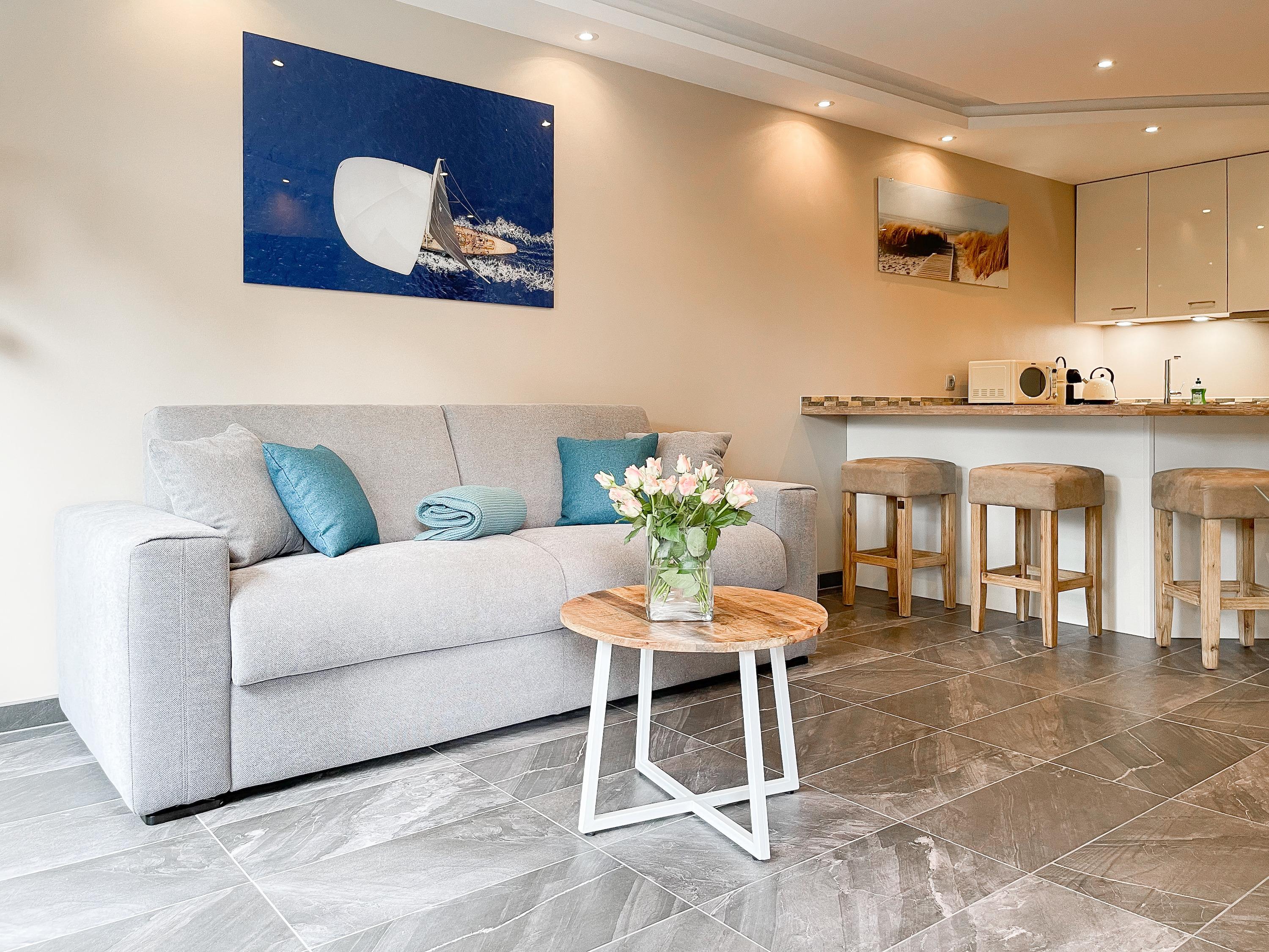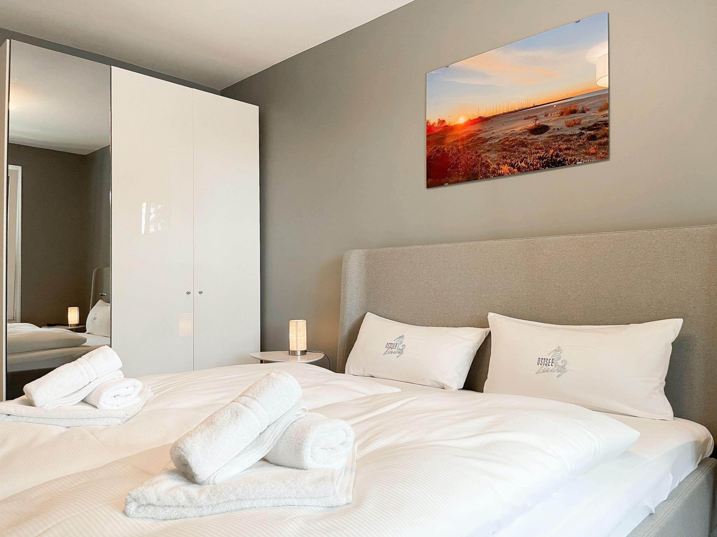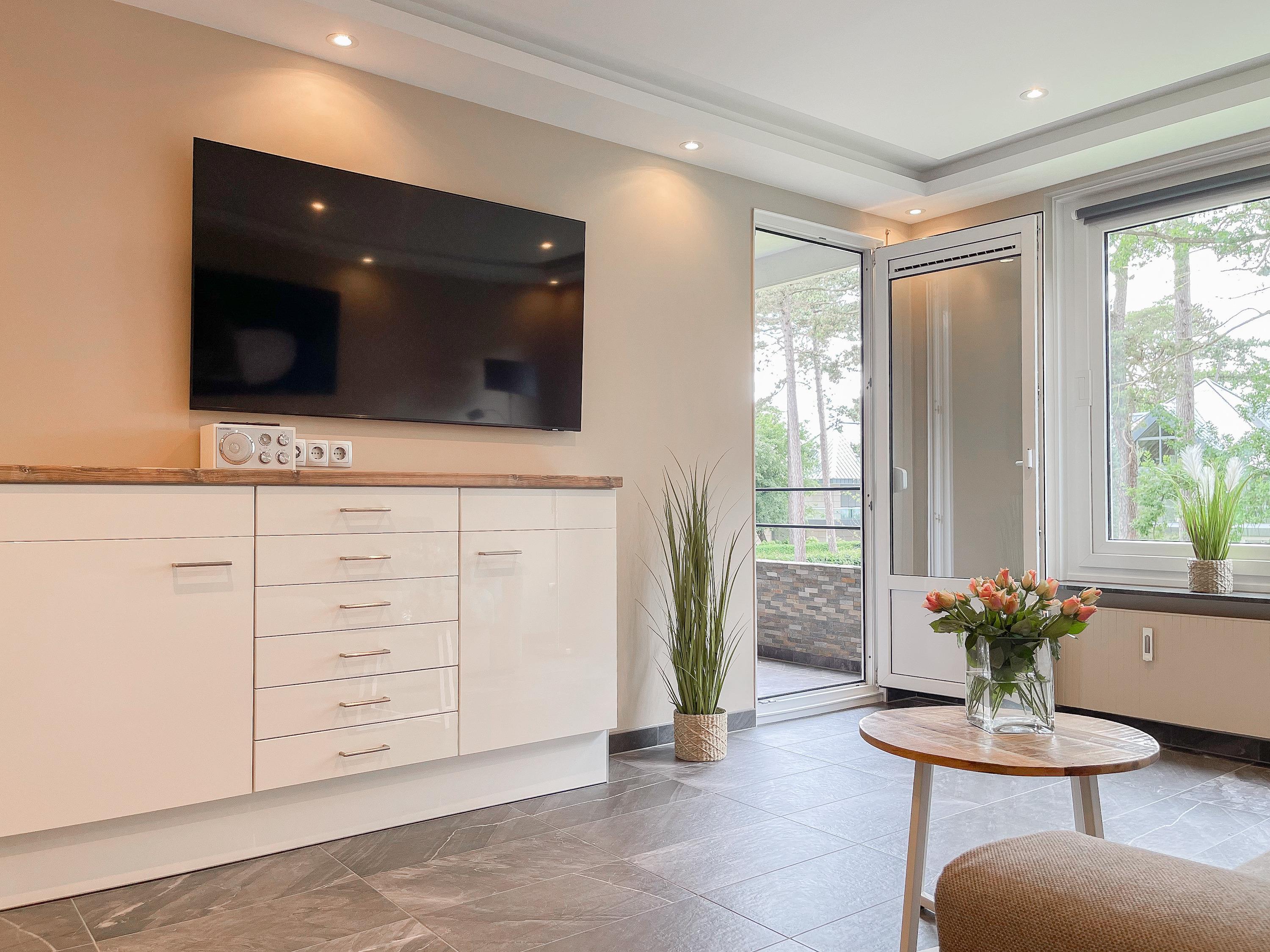 Die aufwendig renovierte und hochwertig eingerichtete Ferienwohnung befindet sich in der ersten Etage im Carpe Diem Haus 2, einer gepflegten Wohnanlage. Es erwartet Sie ein moderner Wohnbereich mit einem hochwertigen Schlafsofa, TV, Bluetooth Radio und WLAN. Die integrierte Einbauküche ist sehr gut ausgestattet und verfügt über einen Esstresen mit ausreichend Platz für 4 Personen. Der vorgelagerte Balkon zur Meerseite bietet einen sehr schönen Ausblick. Je nach Jahreszeit kann man die Ostsee durch die Bäume blitzen sehen. Meeresrauschen und die frische Seeluft sind garantiert. Das separate Schlafzimmer ist mit einem Doppelbett (160x200), einem Kleiderschrank und einem zusätzlichen TV ausgestattet. Zur Wohnung gehört ein fester Außenstellplatz.