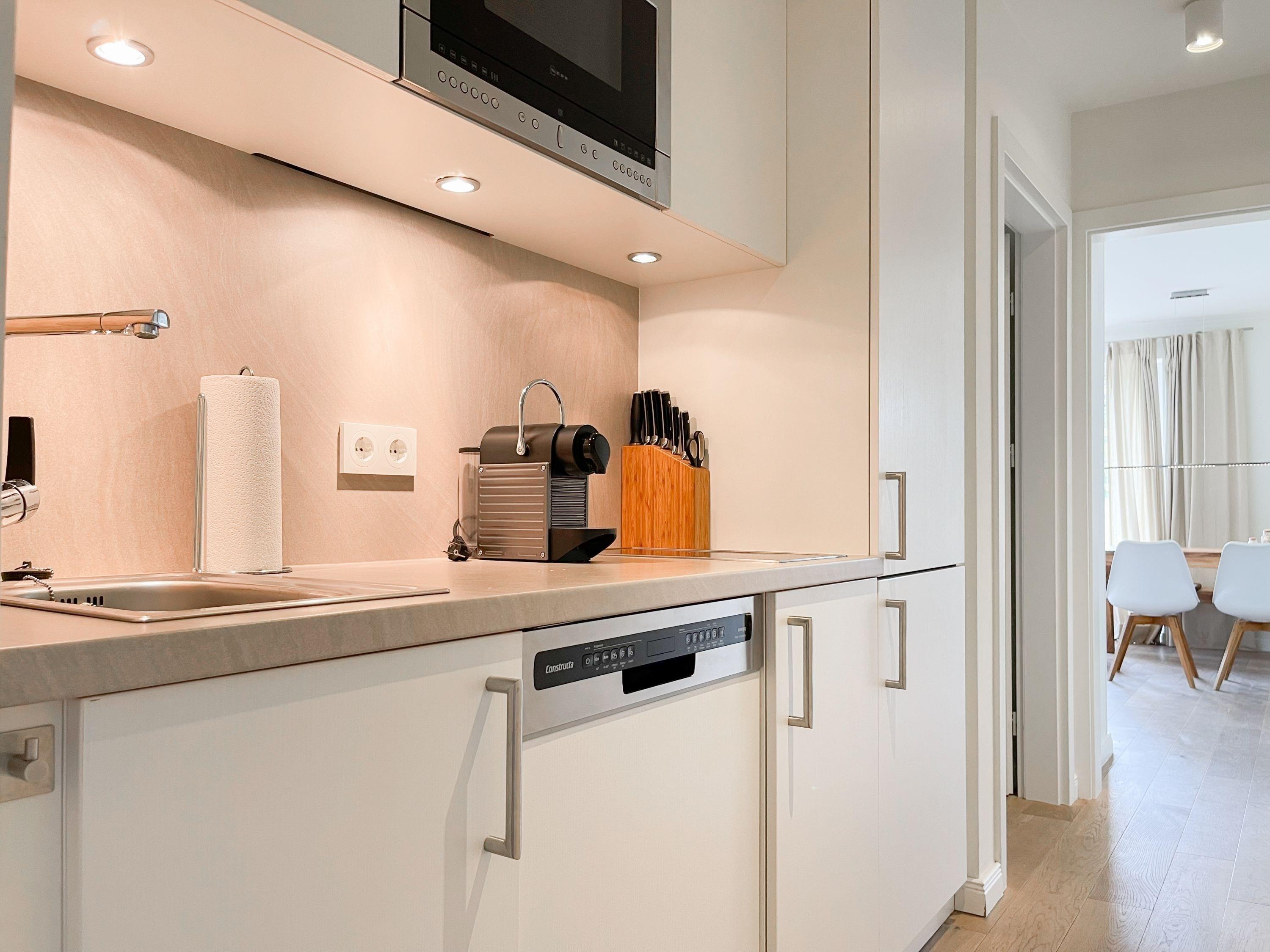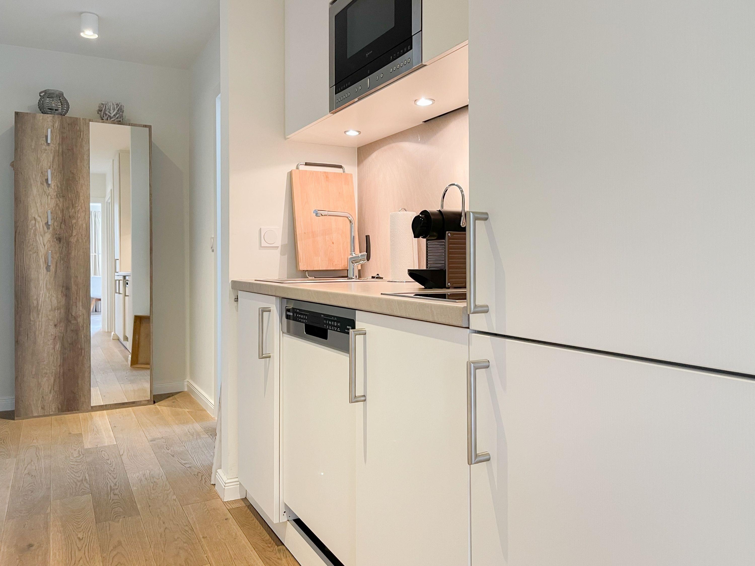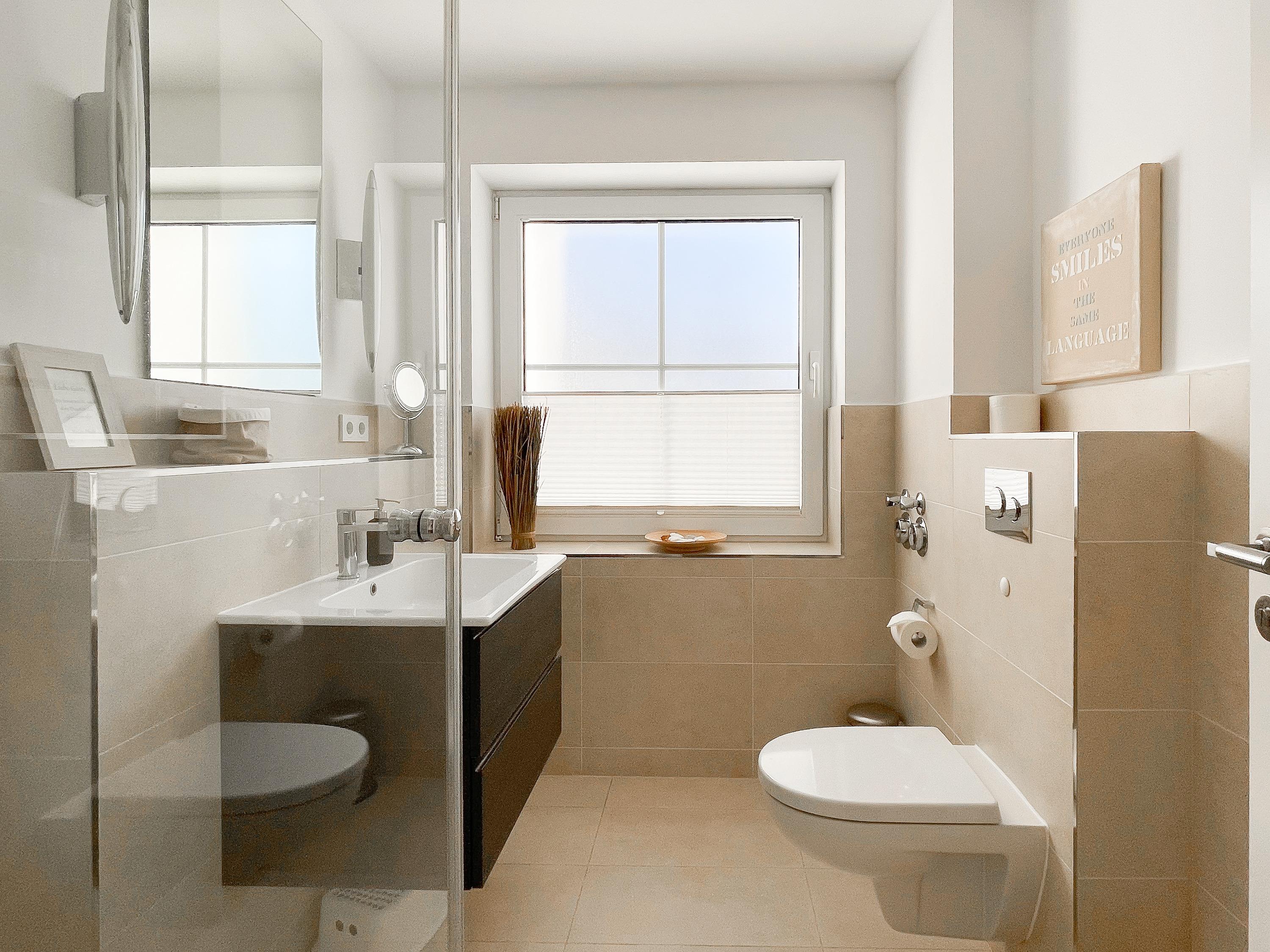 Bodentiefe Fensterelemente, Echtholzparkett und eine hochwertige Einrichtung schaffen eine helle und freundliche Wohnatmosphäre. Alle Fenster sind mit elektrischen Außenjalousien versehen. Es steht ein geschmackvoller, großzügiger Wohnbereich (Sofa mit Schlaffunktion 140x200) mit angrenzendem Essbereich zur Verfügung. TV, Radio, CD Player und kostenloser Internetzugang überWLAN sind vorhanden. Die moderne Küchenzeile ist bestens ausgestattet und verfügt über Geschirrspülmaschine und Mikrowelle mit Backfunktion. Das Schlafzimmer ist mit einem Doppelbett (180x200), Einbauschrank und einem zusätzlichen TV ausgestattet. Das moderne Bad mit großem Fenster verfügt über eine Dusche, Waschtisch, WC, Handtuchwärmer und Fön. Ein Pkw Stellplatz befindet sich in der Tiefgarage (Einfahrtshöhe 1,75 m), Aufzug, Fahrradkeller (eine Platzgarantie für Ihre Fahrräder besteht nicht) sowie Waschmaschine und Trockner (Münzgeräte) sind vorhanden.