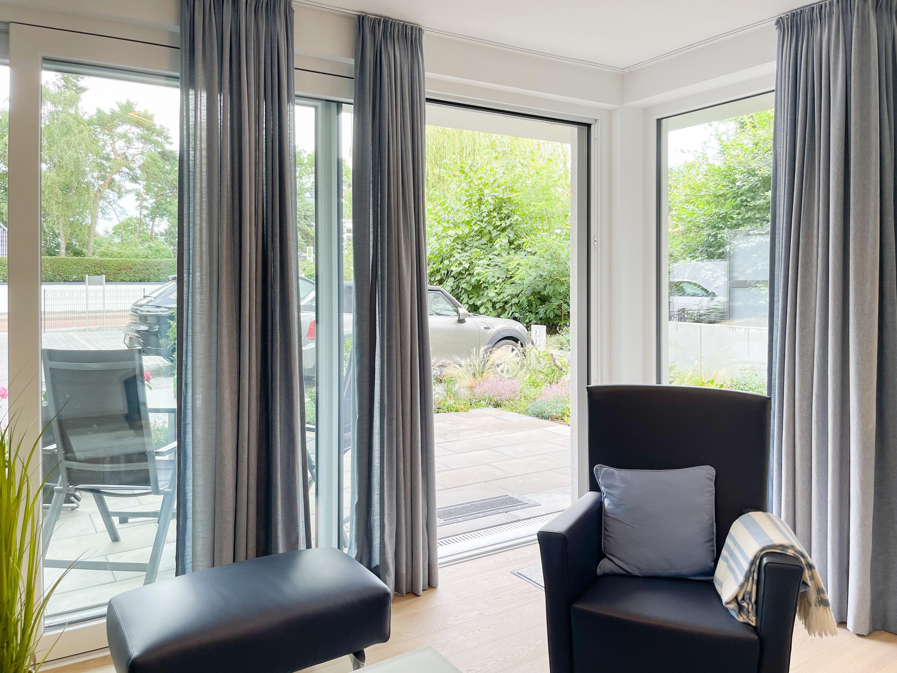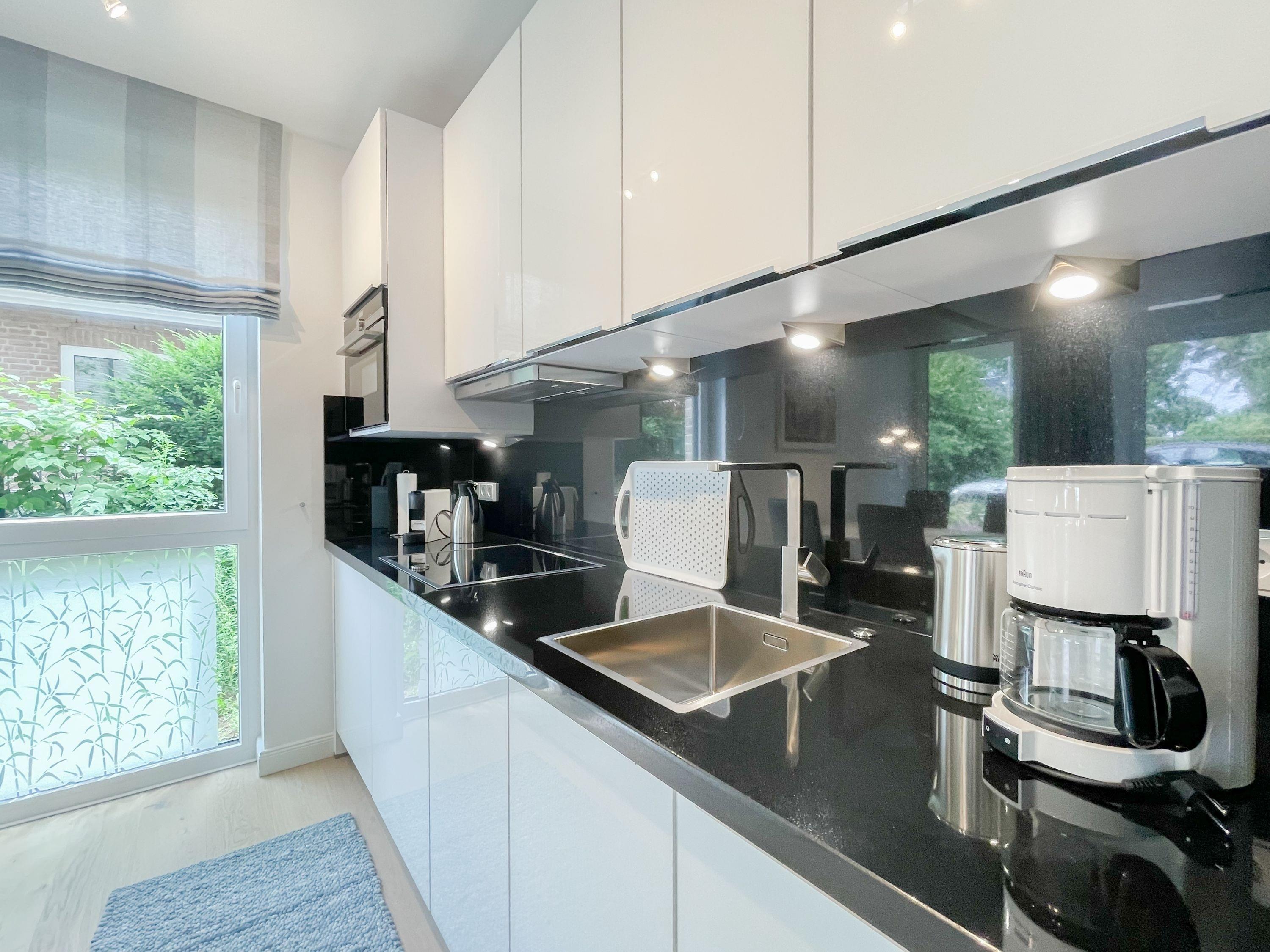 Die perfekt ausgestattete Erdgeschosswohnung ist sehr hochwertig eingerichtet und bietet höchsten Wohnkomfort in großzügigen Räumlichkeiten. Bodentiefe Fensterelemente, Echtholzböden und Fußbodenheizung sorgen für eine wunderbare Atmosphäre zum wohlfühlen. Der lichtdurchflutete Wohnbereich ist mit einem Sofa, 2 Sesseln, TV und Radio eingerichtet und der anschließende Essbereich bietet ausreichend Platz für 4 Personen. Die Küche verfügt über wertige Markengeräte und die Ausstattung läßt keine Wünsche offen. Genießen Sie die Morgensonne beim ersten Kaffee auf der Ostterrasse, die sich über den gesamten Wohn- Essbereich erstreckt. Das große Schlafzimmer ist mit einem Doppelbett (180x200), einem Kleiderschrank mit reichlich Stauraum für die Urlaubsgarderobe, einem TV und Vorhängen zur Verdunkelung ausgestattet. Bettwäsche und Handtücher sind im Strandläufer inklusive, sodass bei Anreise die Betten bezogen sind und Handtücher bereit liegen. Das überaus großzügig angelegte Bad verfügt über eine XXL Walk In Dusche, Waschtisch, WC, Bidet, Handtuchtrockner und Fenster. W-LAN steht selbstverständlich zur kostenlosen Nutzung bereit. Die Wohnung ist fast barrierefrei (außer der minimalen Fensterleibung zur Terrasse) und für Allergiker geeignet.