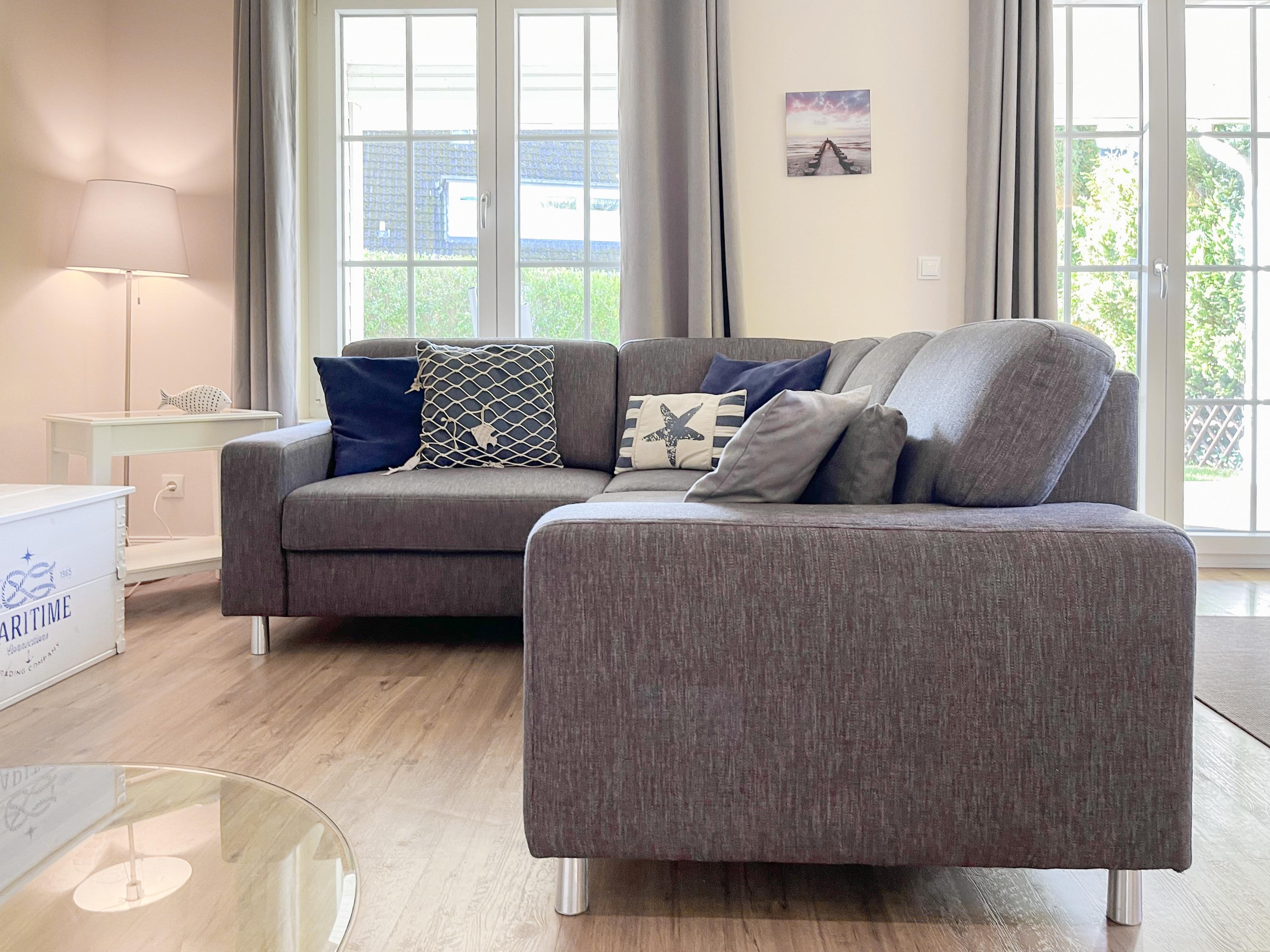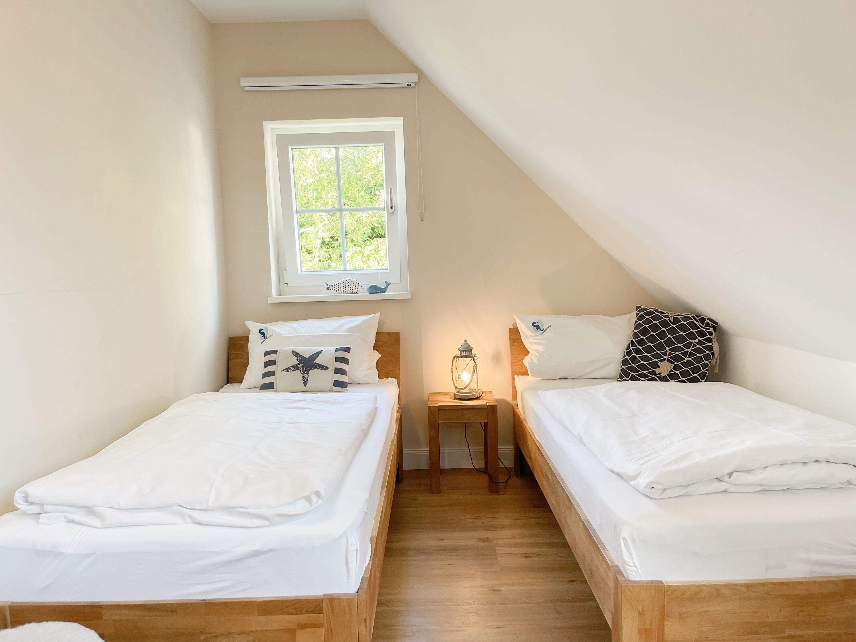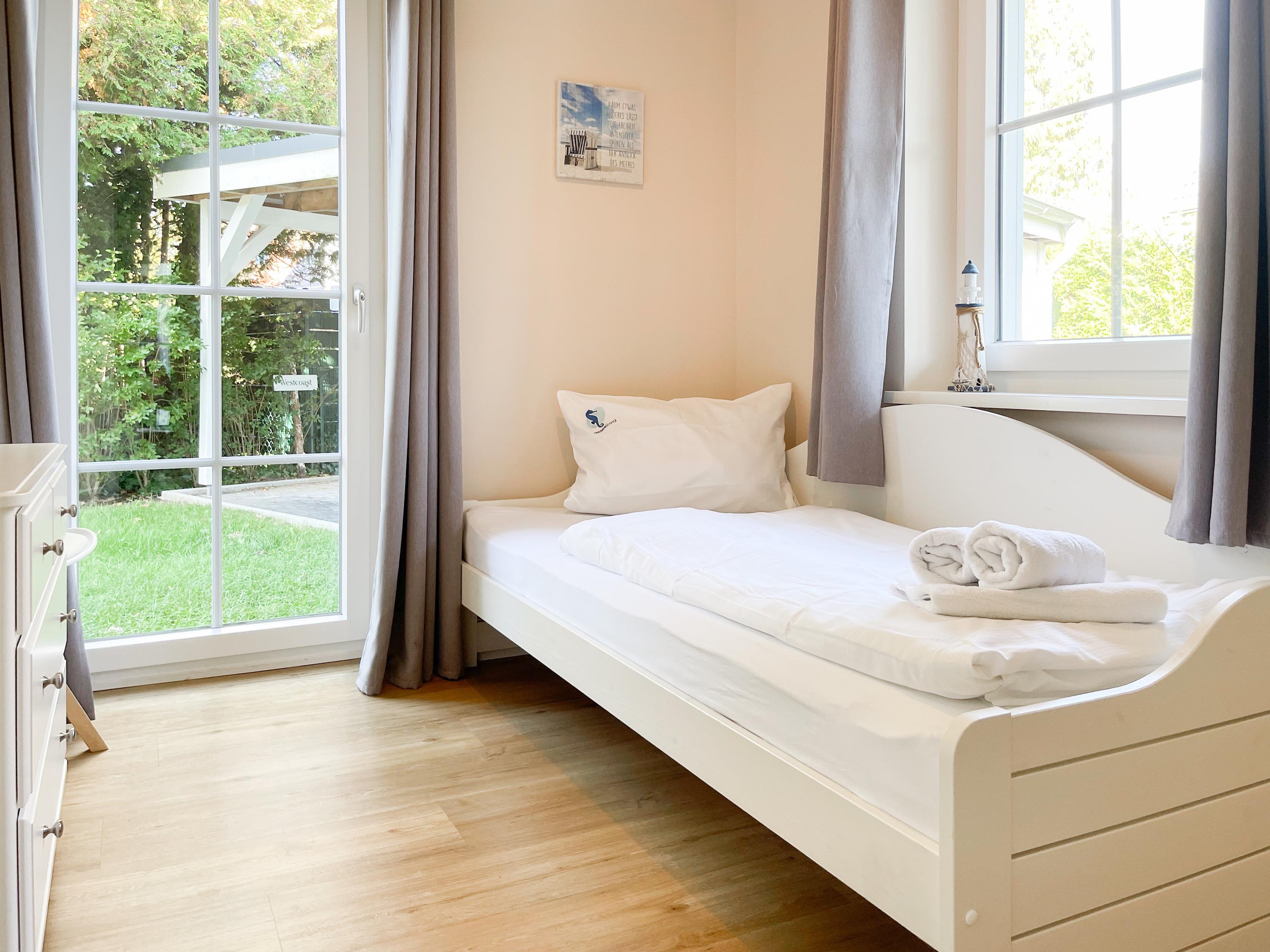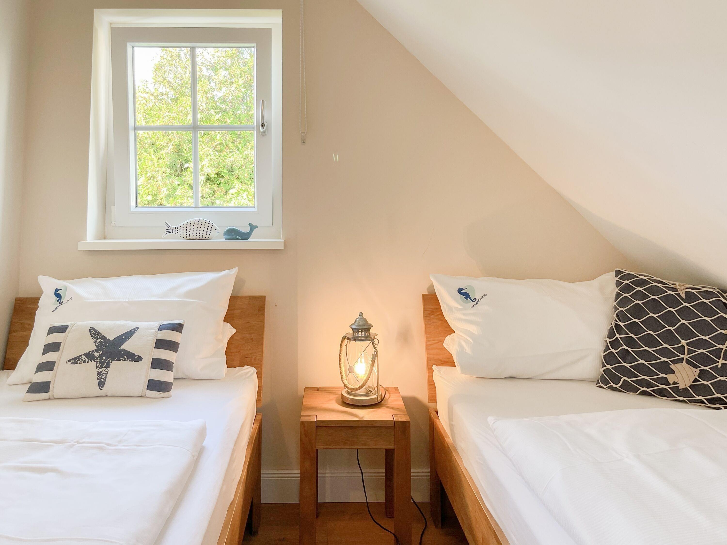 Es erwartet Sie ein wunderschönes Doppelhaus im Hampton Style. Sonnige Räumlichkeiten und die hochwertige Ausstattung sorgen für hohen Wohnstandard in einem schönen Ambiente. Mit 3 Schlafzimmern, einem modernen Bad mit Dusche und Badewanne sowie einem zusätzlichen Gäste WC, bietet das Haus auf[nbsp] 75 qm Wohnfläche ausreichend Raum für 5 Personen, um einen erholsamen Ostseeurlaub ganz nah am Strand zu verbringen. Im Erdgeschoss erwartet Sie ein gemütlich eingerichteter Wohnbereich mit Sofa, TV und Kaminofen, ein anschließender Essbereich sowie eine offene Einbauküche in bester Ausstattung zum gemeinsamen Kochen. Die vorgelagerte überdachte Veranda in Südausrichtung mit Garten ist ein herrlicher Platz zum Entspannen oder für Outdoor Aktivitäten. Ein Schlafzimmer, ausgestattet mit einem Einzelbett (90x200) und einer Kommode[nbsp] sowie ein Gäste WC, sind ebenfalls im Erdgeschoss untergebracht. Im Obergeschoss gibt es zwei separate Schlafzimmer, eines ist mit einem Doppelbett (180x200), einem Kleiderschrank und einem weiteren[nbsp] TV ausgestattet. Das andere ist mit 2 Einzelbetten (90x200), einem Kleiderschrank und einem Schreibtisch für das Homeoffice eingerichtet. Das hochwertige Bad mit Badewanne, Dusche und integrierter Waschmaschine, ist modern und lichtdurchflutet. Die Fenster der Schlafzimmer lassen sich abdunkeln (keine Blackout Verdunkelung). WLAN steht selbstverständlich zur Verfügung.