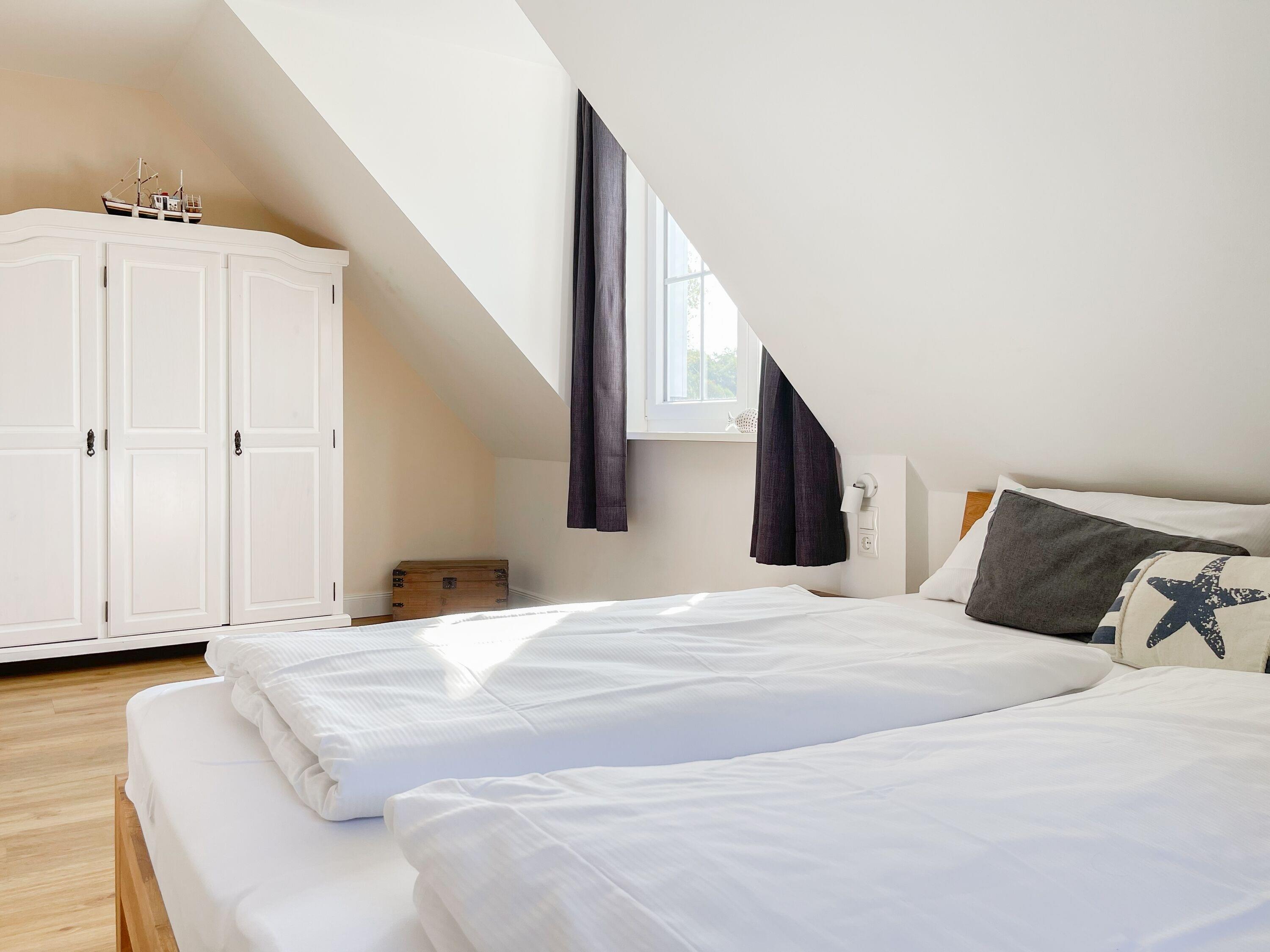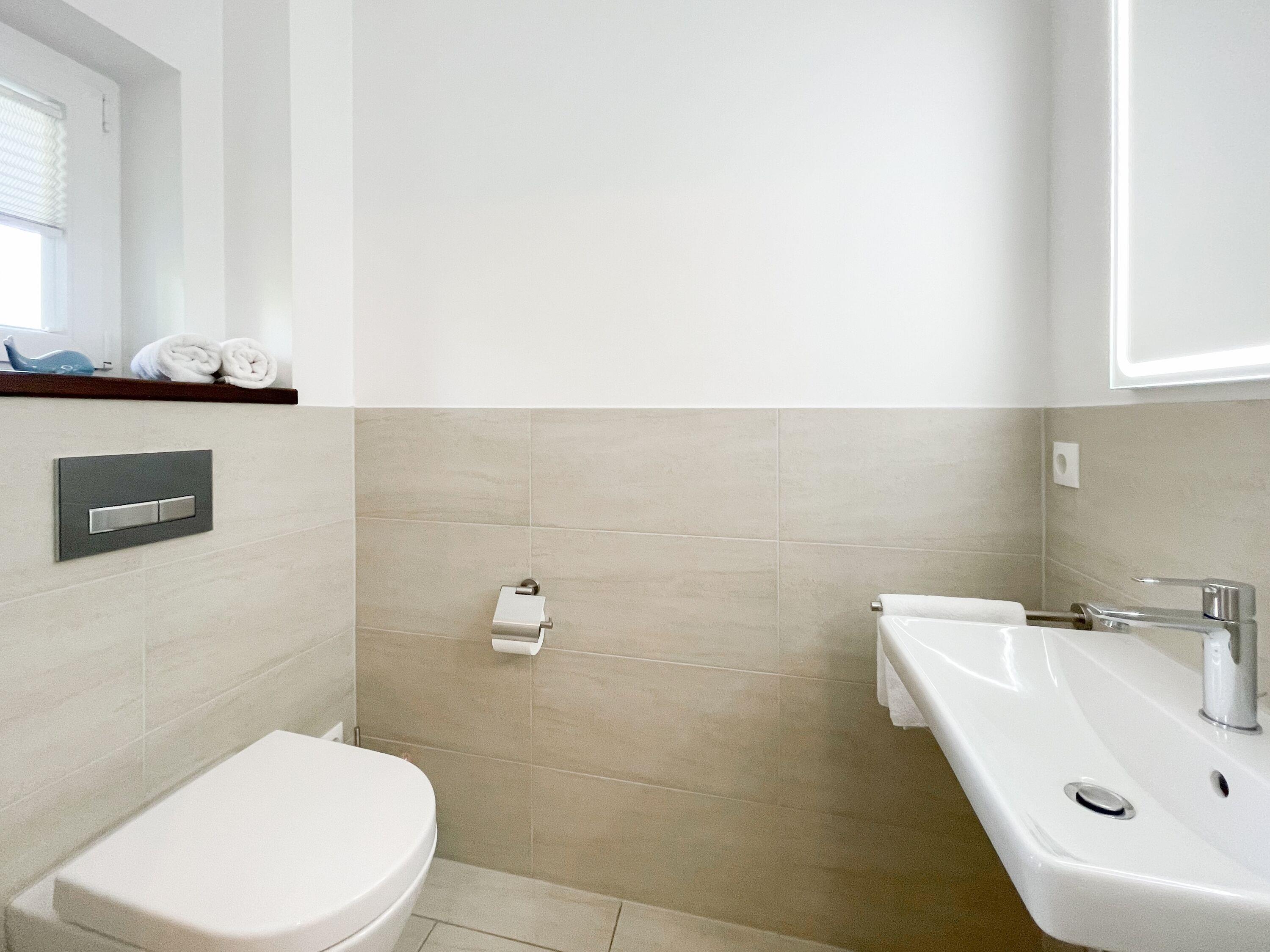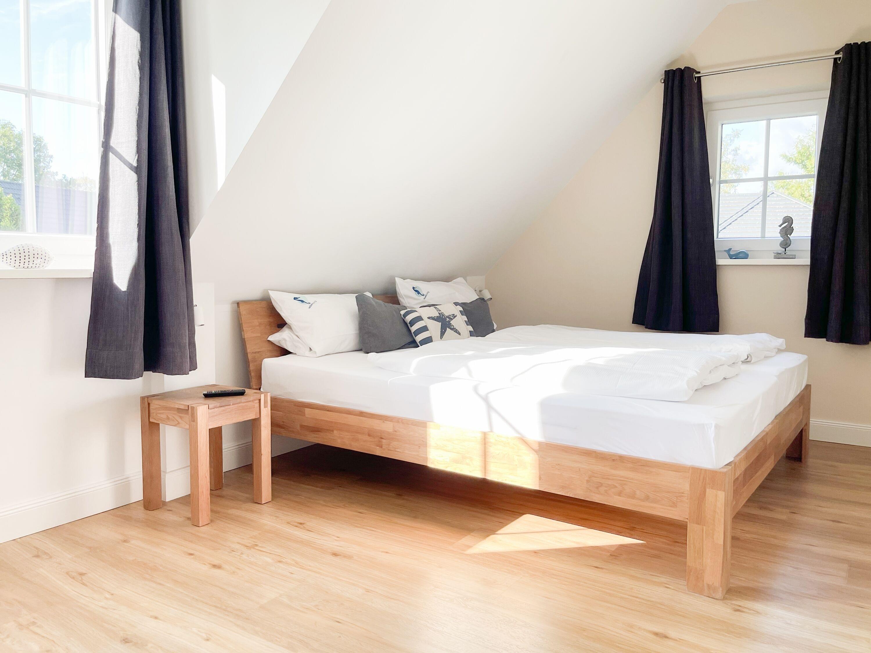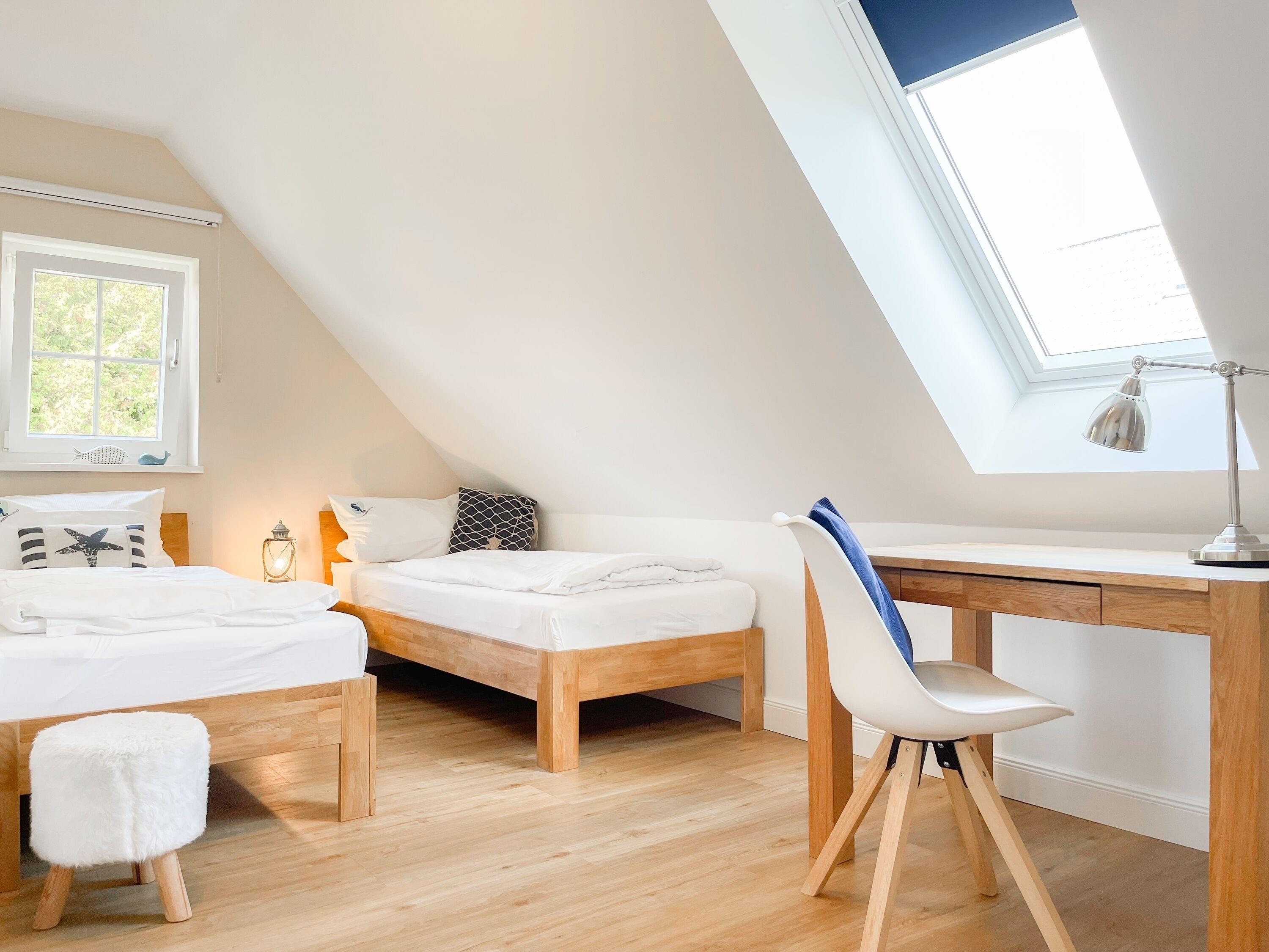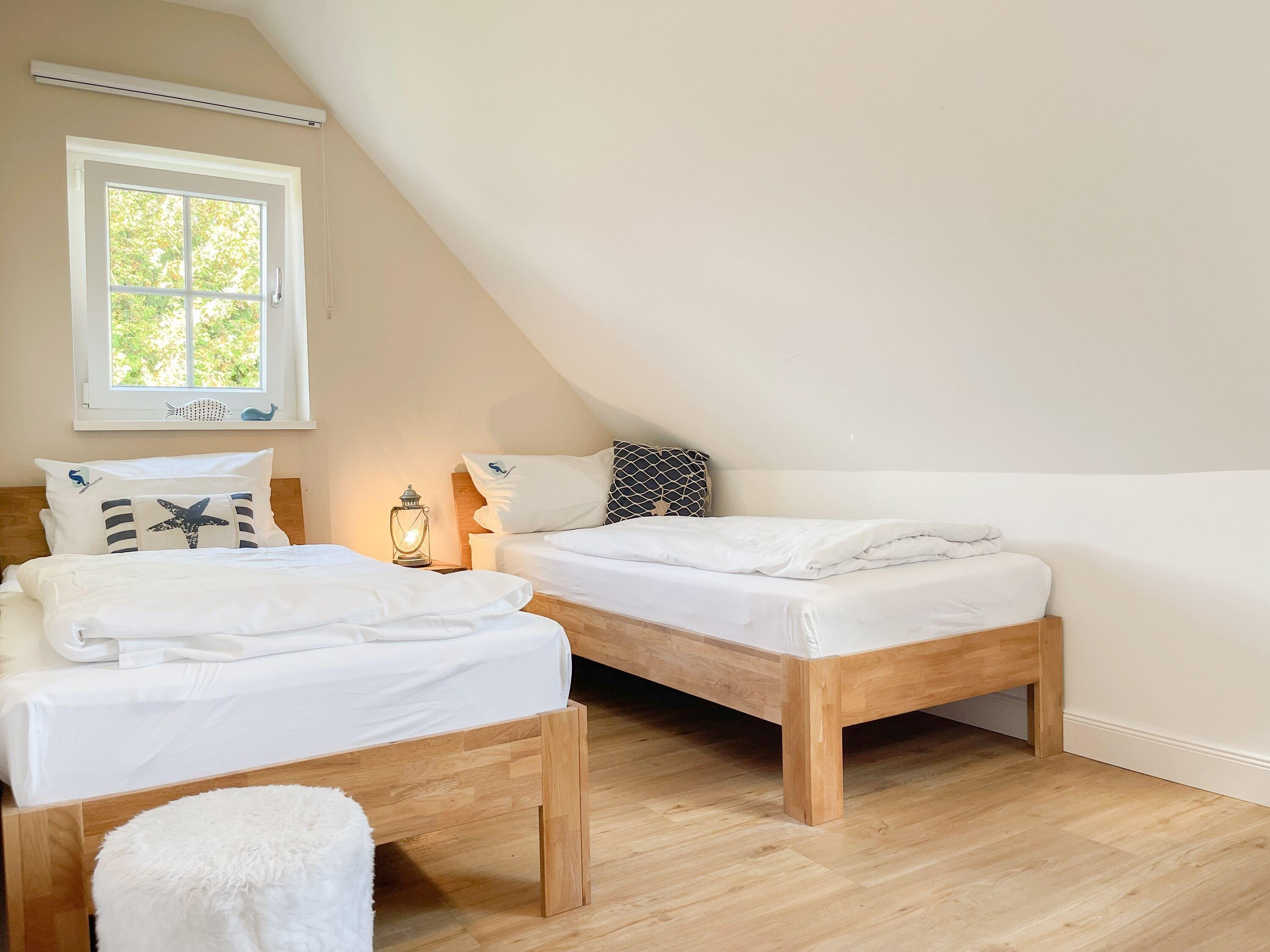 Es erwartet Sie ein wunderschönes Doppelhaus im Hampton Style. Sonnige Räumlichkeiten und die hochwertige Ausstattung sorgen für hohen Wohnstandard in einem schönen Ambiente. Mit 3 Schlafzimmern, einem modernen Bad mit Dusche und Badewanne sowie einem zusätzlichen Gäste WC, bietet das Haus auf[nbsp] 75 qm Wohnfläche ausreichend Raum für 5 Personen, um einen erholsamen Ostseeurlaub ganz nah am Strand zu verbringen. Im Erdgeschoss erwartet Sie ein gemütlich eingerichteter Wohnbereich mit Sofa, TV und Kaminofen, ein anschließender Essbereich sowie eine offene Einbauküche in bester Ausstattung zum gemeinsamen Kochen. Die vorgelagerte überdachte Veranda in Südausrichtung mit Garten ist ein herrlicher Platz zum Entspannen oder für Outdoor Aktivitäten. Ein Schlafzimmer, ausgestattet mit einem Einzelbett (90x200) und einer Kommode[nbsp] sowie ein Gäste WC, sind ebenfalls im Erdgeschoss untergebracht. Im Obergeschoss gibt es zwei separate Schlafzimmer, eines ist mit einem Doppelbett (180x200), einem Kleiderschrank und einem weiteren[nbsp] TV ausgestattet. Das andere ist mit 2 Einzelbetten (90x200), einem Kleiderschrank und einem Schreibtisch für das Homeoffice eingerichtet. Das hochwertige Bad mit Badewanne, Dusche und integrierter Waschmaschine, ist modern und lichtdurchflutet. Die Fenster der Schlafzimmer lassen sich abdunkeln (keine Blackout Verdunkelung). WLAN steht selbstverständlich zur Verfügung.