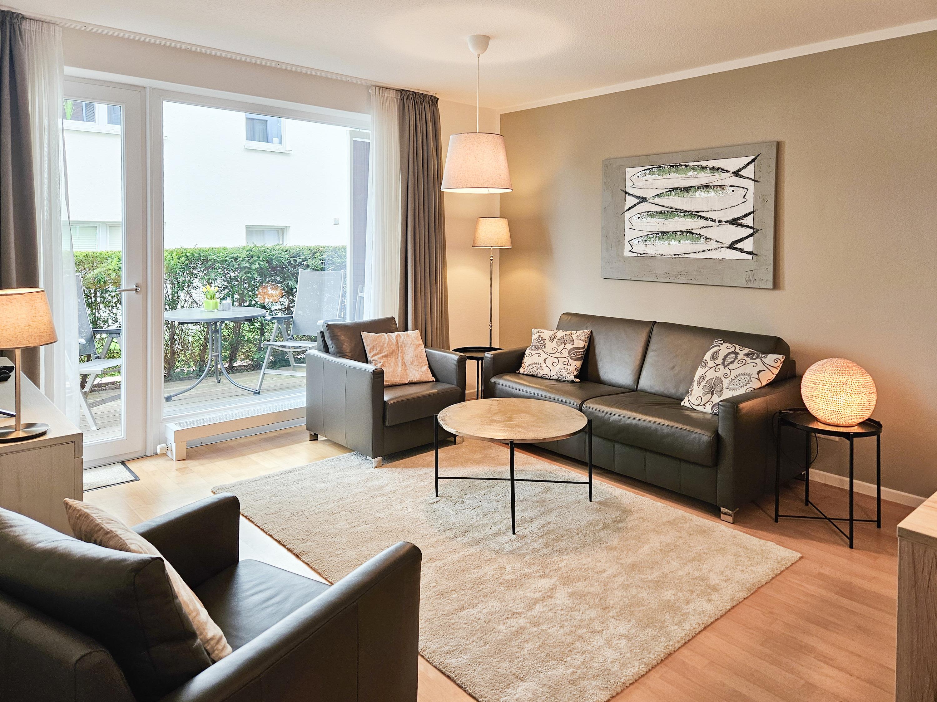 Es erwartet Sie eine geschmackvoll eingerichtete Ferienwohnung mit bodentiefen Fenstern, die lichtdurchflutete Räume für einen erholsamen Ostseeurlaub in schönem Ambiente schaffen. Die großzügige Westterrasse ist sowohl vom Wohn- als auch vom Schlafzimmer aus zu erreichen - ein herrlicher Rückzugsort, um den Abend bei einem Glas Wein ausklingen zu lassen. Im Wohnbereich erwartet Sie ein hochwertiges Sofa mit Schlaffunktion (160x200), TV und Radio. WLAN steht Ihnen selbstverständlich kostenlos zur Verfügung. Der angrenzende Essbereich bietet ausreichend Platz für gemeinsame Mahlzeiten und gemütliches Beisammensein. Die integrierte Einbauküche verfügt über alle technischen Geräte und eine gute Ausstattung zum gemeinsamen Kochen. Das Schlafzimmer ist mit einem hochwertigen Boxspringbett (180x200), einem geräumigen Schrank und einem zusätzlichen Fernseher ausgestattet. Alle Fenster sind mit Verdunkelungsvorhängen versehen. Das großzügige Bad ist mit Dusche, Waschbecken, Fön, Handtuchtrockner und integrierter Waschmaschine ausgestattet. Das WC befindet sich in einem separaten Raum.