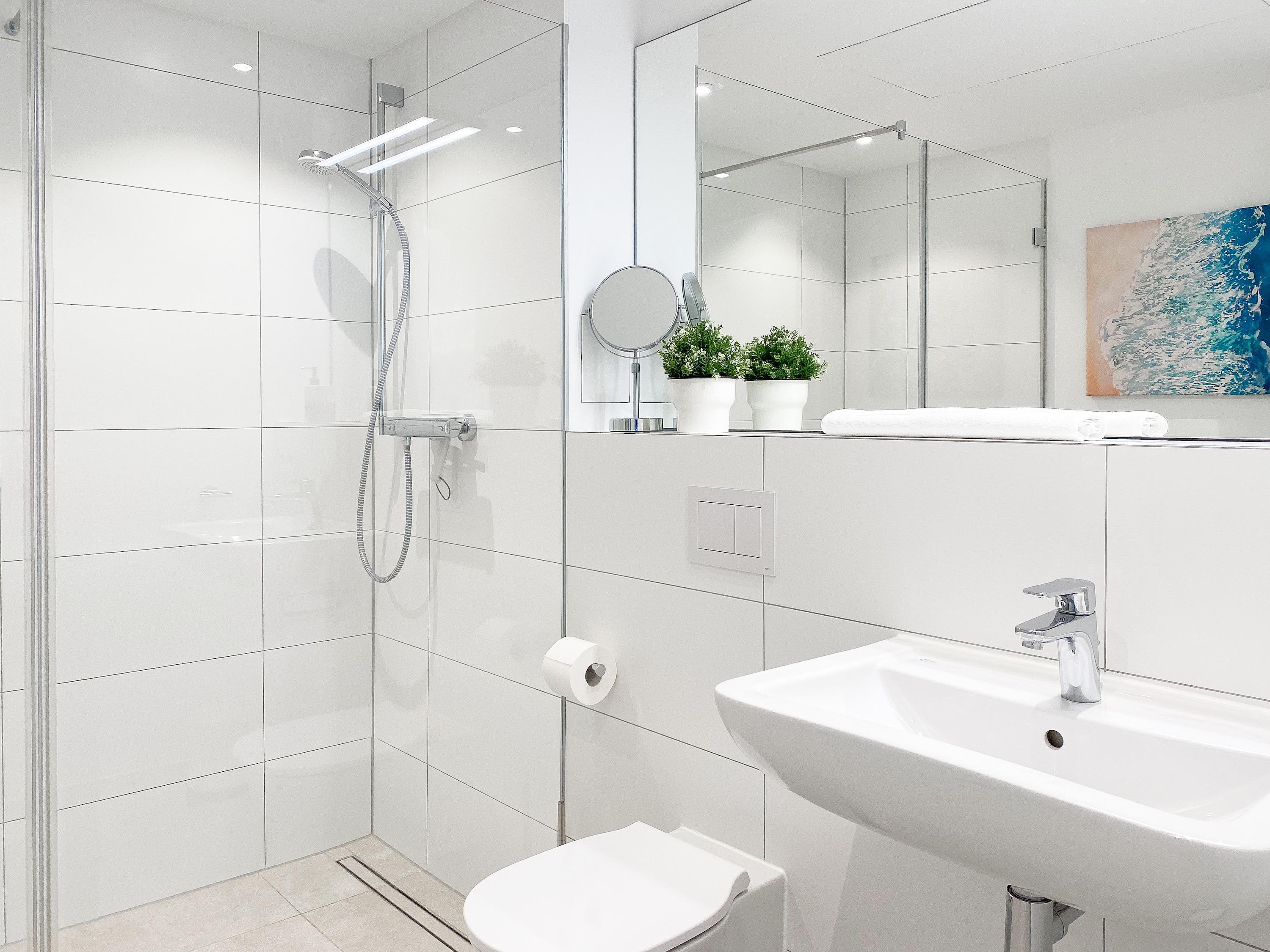 Zehn exklusive Wohnungen mit Balkonen und Terrassen zur Meerseite bieten traumhafte Ausblicke bis auf die Ostsee und jeglichen Komfort zur Gewährleistung eines hohen Wohnstandards in schönem Ambiente. Alle Wohnungen verfügen über moderne Bäder mit Walk In Duschen, Fußbodenheizung und elektrische Außenjalousien mit einstellbaren Lamellen, die gleichermaßen für Tageslicht und Privatsphäre sorgen.