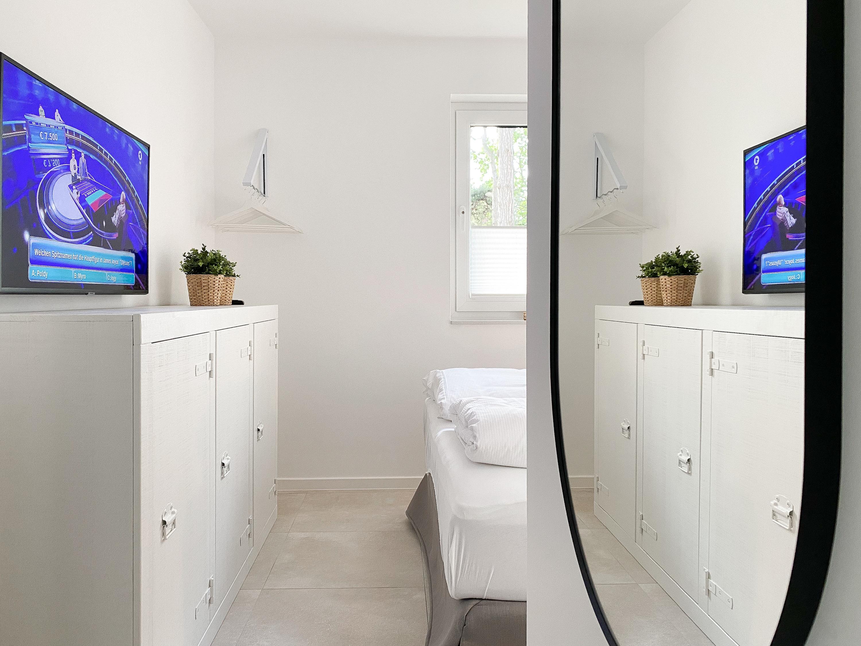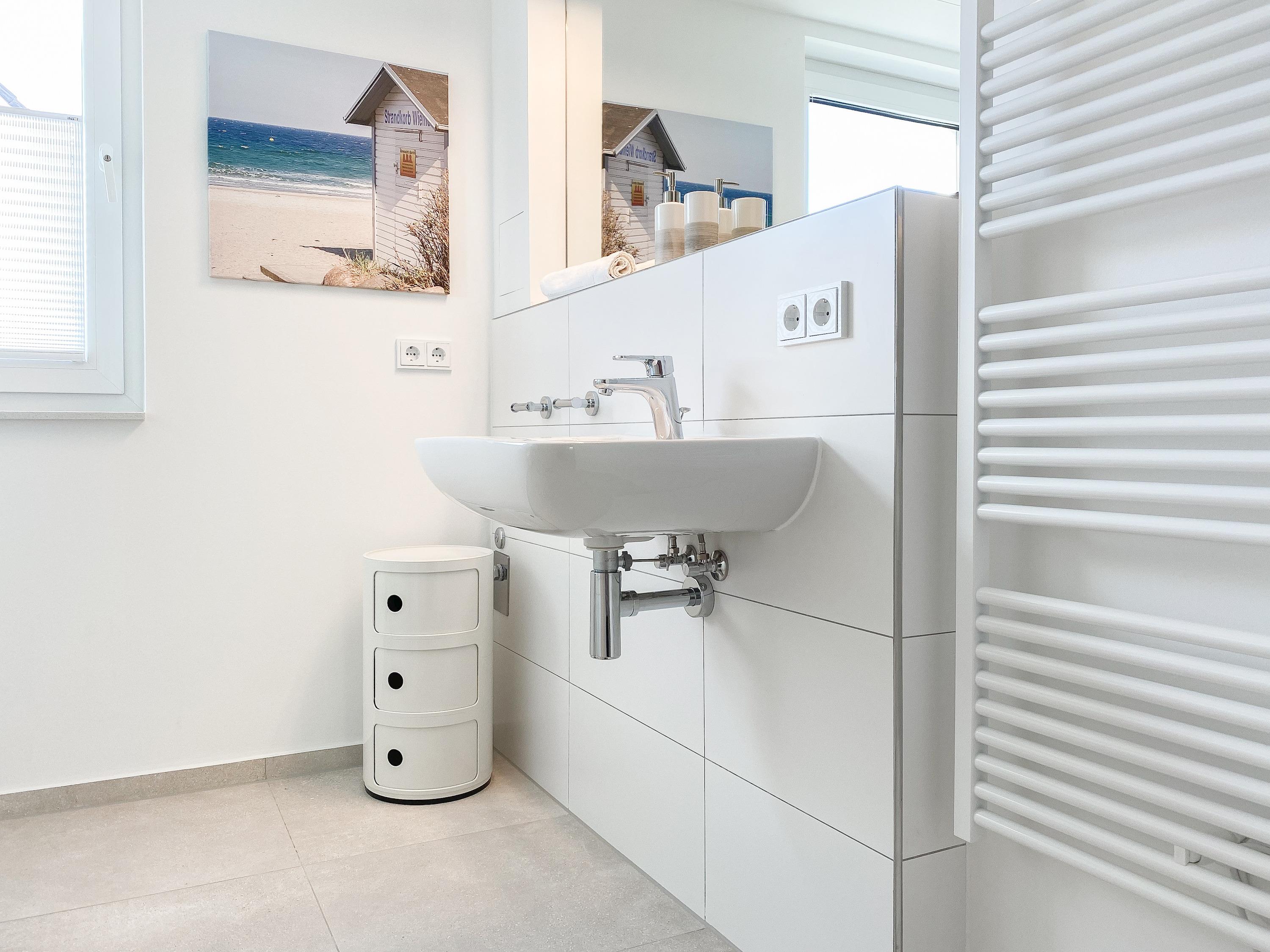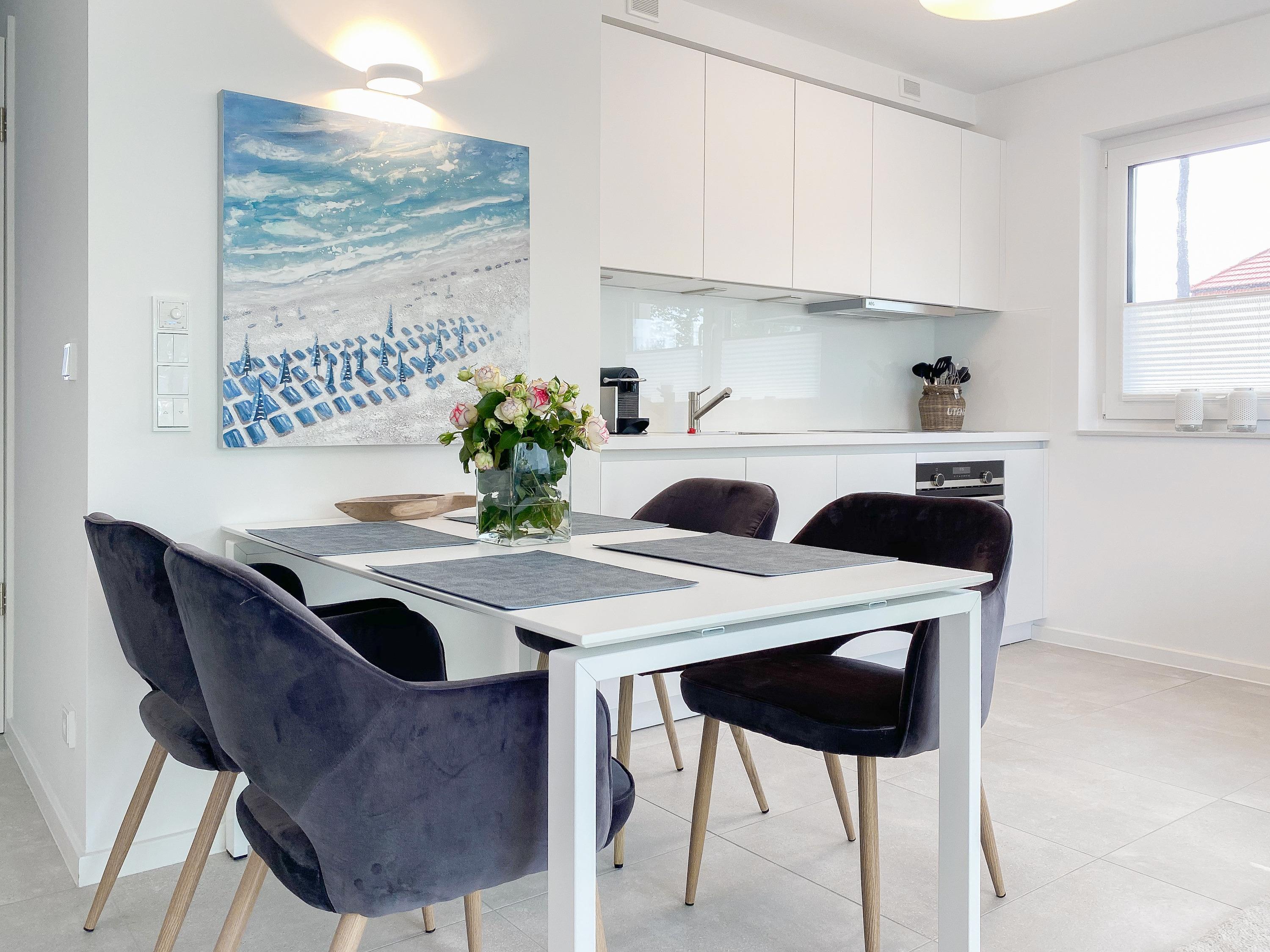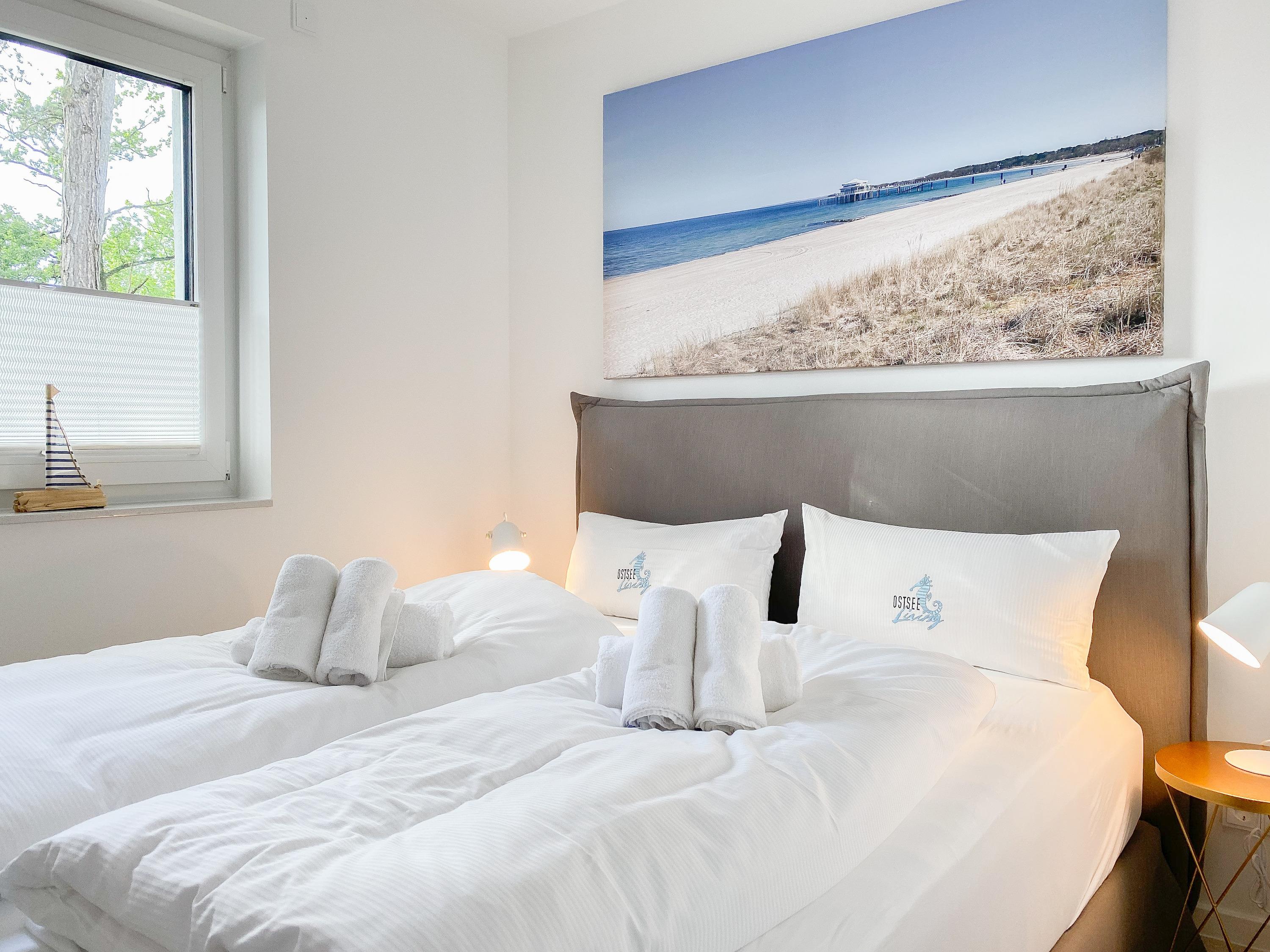 Die Ferienwohnung Wohnen am Strand 9 befindet sich im zweiten Obergeschoss und bietet mit 2 Schlafzimmern, ausgestattet mit Boxspringbetten (180x200 und 160x200)[nbsp][nbsp]und TV sowie 2 Duschbädern, [nbsp]jeglichen Komfort für 4 Personen, um einen entspannten Urlaub zu verleben. Der hochwertig eingerichtete Wohn- Essbereich bietet einen herrlichen Ausblick bis auf die Ostsee. Entspannen Sie auf Ihrem Balkon mit Teilmeerblick, Brandungsrauschen und frische Ostseeluft inklusive. Es stehen insgesamt 3 TV, Radio und WLAN zur Verfügung. Die Wohnung ist mit Fußbodenheizung ausgestattet und alle Fenster sind mit elektrischen Außenjalousien versehen, die gleichermaßen für Verdunkelung oder Tageslicht mit Privatsphäre sorgen. Zur Wohnung gehört ein fester Tiefgaragenstellplatz (Einfahrtshöhe 1,90 m). Das Haus verfügt über einen Fahrstuhl und einen Fahrradkeller. Waschmaschine und Trockner stehen kostenlos zur gemeinschaftlichen Nutzung[nbsp] zur Verfügung.
