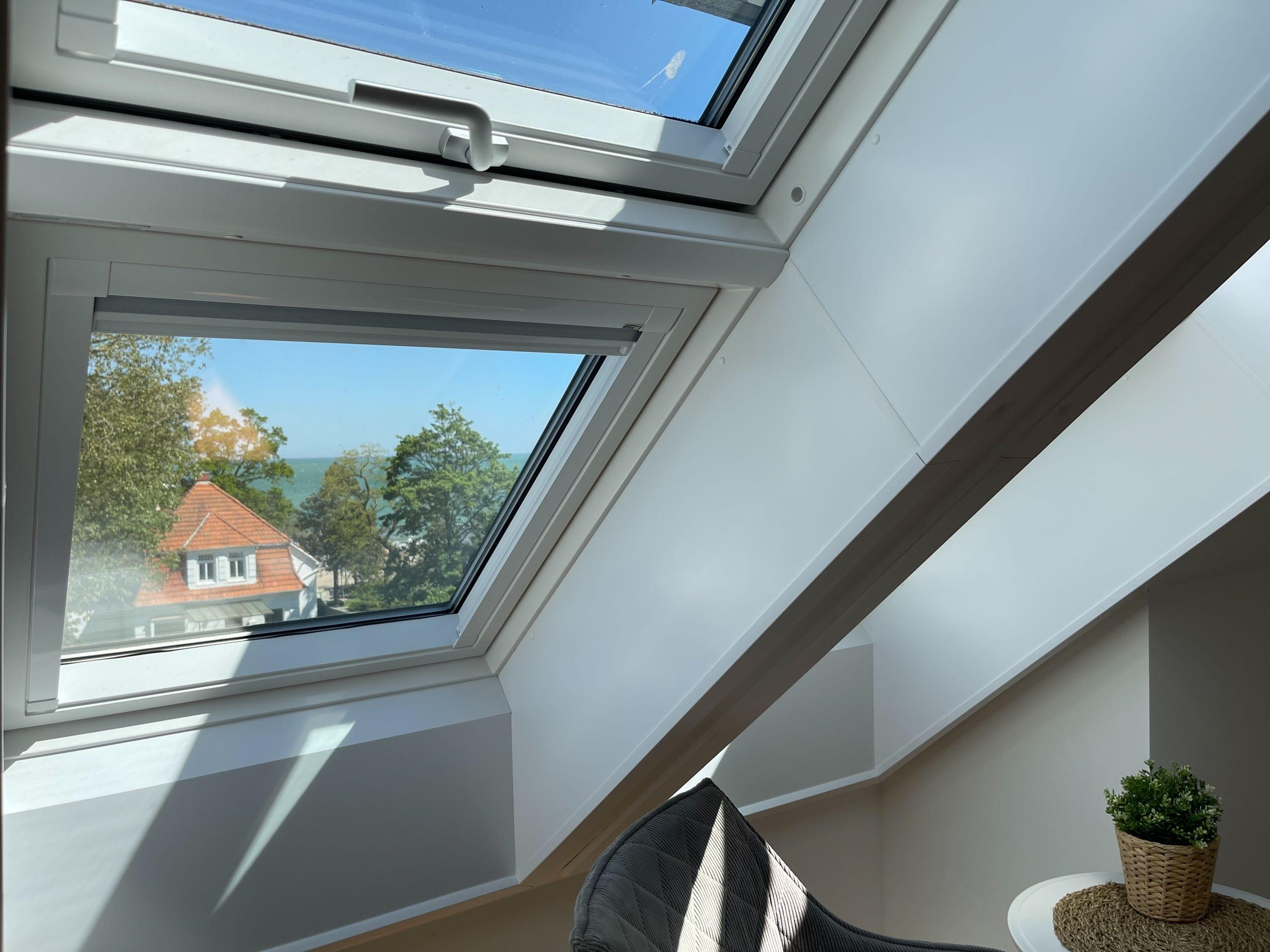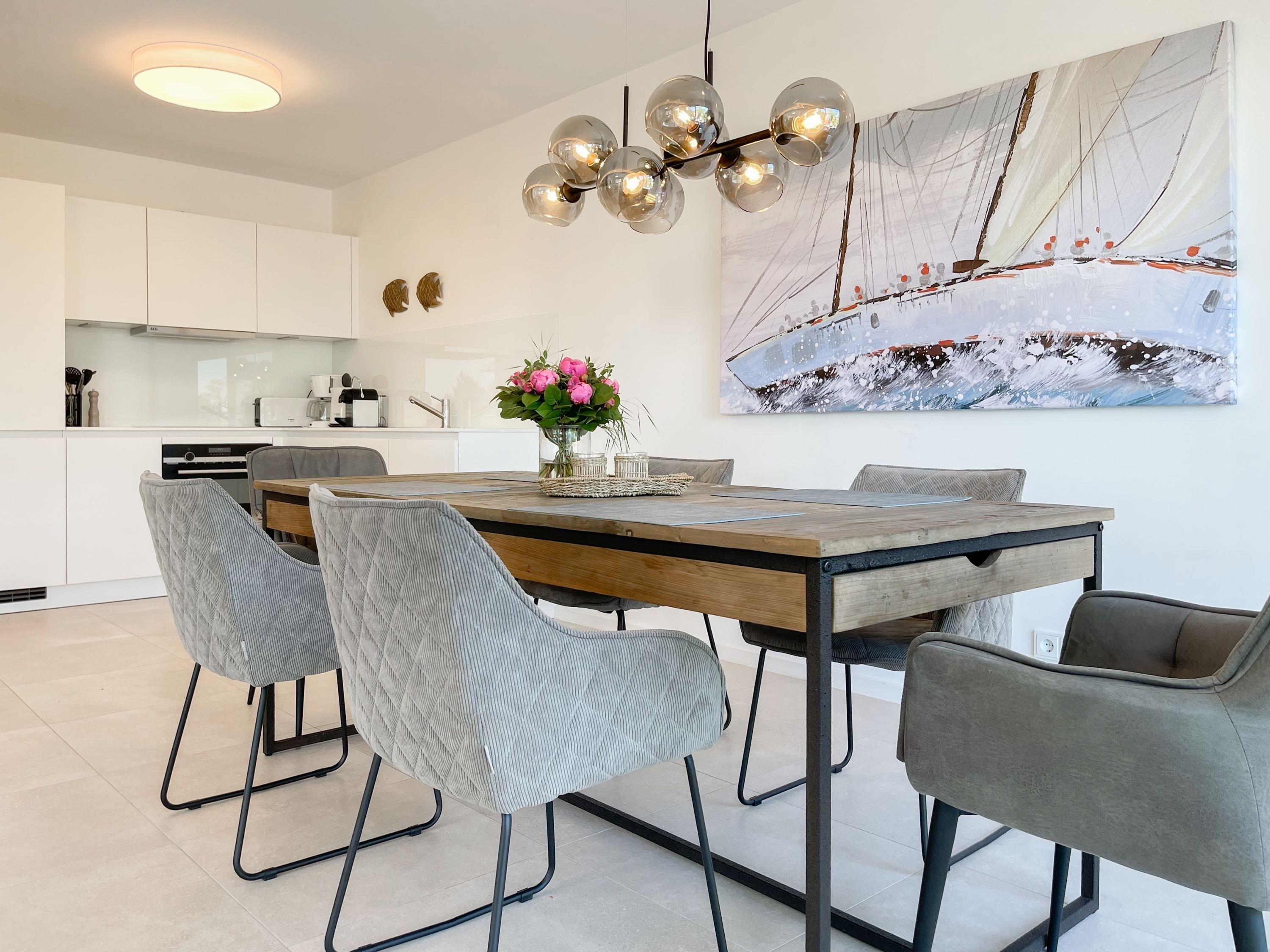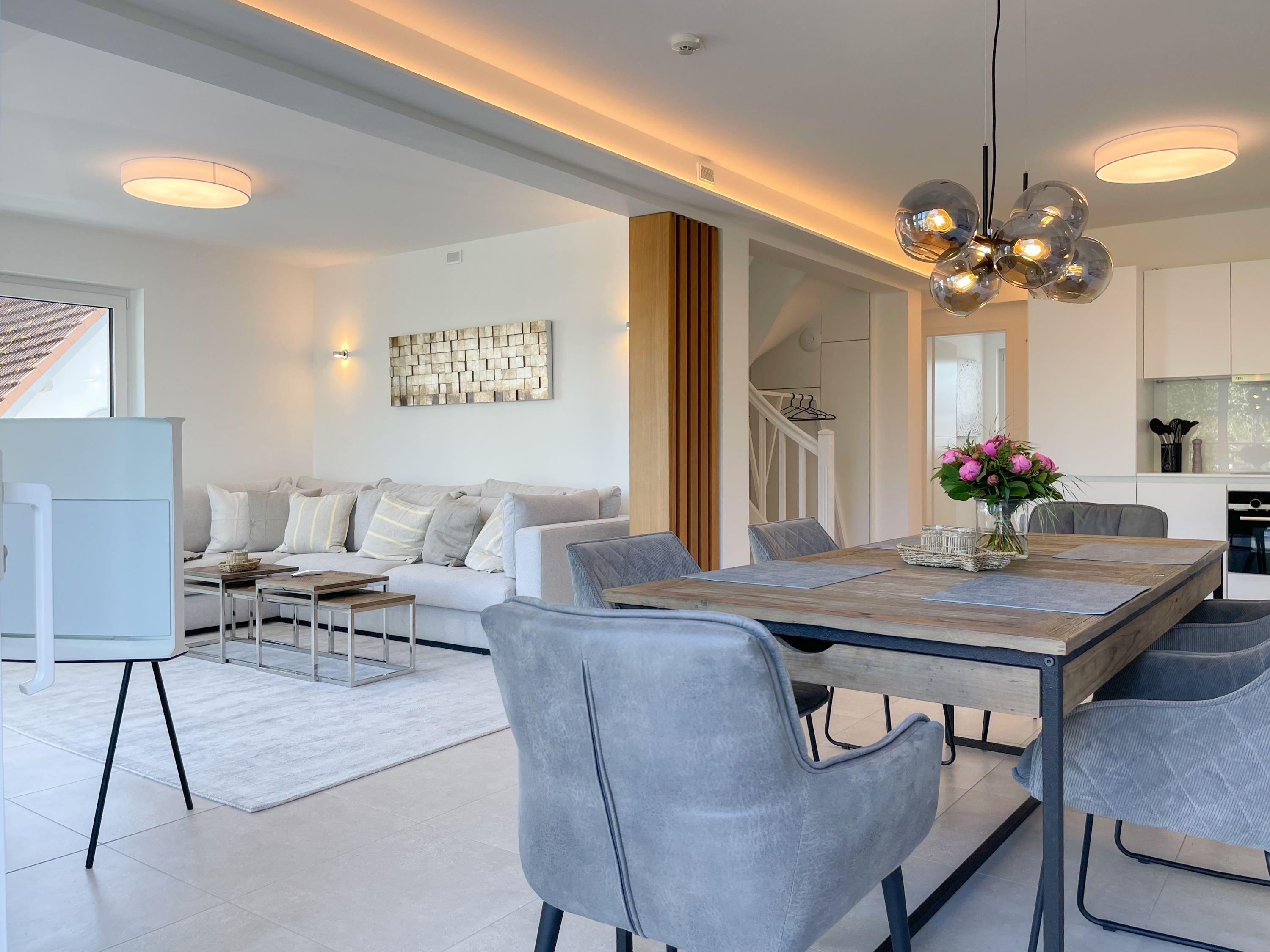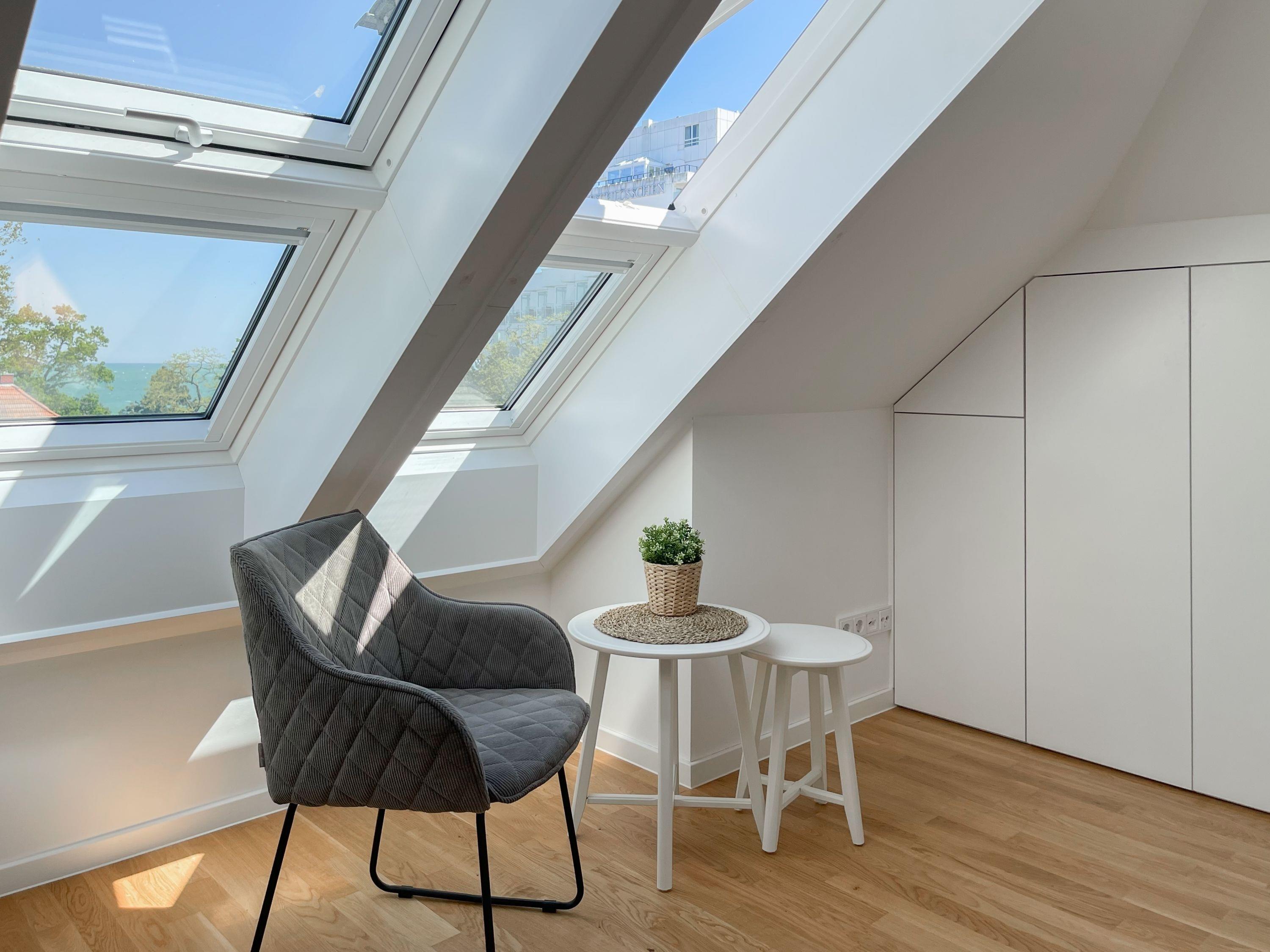 Das traumhafte Penthouse erstreckt sich über zwei großzügige Wohnebenen und bietet herrliche Ausblicke bis auf die Ostsee. Mit drei Schlafzimmern, zwei Bädern und einem separaten Gäste WC, ist es perfekt für sechs Personen geeignet, um einen entspannten Ostseeurlaub in absoluter Strandnähe zu verleben. Die[nbsp] geschmackvolle Einrichtung und hochwertige Ausstattung sorgt für höchsten Wohnstandard in bester Lage. Unten erwartet Sie ein lichtdurchfluteter Wohnbereich mit einem XL-Sofa; TV, Radio und WLAN sind selbstverständlich vorhanden. Die umlaufende Dachterrasse in Richtung Ost und Süd lockt mit traumhaftem Blick und frischer Seeluft ins Freie. Der großzügige Essbereich bietet ausreichend Raum für gemeinsame Mahlzeiten, Spieleabende oder gemütliches Beisammensein. Küche, Gäste WC und Bad 1 mit großer Walk In Dusche, Badewanne, Waschtisch[nbsp] Handtuchtrockner und Fenster befinden sich ebenfalls auf der unteren Wohnebene. Die Infrarotsauna, hervorragende Wirkung gegen Verspannungen und zur Entschlackung, befindet sich in einem hellen, abgeschlossen Raum, der über das Bad 1 zu erreichen ist. Auf der oberen Wohnebene gibt es drei Schlafzimmer, alle mit Boxspringbetten, Einbauschränken, Verdunkelungsplisses und TV eingerichtet sowie das 2. Bad, ebenfalls mit Walk In Dusche, Waschtisch und WC. In einem Schlafzimmer befindet sich zusätzlich ein Schreibtisch für das Homeoffice mit herrlichem Ostseeblick.