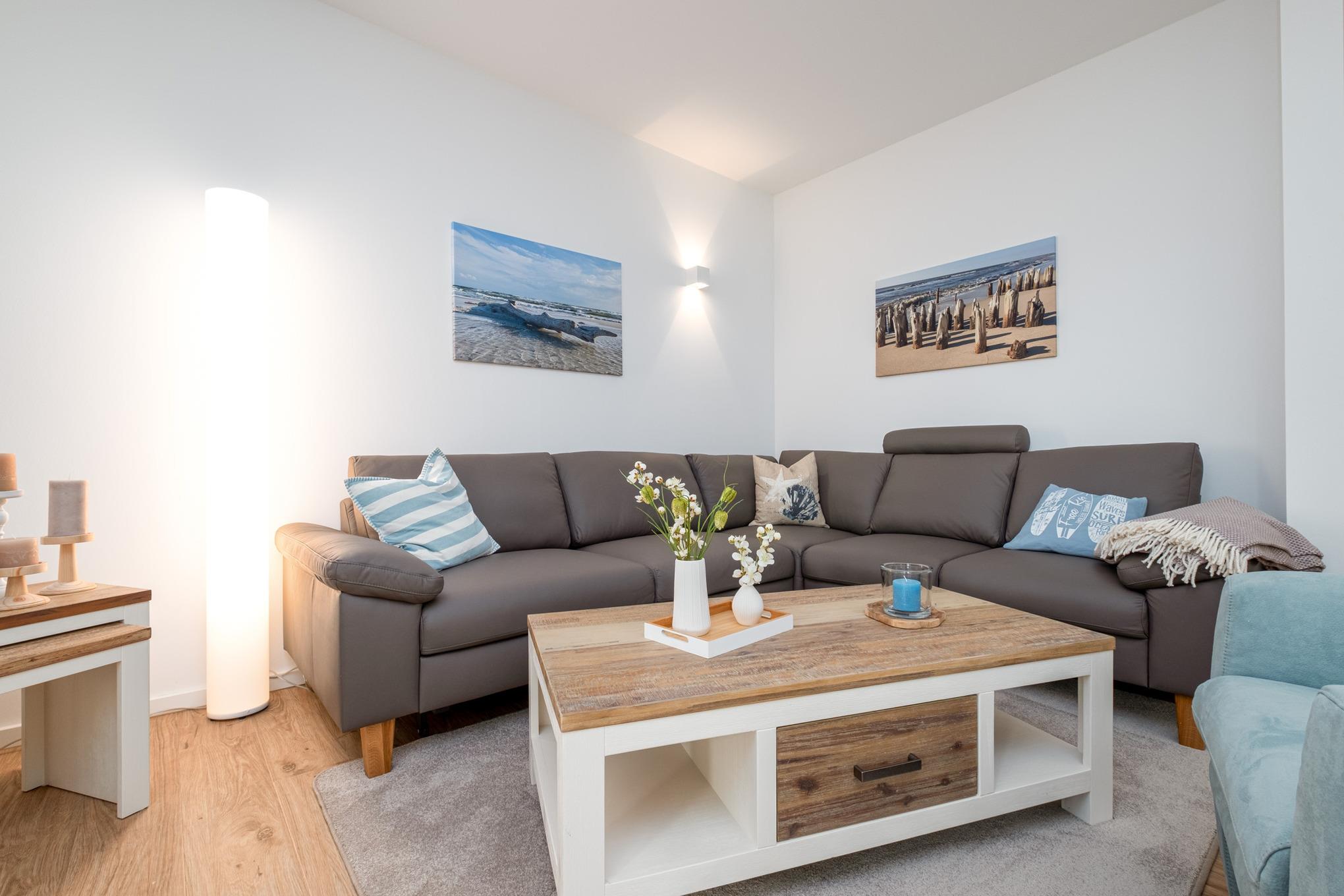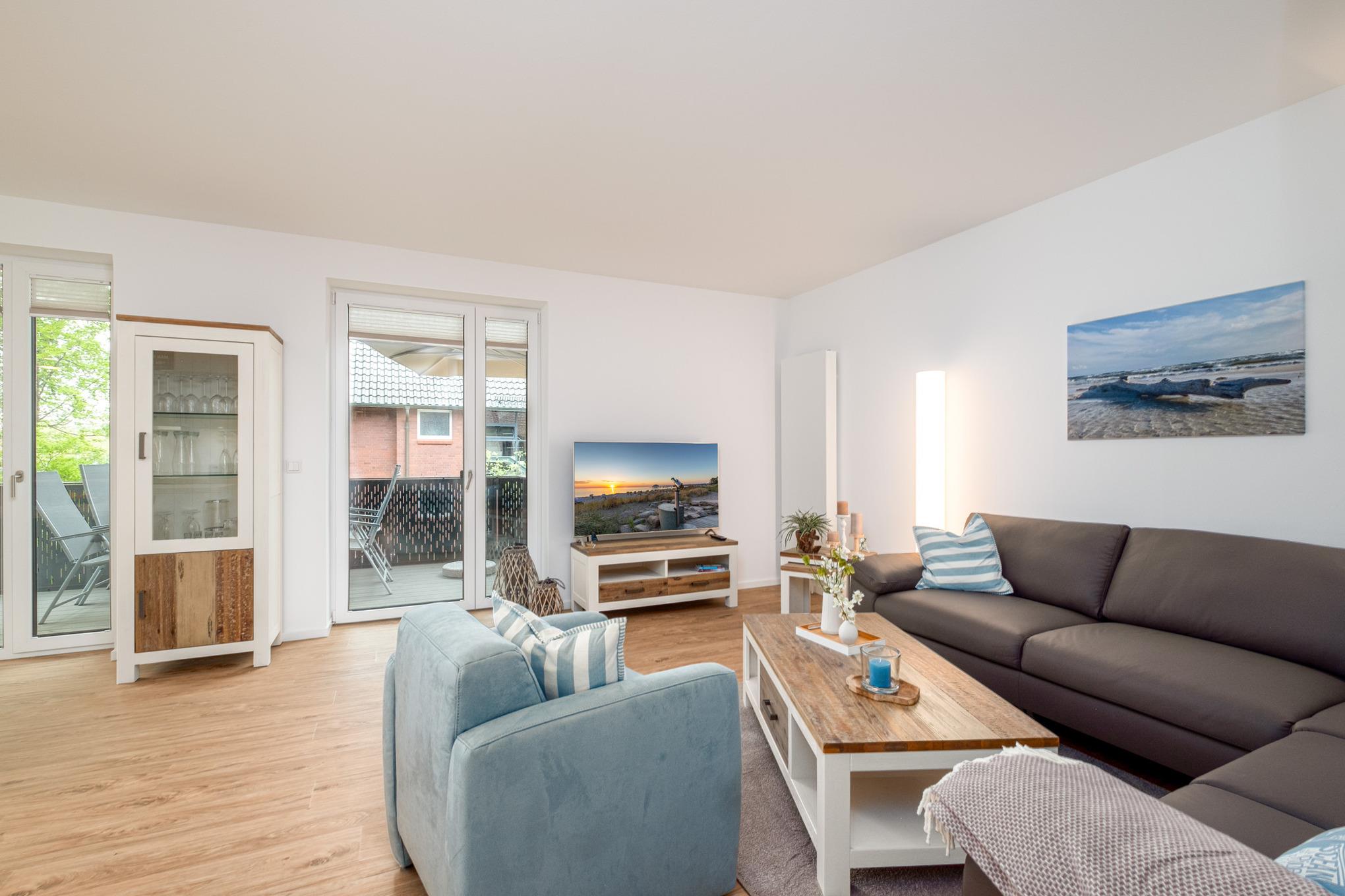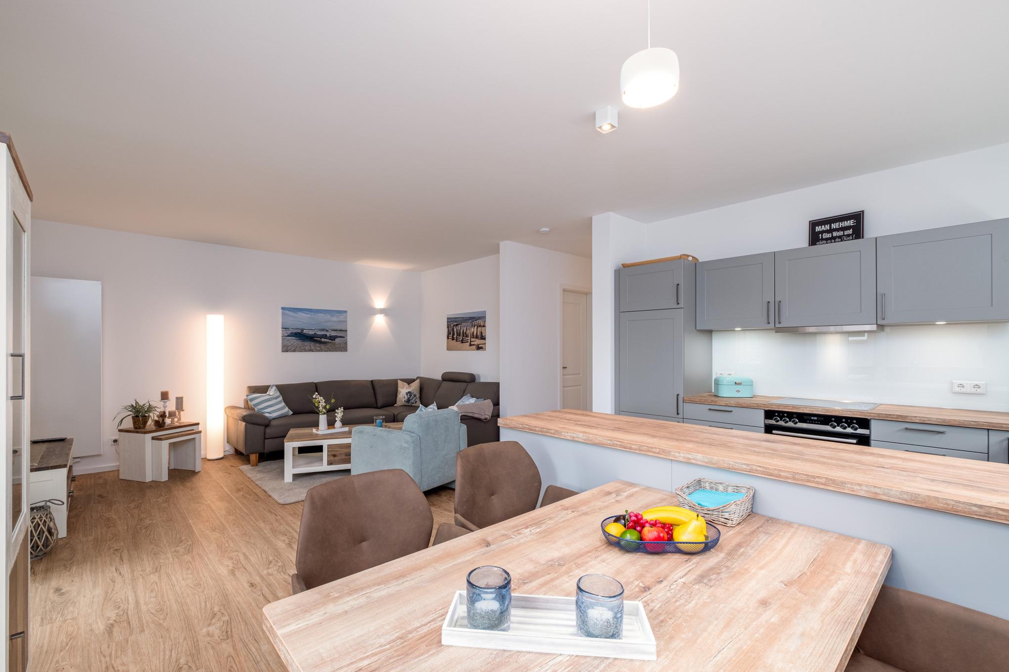 Die Ferienunterkunft verfügt über einen offen gestalteten Wohn-Essbereich mit angrenzender, offener Küche. Das direkt angrenzende und ebenfalls offene Wohnzimmer ist mit einer hochwertigen Couchgarnitur sowie Sitzgruppe ausgestattet und verfügt zudem über einen Flatscreen-TV mit Smartfunktion. Darüber hinaus steht Ihnen eine Musikanlage für CD, Internetradio, Streamingdienste und Bluetooth zur Verfügung. Des Weiteren wird Ihnen das Sky-Komplett-Paket kostenfrei zur Verfügung gestellt mit dem Sie u.a. Bundesliga schauen können.