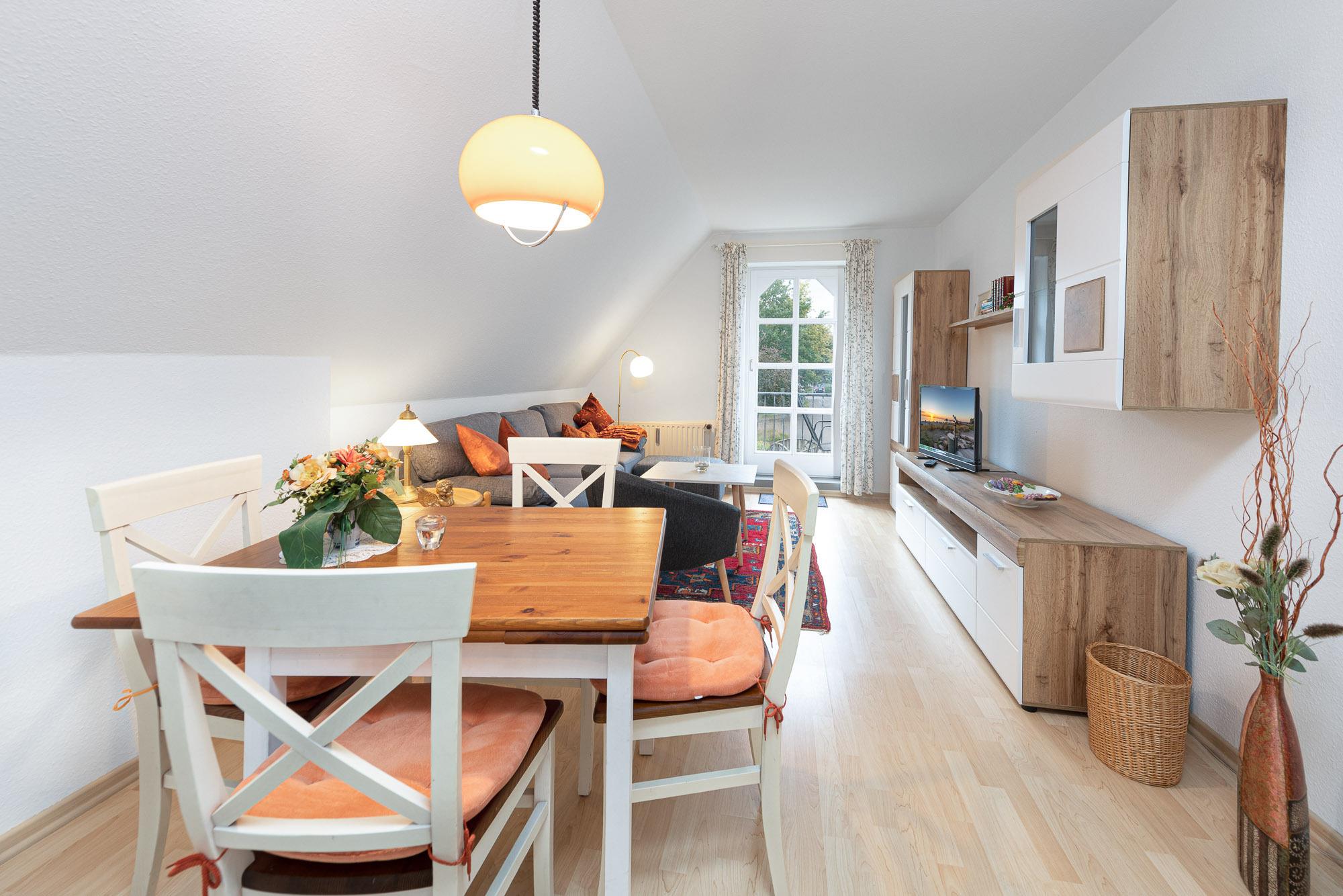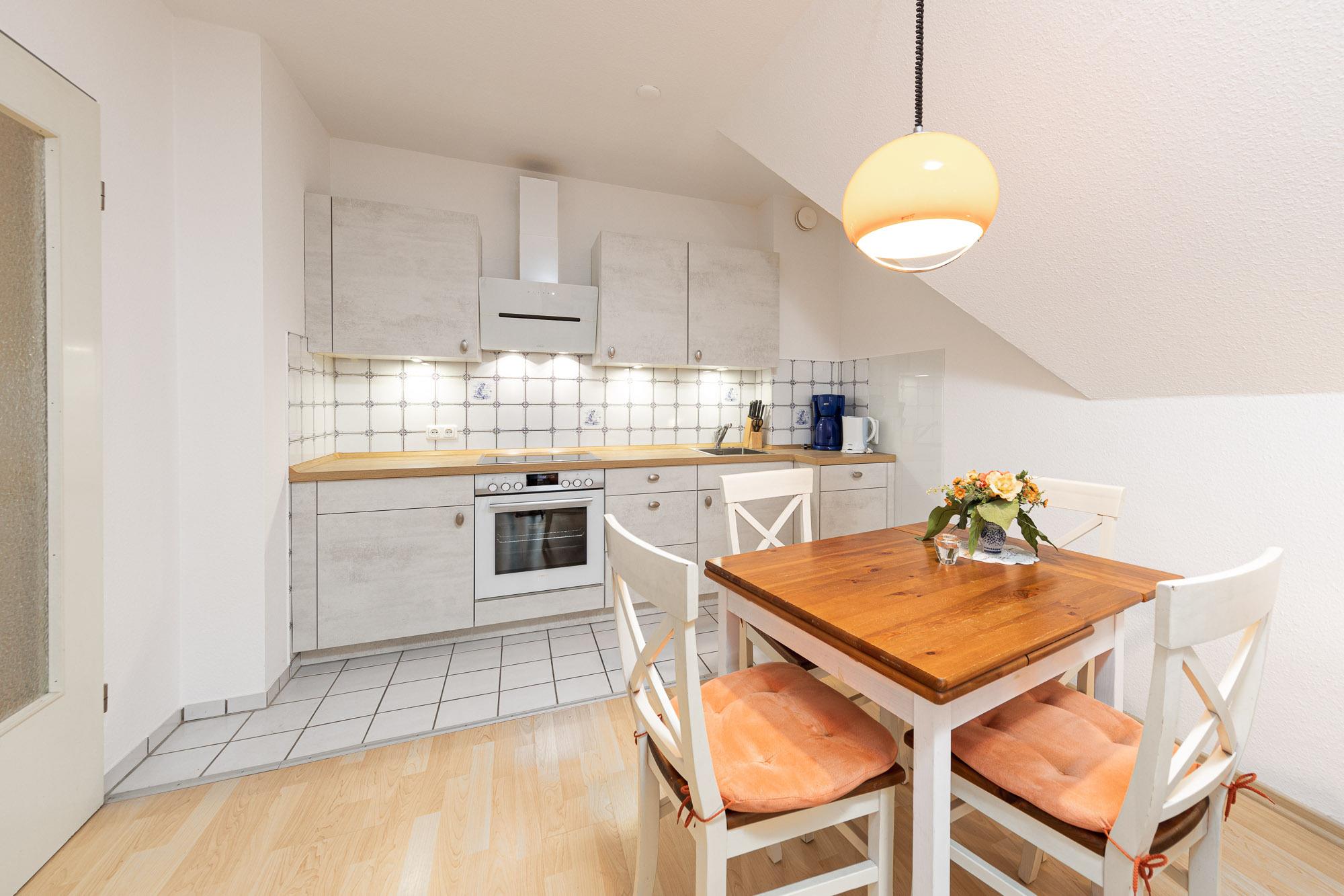 Den Mittelpunkt der Ferienunterkunft bildet das gemütliche und schick eingerichtete Wohnzimmer mit Couch, Flachbild-TV und angrenzendem Essbereich. Die offene Küche ist unter anderem mit Ceranfeld, Backofen, Kühlschrank mit Gefrierfach und Geschirrspüler ausgestattet.