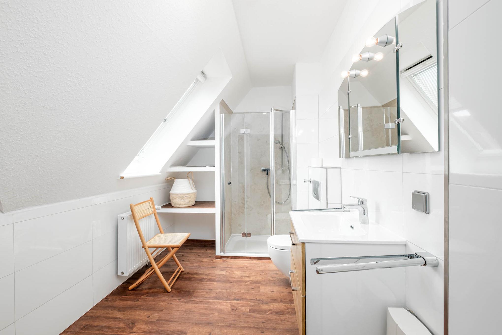 Darüber hinaus erwartet Sie in diesem Appartement ein Badezimmer mit Dusche und WC.