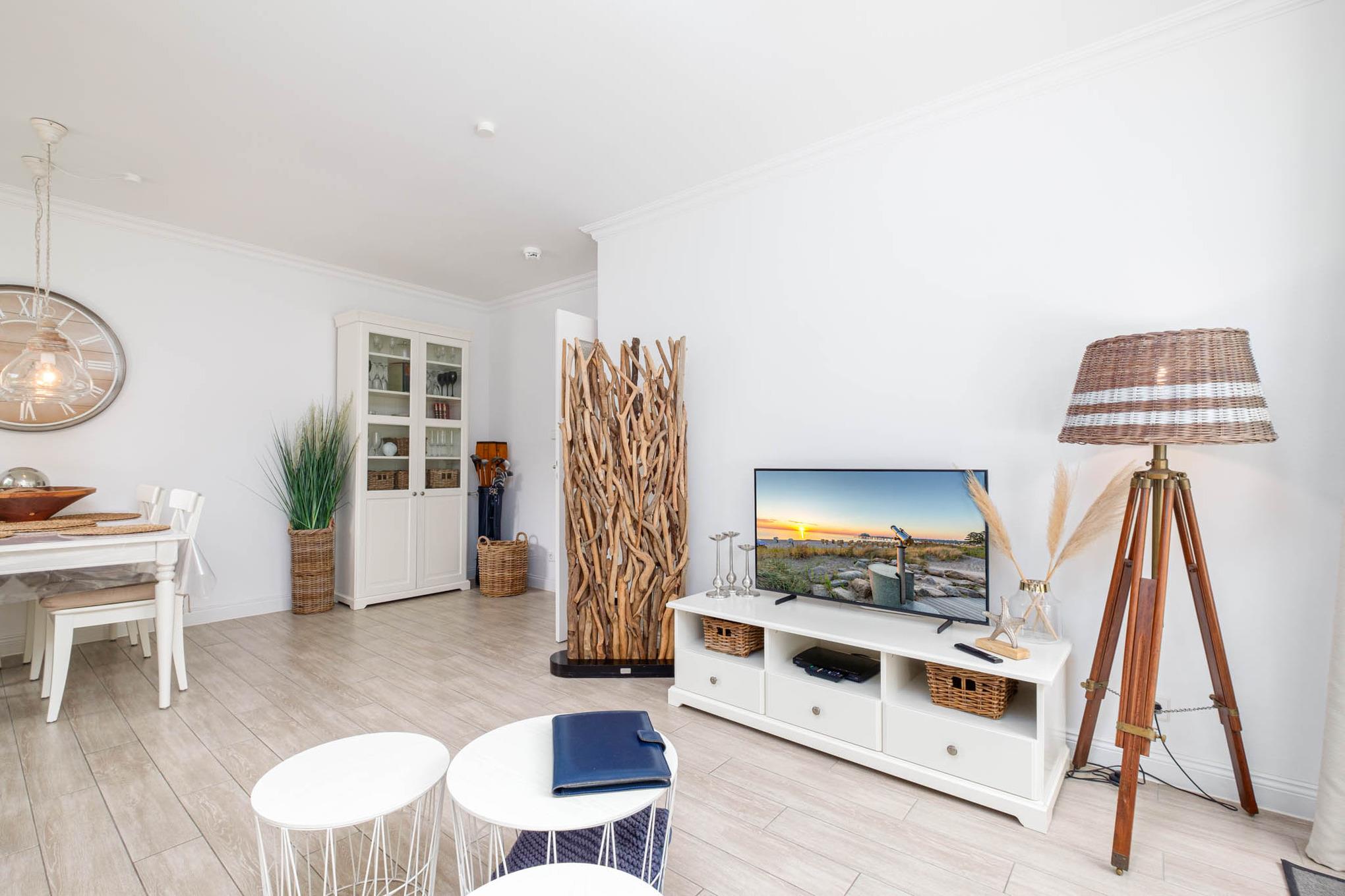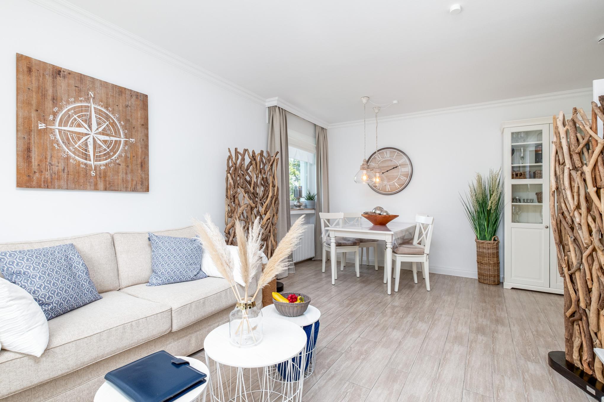 Das Appartement Beachlife befindet sich mit der 3. Etage auf der obersten Etage des Hauses. Diese erreichen Sie sowohl über eine Treppe als auch per Fahrstuhl. Es bieten sich Ihnen ein lichtdurchfluteter Wohnbereich mit gemütlicher Schlafcouch, einem Flatscreen-TV und einem hellen Essbereich.