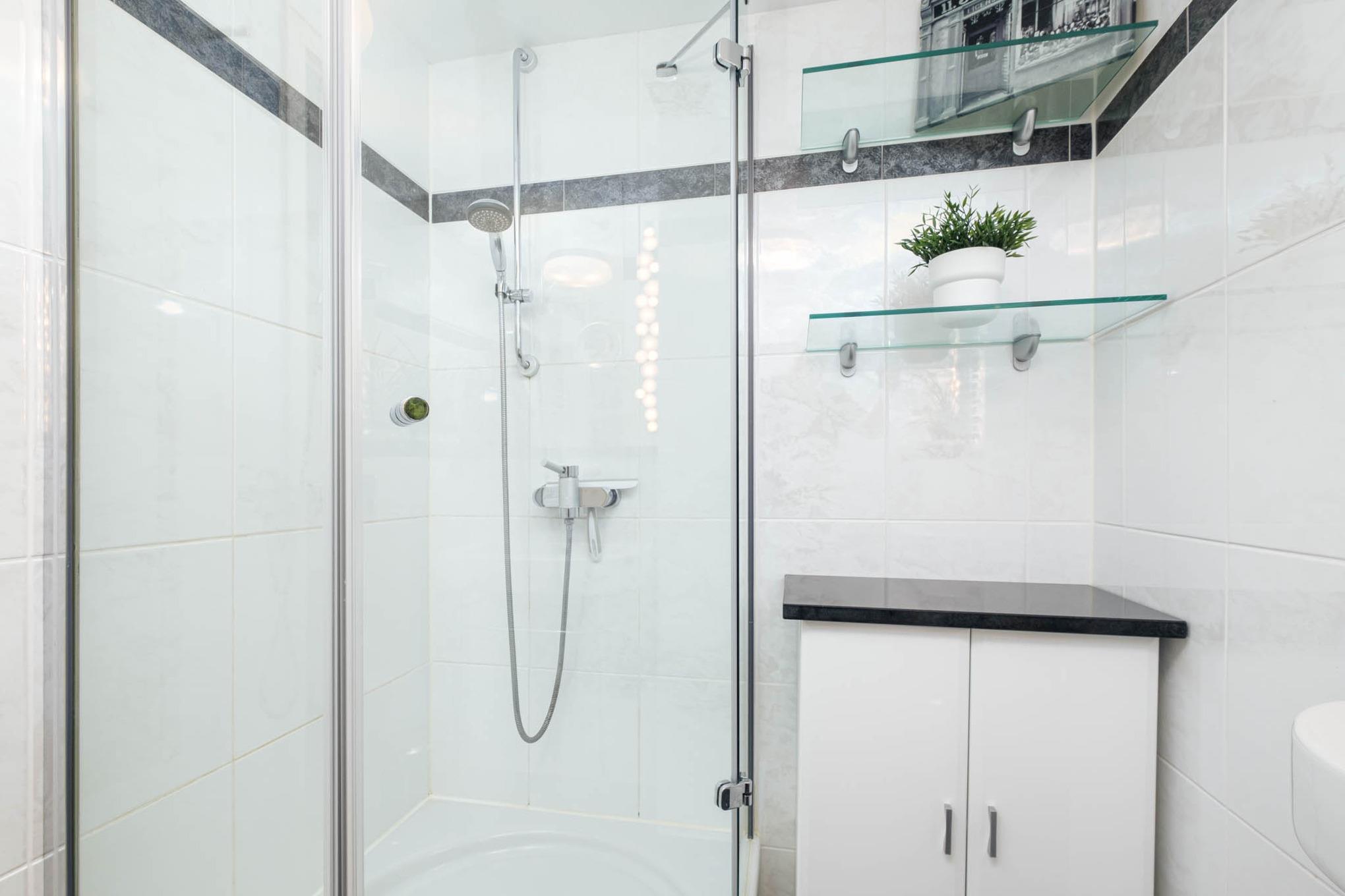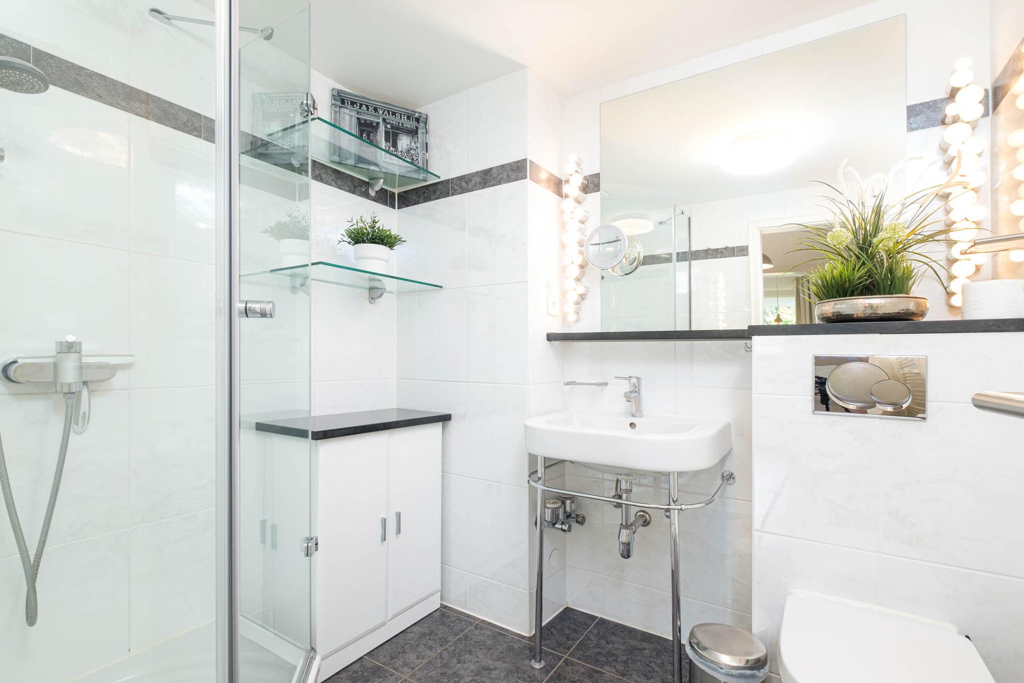Das moderne Badezimmer ist mit einer Dusche ausgestattet und mit viel Liebe zum Detail dekoriert.