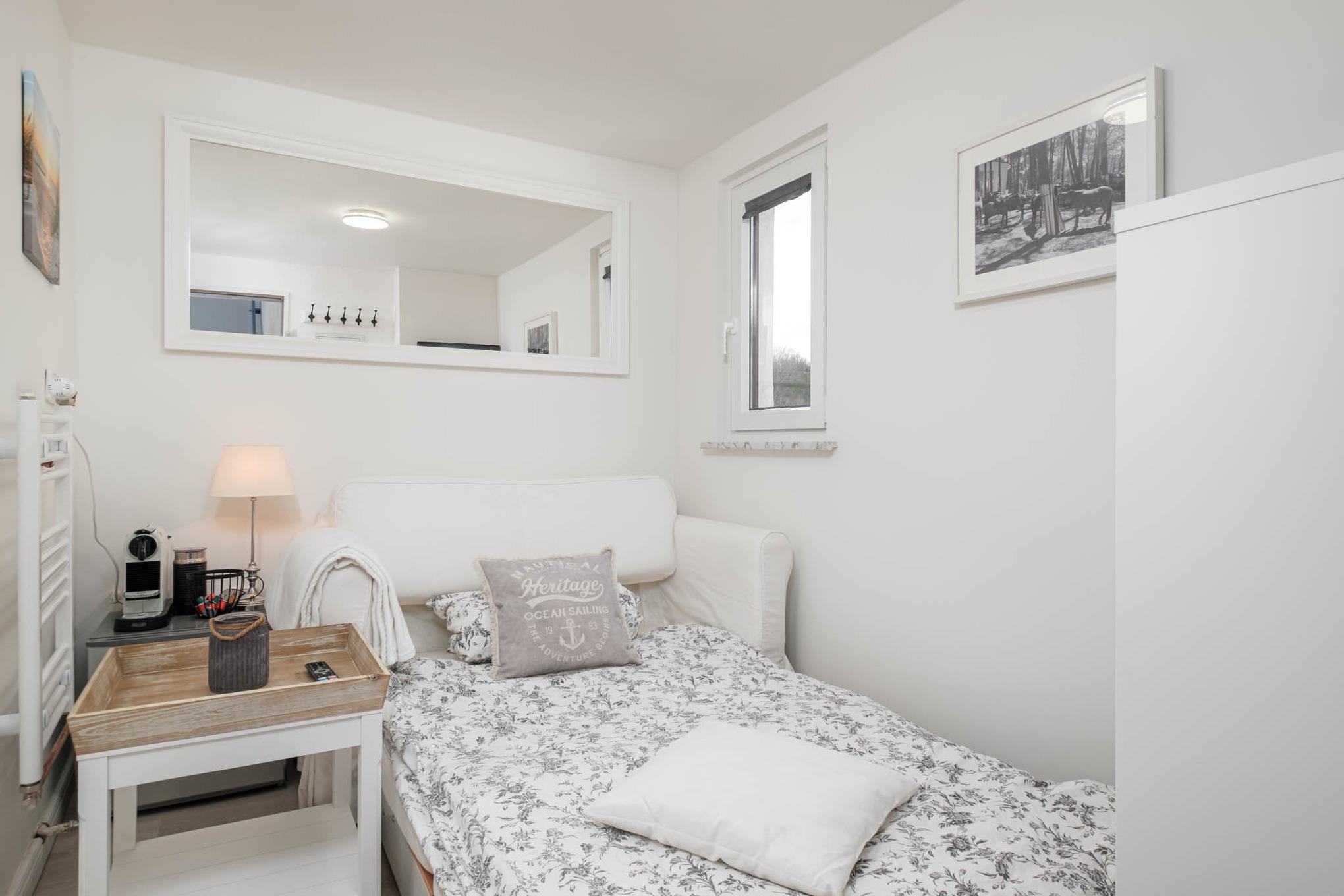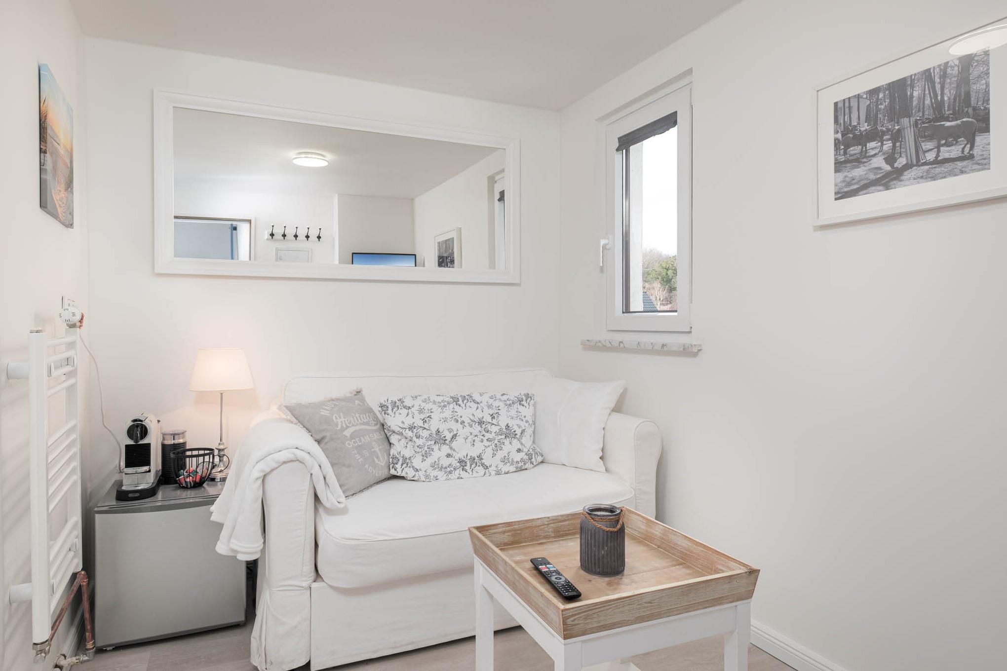Im offenen Wohn-Schlafbereich erwarten Sie eine gemütliche Couchgarnitur, die tagsüber zum Entspannen und TV mit Fernsehen über MagentaTV schauen einlädt. Ein Regal zum Verstauen von Kleinigkeiten sowie ein kleiner Kühlschrank und eine Nespresso-Kaffeekapselmaschine erwarten Sie ebenso.