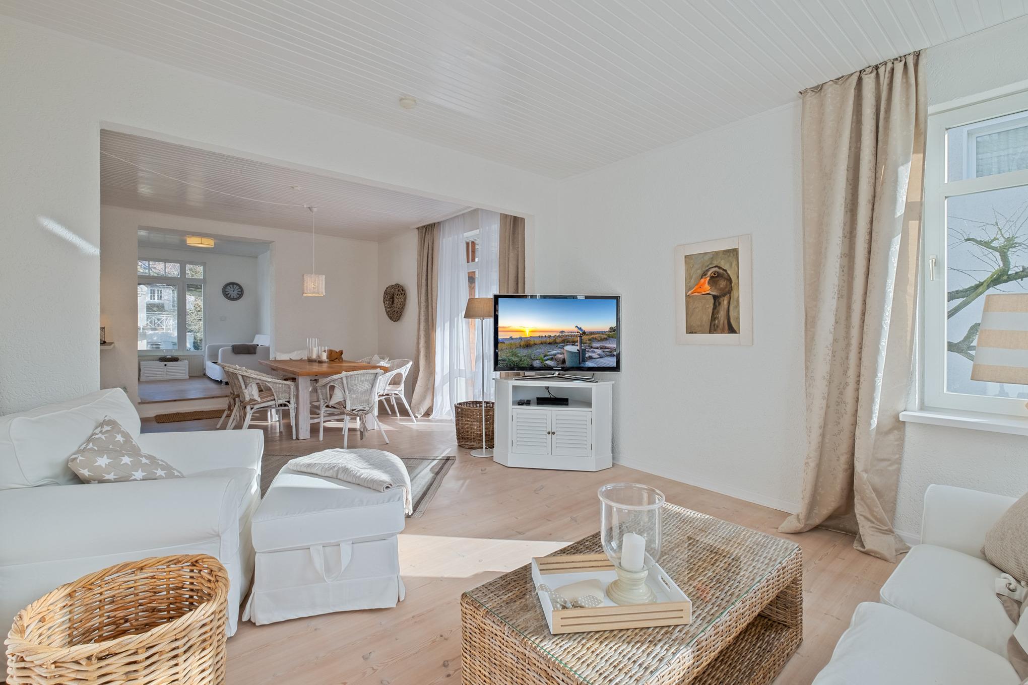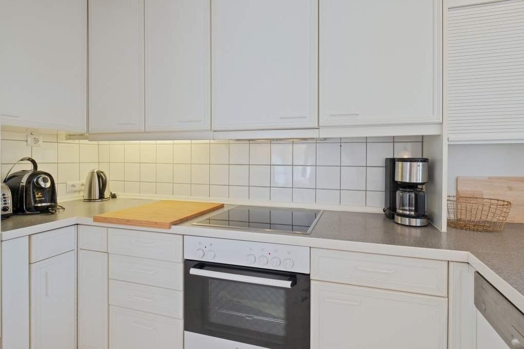Der Wohnbereich ist sehr offen gestaltet und geht harmonisch ineinander über. Hier erwartet Sie ein geschmackvolles Wohnzimmer mit komfortabler Couchgarnitur und Flatscreen-TV. Direkt angrenzend befindet sich der gemütliche Essbereich mit Übergang in die offene Küche. Diese ist modern und unter anderem mit Cafissimo-Kaffeekapselmaschine, Kaffeefiltermaschine, Ceranfeld, Backofen, Geschirrspüler ausgestattet.