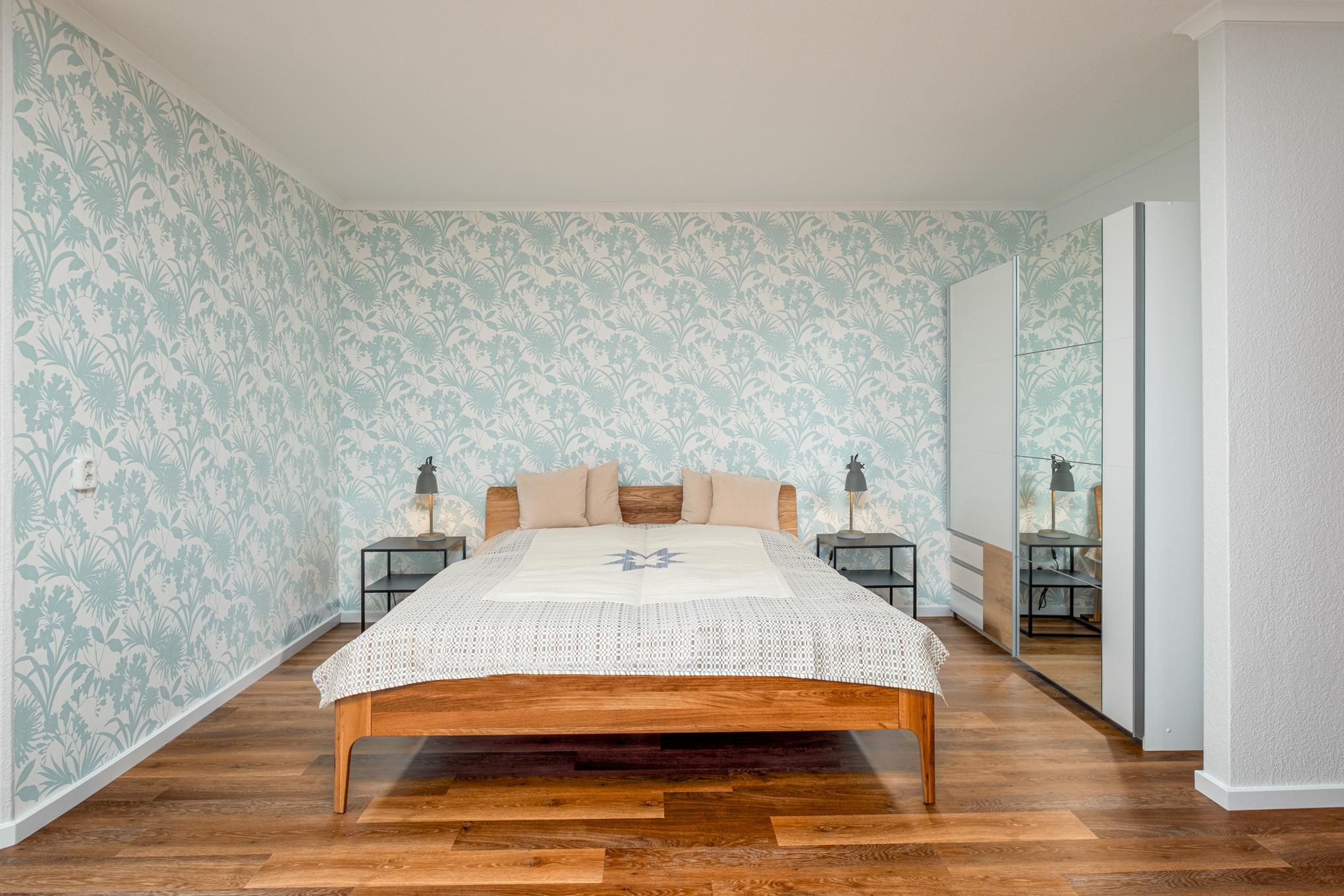 Die Schlafnische im Wohnbereich ist mit einem Doppelbett (180x200cm) und einem geräumigen Kleiderschrank möbliert.